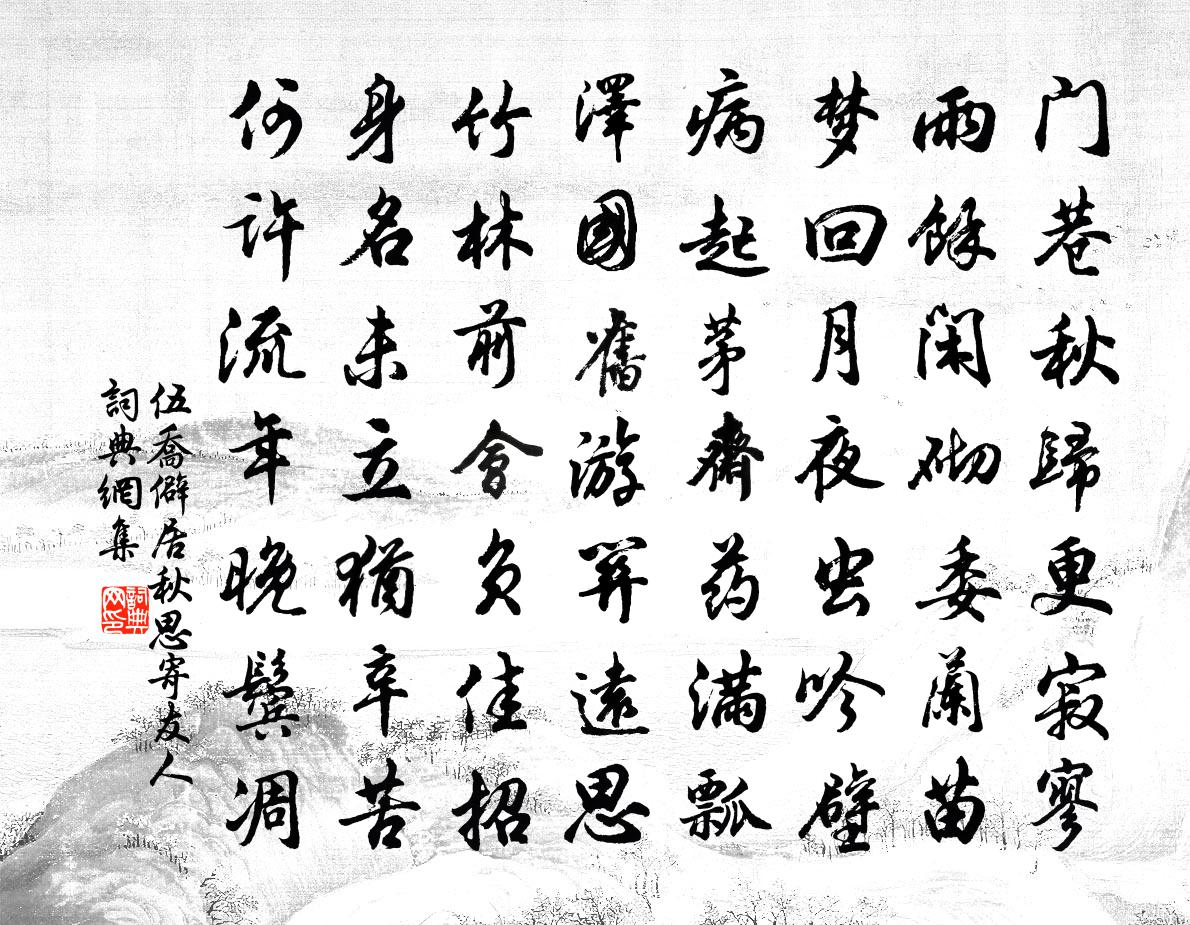 詩詞名句歷史字典書法欣賞書法字典國語詞典說文解字康熙字典古漢語字典標 題 作 者 詩 句 僻居秋思寄友人作者:伍喬 朝代:唐代僻居秋思寄友人原文門巷秋歸更寂寥,雨餘閒砌委蘭苗。夢回月夜蟲吟壁,病起茅齋藥滿瓢。澤國舊遊關遠思,竹林前會負佳招。身名未立猶辛苦,何許流年晚鬢凋。詩詞問答問:僻居秋思寄友人的作者是誰?答:伍喬問:僻居秋思寄友人寫於哪個朝代?答:唐代伍喬僻居秋思寄友人書法欣賞僻居秋思寄友人書法作品詩詞推薦由下梅至資福估賣官產喻良能〔宋代〕曉發下梅寺,霽色浮壠麥。崎嶇白楊岸,詰屈黃牛軛。野芳吐丰茸,山羽鳴格磔。驅車復前途,聊欲遍阡陌。暢伯圭父子下第歸鄉攜嗣由廣文書並手佳章寵度正〔宋代〕先正傳家逮泗濱,一言一論本諸身。是間極力窺真際,物外何心逐像人。臨江仙歐陽辟〔宋代〕澗碧山紅粉爛漫,煙蘿遠映霜楓。倚闌人在暮雲東。遙天垂眾壑,平地起孤峰。大好家山重九日,尊前切莫匆匆。李濠州輓詞二首黃庭堅〔宋代〕禮數最優徐孺子,風流不減謝宣城。那知此別成千古,未信斯言隔九京。落日松楸陰隧道,西風簫鼓送銘旌。善人再至淮南曹彥約〔宋代〕湓浦經從後,淮壖欲到時。江山春自改,風雨日相隨。泥滑禽猶訴,崖懸馬欲疑。解鞍聊間息,造物本無私。鷓鴣天晏幾道〔宋代〕九日悲秋不到心。鳳城歌管有新音。風凋碧柳愁眉淡,露染黃花笑靨深。初見雁,已聞砧。綺羅叢里勝登臨。須教重遊能仁寺董嗣杲〔宋代〕古寺踞城為甲剎,巍峨殿閣矗江雲。香菸昏壁沿廊黑,磚塔喧鈴徹郡聞。白日僧歸春更靜,清明鬼哭夜初分。住持踏莎行譚處端〔元代〕既得修真,須搜玄理。心中事事都忘棄。因師妙旨悟元初,山頭一點光明起。落魄生涯,水雲活計。遨遊坦蕩紅塵次適安感古二首胡仲弓〔宋代〕少陵合與古詩班,不是詩家持論寬。風雅近來隨世變,詩無可采不須官。和璧書記釋鹹傑〔宋代〕擲劍揮空不住空,空輪無跡劍無鋒。無鋒無跡憑誰會,會得金沙墮眼中。王璠伯玉攜詩見過二首趙蕃〔宋代〕大熱有如此,涼風安在哉。書憑長日度,客欠好懷開。豹立妨看竹,蟾飛為掃槐。欣然王氏子,枉步袖詩來。送琴師毛敏仲北行汪元量〔宋代〕五里十里亭長短,千帆萬帆船去來。請君收淚向前去,要看幽州金築台。山行寄程帥陳造〔宋代〕雨餘支徑濕平沙,恰稱卑官下澤車。雜樹暝煙森立槊,亂峰迎客儼排衙。水禽時弄蹁躚影,野草爭開細碎花。久憶偈頌六十七首釋原妙〔宋代〕九旬把定重關,今朝放開一線。頂門具眼衲僧,自合知機識變。依舊平分局面。雜詠一百首轅固劉克莊〔宋代〕面折公孫子,堂堂負直聲。安知上前議,那復有黃生。南歌子(次東坡端午韻)楊無咎〔宋代〕小雨疏疏過,長江滾滾流。落霞殘照晚明樓。又是一番重午,身寄南州。羅綺紛香陌,魚龍漾彩舟。不堪回首鳳池茆亭徐夤〔唐代〕鴛瓦虹梁計已疏,織茅編竹稱貧居。剪平恰似山僧笠,掃靜真同道者廬。秋晚捲簾看過雁,月明憑檻數跳魚。重門敝俗宋祁〔宋代〕陶姚民屋富,梁魏敝風存。士闕游鄉校,人爭倚市門。椎埋時結客,博掩競成喧。誰與遷荼堇,移甘朊朊原。懷華頂道人齊己〔唐代〕華頂星邊出,真宜上士家。無人觸床榻,滿屋貯煙霞。坐臥臨天井,晴明見海涯。禪余石橋去,屐齒印松花。水旱禱蘇拯〔唐代〕禱祈勿告天,酒漿勿澆地。陰陽和也無妖氣,陰陽愆期乃人致。病生心腹不自醫,古屋澄潭何神祟。名句推薦楊柳千條送馬蹄,北來征雁舊南飛。納蘭性德《浣溪沙·楊柳千條送馬蹄》 手紅冰碗藕,藕碗冰紅手。蘇軾《菩薩蠻·回文夏閨怨》 長堤春水綠悠悠,畎入漳河一道流。王之渙《宴詞》 貧而無諂,富而無驕孔子弟子《論語·學而篇》 不覺碧山暮,秋雲暗幾重。李白《聽蜀僧濬彈琴 / 聽蜀僧浚彈琴》 大仇必去,小人勿輕,禍不可伏。來俊臣《羅織經·固榮卷第六》 父兮生我,母兮鞠我。佚名《蓼莪》 一切都是命,半點不由人。佚名《增廣賢文·上集》 山夾水,澗。陵夾水,澞。山有穴為岫。佚名《爾雅·釋山》 笑綠鬟鄰女,倚窗猶唱,夕陽西下。蔣捷《女冠子·元夕》