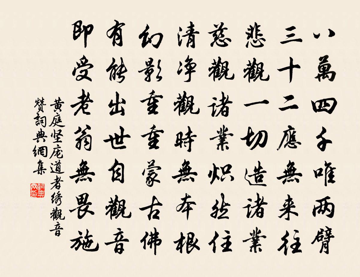 詩詞名句歷史字典書法欣賞書法字典國語詞典說文解字康熙字典古漢語字典標 題 作 者 詩 句 龐道者繡觀音贊作者:黃庭堅 朝代:宋代龐道者繡觀音贊原文八萬四千唯兩臂,三十二應無來往。悲觀一切造諸業,慈觀諸業熾然住。清淨觀時無本根,幻影重重蒙古佛。有能出世自觀音,即受老翁無畏施。詩詞問答問:龐道者繡觀音贊的作者是誰?答:黃庭堅問:龐道者繡觀音贊寫於哪個朝代?答:宋代問:黃庭堅的名句有哪些?答:黃庭堅名句大全黃庭堅龐道者繡觀音贊書法欣賞龐道者繡觀音贊書法作品詩詞推薦人月圓趙雍〔元代〕相思何日重相見,山遠水偏長。鳳弦雖斷,鸞膠難接,愁滿離腸。最傷情處,鮫綃遺恨,翠靨留香。故人何在,濃旱後喜雨四首楊萬里〔宋代〕檢校西疇首忍回,雨佳小恨較遲來。抄雲浙玊何曾夢,只擬禾孫作棧粥。幽人杜甫〔唐代〕孤雲亦群游,神物有所歸。麟鳳在赤霄,何當一來儀。往與惠荀輩,中年滄洲期。天高無訊息,棄我忽若遺。內懼和余時中元夕二首王之道〔宋代〕羅綺行歌夜,杯盤坐笑春。舞衫催急管,步障擁佳人。燈火珠星粲,樓台璧月新。傳柑良可樂,黼座玉音親。自到潯陽生三女子因詮真理用遣妄懷白居易〔唐代〕宦途本自安身拙,世累由來向老多。遠謫四年徒已矣,晚生三女擬如何?預愁嫁娶真成患,細念因緣儘是魔。賴學送徐道暉游湘水趙師秀〔宋代〕春盡雨霏霏,春寒猶在衣。人尋香草去,雁背遠峰歸。瀟水添湘闊,唐碑入宋稀。應知名與姓,題寫遍岩扉。立春日雪和趙端質韻王之道〔宋代〕春寒有信不逾期,肯為衰顏獨見欺。白雪已輸梅斗早,綠樽尤與火相宜。擷來野蔌和萱草,分得江魚貫柳枝。刺史重修香山寺畢,題二十二韻以紀之白居易〔唐代〕闕塞龍門口,祇園鷲嶺頭。曾隨減劫壞,今遇勝緣修。再瑩新金剎,重裝舊石樓。病僧皆引起,忙客亦淹留。四望美人蘇泂〔宋代〕美人隔秋水,別我今何時。晨興念良覿,路遠莫致之。安得雙翅翰,飛去東南陲。矢心菖蒲花,白首以為期。六代祖師贊釋文禮〔宋代〕黃梅再來,青松依舊。前身後身,一場逗漏。七百高僧總作家,唯有南能不唧{左口右留}。送蘇伯益提乾代還侍下曾幾〔宋代〕幕下官曹寄玉溪,溪邊野老借光輝。齧氈校尉沖寒去,扇枕郎君觸熱歸。大父正攜靈壽杖,尊公更著老萊衣。贈行潭州詩二首譚申〔宋代〕湘南湘北水悠悠,佳處中間冠十州。楚客離騷收不盡,唐人題跋尚分流。我來江上重尋日,景入詩中為點頭。竹枝詞蘇軾〔宋代〕自過鬼門關外天,命同人鮓瓮頭船。北人墮淚南人笑,青嶂無梯聞杜鵑。夜直玉堂讀王仲行正字文編用入館新詩韻周必大〔宋代〕軼材騰驥騄,涌思決河渠。枝茂根先實,名高士豈虛。君王憐舊土,館殿有新除。努力功名會,燕然欠大書。水龍吟 酹辛稼軒墓,在分水領下張野〔元代〕嶺頭遊戲一片青山遊戲,可能埋遊戲得凌雲氣。遐方異域,當年滴盡,英雄清淚。星斗撐腸,雲煙盈紙,縱橫遊戲和林和靖先生梅韻胡銓〔宋代〕一年佳處早梅時,鉤引清風巧釣詩。未分霜冷禁瘦朵,漸看春入奈愁枝。晚尤奇特憐無伴,夜更分明不可私。冷落句孫僅〔宋代〕巴陵山水冠南中。雁字陳元晉〔宋代〕超然聖處過張顛,整整斜斜落照邊。好寫人間不平事,叫開閶闔為箋天。送趙至道節推樓鑰〔宋代〕君來入幕恰三年,我幸投閒識此賢。婉畫時時因事見,素風凜凜信家傳。易林律本君須寄,月窟天根語未圓。問訊浣溪沙(雙筍)張炎〔宋代〕空色莊嚴玉版師。老斑遮護錦繃兒。只愁一夜被風吹。潤處似沾篔穀雨,斫來如帶渭川泥。從空托出鎮帷犀。名句推薦上言加餐食,下言長相憶。佚名《飲馬長城窟行》 非懷北歸興,何用勝羈愁韓愈《洞庭湖阻風贈張十一署·時自陽山徙掾江陵》 臨砌影,寒香亂、凍梅藏韻。吳文英《花犯·郭希道送水仙索賦》 天下三分明月夜,二分無賴是揚州。徐凝《憶揚州》 五更櫪馬靜無聲。鄰雞猶怕驚。吳文英《醉桃源·元日》 歲寒,然後知松柏之後凋也。孔子弟子《論語·子罕篇》 枕前淚共階前雨,隔個窗兒滴到明。聶勝瓊《鷓鴣天·別情》 髻子傷春慵更梳。晚風庭院落梅初。李清照《浣溪沙·髻子傷春慵更梳》 歌舞尊前,繁華鏡里,暗換青青發。薩都剌《念奴嬌·登石頭城次東坡韻》 綠葉素榮,紛其可喜兮。屈原《九章》