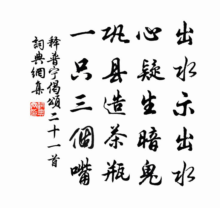 詩詞名句歷史字典書法欣賞書法字典國語詞典說文解字康熙字典古漢語字典標 題 作 者 詩 句 偈頌二十一首作者:釋普寧 朝代:宋代偈頌二十一首原文出水示出水,心疑生暗鬼。鞏縣造茶瓶,一隻三個嘴。詩詞問答問:偈頌二十一首的作者是誰?答:釋普寧問:偈頌二十一首寫於哪個朝代?答:宋代釋普寧偈頌二十一首書法欣賞偈頌二十一首書法作品詩詞推薦頌古二十四首釋勝〔宋代〕有喝端如探竿草,無師血脈通紅線。當陽不識李將軍,徒學穿楊一枝箭。山中遇雨李彌遜〔宋代〕卯酒催歸夢,僧房借枕頭。客愁三日雨,山意十分秋。鳴澗漲還落,凝雲去復留。陽烏肯回翼,高處卜深游。自嘲解嘲陸游〔宋代〕世變真難料,吾痴只自嘲。移山謀畚土,黏日欲煎膠。得句題修竹,烹茶拾墮巢。行年不須算,斷是死衡茆。次韻周子問相勉求官詩項安世〔宋代〕我纓卻要滄浪情,我足但可雲門行。頭顱四十中底用,阿婆縱好難為新。強塗粉筆老自愧,旋學鬢鬟梳不成。憶初新茶詠寄上西川相公二十三舅大夫二十舅盧綸〔唐代〕三獻蓬萊始一嘗,日調金鼎閱芳香。貯之玉合才半餅,寄與阿連題數行。白艾原客方乾〔唐代〕原上桑柘瘦,再來還見貧。滄州幾年隱,白髮一莖新。敗葉平空塹,殘陽滿近鄰。閒言說知己,半是學禪人。送舍弟正臣赴都梅堯臣〔宋代〕吳兒能刺舟,其駛劇飛鳥。行行固莫留,望進前山小。家貧吾不憂,身計爾自了。何當還里門,拜慶期秋杪。還過郢城項安世〔宋代〕頭白初行郢水邊,故城千載尚依然。豈無戌卒持鉦鼓,應有居人沸管弦。今日桑麻成沃野,幾家茅竹散平川。停車賀新郎(贈建康鄭玉脫籍)劉仙倫〔宋代〕鄭玉非娼女。嘆塵緣未了,飄零被春留住。腸斷胭脂坡下路。成甚心情意緒。生怕入、梨園歌舞。寂寞陽台雲雨散送僧歸遂州秦觀〔宋代〕寶師本巴蜀,浪跡游淮海。定水湛虛明,戒珠炯圓彩。飄零鄉縣異,晼晚星霜改。明發又西征,孤帆破煙靄。臨洛水李世民〔唐代〕春蒐馳駿骨,總轡俯長河。霞處流縈錦,風前漾卷羅。水花翻照樹,堤蘭倒插波。豈必汾陰曲,秋雲發棹歌。和劉後村梅花百詠方蒙仲〔宋代〕惆悵庭前三樹株,十年依舊一錐無。從今只作梅生活,底用江頭千木奴。偈頌一百四十一首釋師範〔宋代〕阿刺刺,橫該抹。天何高,地何闊。碧眼與黃頭,徒自鬧聒聒。育王恁麽道,也是將鹽止渴。次韻王適食茅栗蘇轍〔宋代〕相從萬里試南餐,對案長思苜蓿盤。山栗滿籃兼白黑,村醪入口半甜酸。久聞牛尾何曾試,竊比雞頭意未安。故國哭薛子舒二首劉克莊〔宋代〕忍死教磨墨,留書訣父兄。讀來堪下淚,寄去怕傷情。墓要師為志,詩於世有名。夜闌秋枕上,猶夢共山行。古興二首各五韻陸游〔宋代〕草衰何預人,每起徂年悲。日月才幾何,又見青青時。青青雖滿眼,行矣當復衰。盛衰還無端,其理可前知。人生邛州西湖石安期〔宋代〕先生宴坐西湖曲,水上青山削寒玉。日光浮動山影來,釀作一壺春酒綠。賦黃香梅絕句八首正月二十三作時築樓居將就李壁〔宋代〕滿園春物正關情,忽到梅邊肯倍明。別有醉餘霞臉在,大都風格盡飛瓊。贈孫百篇方乾〔唐代〕御題百首思縱橫,半日功夫舉世名。羽翼便從吟處出,珠璣續向筆頭生。莫嫌黃綬官資小,必料青雲道路平。才子題永嘉黃仲炎文卷二首劉克莊〔宋代〕龍泉筆絕文章熄,此作居然可貴珍。激處翻嫌董生緩,新來卻笑退之陳。假令覆瓿無知者,尚可藏山待後人。外物名句推薦手攜稚子夜歸院,月冷空房不見人。白居易《為薛台悼亡》 曉風不散愁千點,宿雨還添淚一痕。曹雪芹《詠白海棠》 遊人記得承平事,暗喜風光似昔年。韋莊《長安清明》 野火燒不盡,春風吹又生。白居易《草 / 賦得古原草送別》 如貧得寶,如暗得燈,如飢得食,如旱得雲。馮夢龍《警世通言·卷九》 瓜熟蒂落,水到渠成。佚名《增廣賢文·下集》 行多有病住無糧,萬里還鄉未到鄉。盧綸《逢病軍人》 語言多矯飾,則人品心術,盡屬可疑。王永彬《圍爐夜話·第四十則》 寧可正而不足,不可邪而有餘。佚名《增廣賢文·上集》 父之讎,弗與共戴天。兄弟之讎不反兵。交遊之讎不同國。戴聖《禮記·曲禮上》