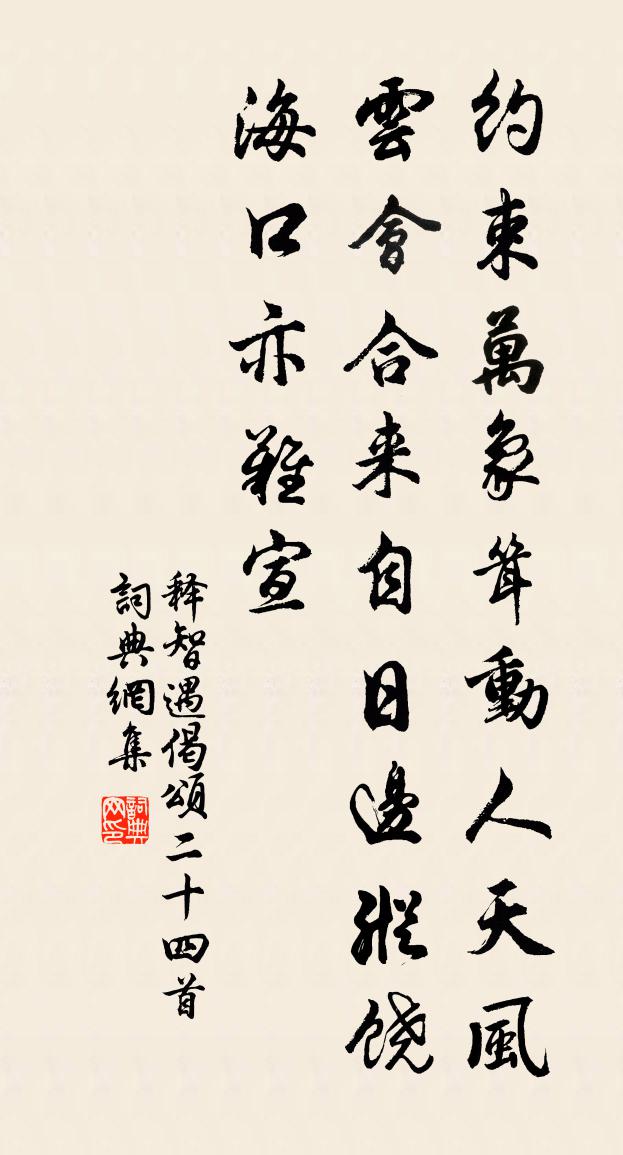 詩詞名句歷史字典書法欣賞書法字典國語詞典說文解字康熙字典古漢語字典標 題 作 者 詩 句 偈頌二十四首作者:釋智遇 朝代:宋代偈頌二十四首原文約束萬象,聳動人天。風雲會合,來自日邊,縱饒海口亦難宣。詩詞問答問:偈頌二十四首的作者是誰?答:釋智遇問:偈頌二十四首寫於哪個朝代?答:宋代釋智遇偈頌二十四首書法欣賞偈頌二十四首書法作品詩詞推薦有所思二首曹勛〔宋代〕有所思兮天一涯,彼美人兮安得知。江皋送日下洲渚,心遙目斷征鴻飛。蘭嗟蕙怨芳草歇,春歸猶見霏霏雪。文姬游昭慶寺張鎡〔宋代〕招提徐步已身輕,禮懺僧忙不出迎。側殿掛燈窺塑像,小廊流水愛經聲。心安久矣空塵想,夢異當年記宿生。目送偈頌十八首釋如淨〔宋代〕當天一句,萬機顯露。衲僧頂戴奉行,鼻孔機先證據。定風波佚名〔宋代〕古鼎龍涎香猶噴。樵人十詠樵叟陸龜蒙〔唐代〕自小即胼胝,至今凋鬢髮。所圖山褐厚,所愛山爐熱。不知冠蓋好,但信煙霞活。富貴如疾顛,吾從老岩穴。馬上讀韓吏部集祖無擇〔宋代〕驅羸{左卷右力}遠征,尺箠亦慵擎。卻得開編看,仍教縱轡行,儒推文暢行,詩許孟郊鳴。盡日耽遺味,渾如挹萬州下岩二首黃庭堅〔宋代〕空岩靜發鐘磬響,古木倒掛藤蘿昏。莫道蒼崖鎖靈骨,時應持鉢到諸村。伽溪章樵〔宋代〕試將生計問農家,兒大扶犁女漚麻。燒筍煮葵供午餉,山中樂事自無涯。送王炎弼赴山陽守以兵衛森畫戟宴寢凝清香為曾協〔宋代〕楚國尚勇力,秉羽而甘寢。雖無倒載名,勝飲懷安鴆。古詩龐謙孺〔宋代〕處身乾坤中,適意乃其常。貧賤亦天然,尤怨徒自傷。平生曲命薄,守已豈不良。量分稍過差,神理翻百殃。荀無哭吳興柳惲詩何遜〔南北朝〕南州擅荊梓。上國稱羽儀。伊人以載德。李公傷在期。遠識內無慍。深衰外有規。清文窮麗則。弘論盡高奇。多能【小石調】惱煞人白樸〔元代〕又是紅輪西墜,殘霞照萬頃銀波。江上晚景寒煙,霧蒙蒙、風細細,阻隔離人蕭索。【麼篇】宋玉悲秋愁悶,江淹從軍行賀朝〔唐代〕朔胡乘月寇邊城,軍書插羽刺中京。天子金壇拜飛將,單于玉塞振佳兵。騎射先鳴推任俠,龍韜決勝佇時英。聞有太常引 壽劉同知王惲〔元代〕太行晴色泛簾*。對書史,日優遊。賓從盡風流。誰健似、東陵故侯。人間萬事,塵埃野馬,一笑付紋楸。眉宇壽自中秋月圓木犀開後倡酬絡繹今可以止矣再書虞儔〔宋代〕秋月秋花自一回,錦囊收拾靡遺才。吟餘顧兔毫端滿,賦罷文犀紙面開。十里清香供隱几,三人對影稱揮杯。笑渠游徐城河忽見清淮,因寄趙八李嘉祐〔唐代〕自緣遲暮憶滄洲,翻愛南河濁水流。初過重陽惜殘菊,行看舊浦識群鷗。朝霞映日同歸處,暝柳搖風欲別秋。長恨寄題周元吉左司山居三詠適庵楊萬里〔宋代〕莫道蒪鱸不近名,盡談鵬鷃未忘情。醉中賭得苕溪月,醒後還輸茂苑鶯。豈但二豪俱不見,向來三傑亦何成。有人題翠波亭朱翌〔宋代〕天垂疊巘翠相交,風展文漪碧半篙。勝日難逢宜樂此,好山多買不為饕。了無嘆息同登峴,忽有會心如有濠。更看紅線毯白居易〔唐代〕紅線毯,擇繭繰絲清水煮,揀絲練線紅藍染。 染為紅線紅於藍,織作披香殿上毯。披香殿廣十丈餘,紅線織成可冬懷二首張耒〔宋代〕窗南積雪高三尺,二更月出連窗白。爐里石瓶鳴細泉,燈前病叟搘書策。家人歲晚貯梨栗,倒榼寒醪有殘滴。三杯名句推薦湖水無端浸白雲,故人書斷孤鴻沒。黃庭堅《秋懷二首》 經目之事,猶恐未真;背後之言,豈能全信?施耐庵《水滸傳·第二十六回》 主人有酒歡今夕,請奏鳴琴廣陵客。李頎《琴歌》 揮手自茲去,蕭蕭班馬鳴。李白《送友人》 自知者英,自勝者雄。王通《中說·卷四·事君篇》 懷春情不斷,猶帶相思舊子。吳文英《丁香結·夷則商秋日海棠》 安得倚天劍,跨海斬長鯨。李白《臨江王節士歌》 金玉滿堂,莫之能守。富貴而驕,自遺其咎。功成身退,天之道。老子《老子·道經·第九章》 但憑闌無語,煙花三月春愁。鄭覺齊《揚州慢·瓊花》 一顧傾人城,再顧傾人國。李延年《李延年歌》