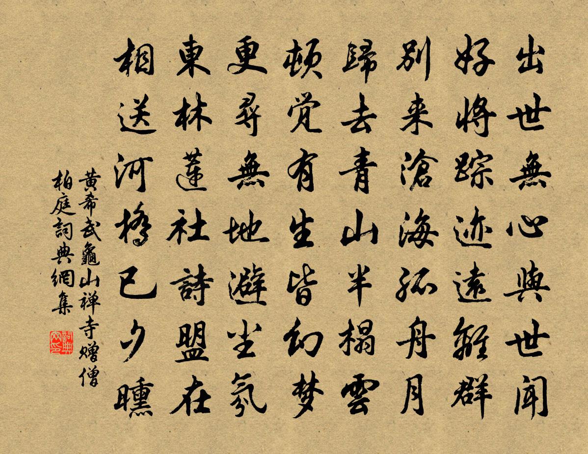 詩詞名句歷史字典書法欣賞書法字典國語詞典說文解字康熙字典古漢語字典標 題 作 者 詩 句 龜山禪寺贈僧柏庭作者:黃希武 朝代:宋代龜山禪寺贈僧柏庭原文出世無心與世聞,好將蹤跡遠離群。別來滄海孤舟月,歸去青山半榻雲。頓覺有生皆幻夢,更尋無地避塵氛。東林蓮社詩盟在,相送河橋已夕曛。詩詞問答問:龜山禪寺贈僧柏庭的作者是誰?答:黃希武問:龜山禪寺贈僧柏庭寫於哪個朝代?答:宋代黃希武龜山禪寺贈僧柏庭書法欣賞龜山禪寺贈僧柏庭書法作品詩詞推薦和殷舍人蕭員外春雪徐鉉〔唐代〕萬里春陰乍履端,廣庭風起玉塵乾。梅花嶺上連天白,蕙草階前特地寒。晴去便為經歲別,興來何惜徹宵看。此時沁園春(贈較弓會諸友)劉省齋〔宋代〕男子才生,桑弧蓬矢,志期古同。況平生慷慨,胸襟磊落,弛張洞曉,經藝該通。筆掃雲煙,腹儲兵甲,志氣天邊君莫惡行晁說之〔宋代〕今年蠶母連萬箔,屋邊桑葉渾不著。彷徨何計救戢戢,出棄陌頭空涕泣。前日初眠不敢語,今日賤之如糞土。不容如夢令史浩〔宋代〕紅杏白梨肌理。時樣新妝淡佇。真箇是觀音,少個楊枝淨水。歡喜。歡喜。盡此一鍾醇美。高氏石雲薛嵎〔宋代〕閬仙曾得句,月下自推敲。以此幽閒趣,長為淡泊交。水寒梅照影,霜滑鳥歸巢。余亦同懷者,從君結把茅。移合浦郭功甫見寄蘇軾〔宋代〕君恩浩蕩似陽春,合浦何如在海濱。莫趁明珠弄明月,夜深無數採珠人。睡起裘萬頃〔宋代〕疾去得安臥,寒宵不知長。鄰雞忽聞聲,曙色侵我床。人生孰無營,晨興固其常。奈何以一身,投之百憂場。吾方水龍吟 過南劍雙溪樓辛棄疾〔宋代〕舉頭西北浮雲,倚天萬里須長劍。人言此地,夜深長見,鬥牛光焰。我覺山高,潭空水冷,月明星淡。待燃犀下看坐睡趙文〔宋代〕非痴非夢小瞢騰,瞑坐還同入定僧。口似汝陽狂見曲,頭疑季子困懸繩。兒來問字幾 * ,客苦多言彊一應。日日山中陳宓〔宋代〕淺溪仍殘照,山青更暮煙。人行罨畫地,鳥度粉箋天。麥潤先春秀,梅清破臘年。田家無力事,牛背落鴉眠。送陳守仁入太學鄭俠〔宋代〕父子本天性,至恩無比倫。矧公之尊府,子舍公一身。料從少小來,迨茲壯有室。未嘗越旬月,遠去慈親膝。借問再和程公許〔宋代〕聞道溪橋澁欲乾,黃昏縞袂不禁寒。愛之不見空搔首,玉立亭亭可得乾。夜過富春徐集孫〔宋代〕夜船搖兀當乘槎,得與僧俱似出家。數幅征帆拋草渡,一團幽夢繞梅花。風傳山縣殘更漏,潮練霜江淡月華。所恨數日不出門偶賦陸游〔宋代〕十二年來一日同,飯蔬略似誦經翁。居家不擬依鄰富,報國惟思祝歲豐。冰澗乍通寒溜碧,蘭叢新放露芽紅。閒門四聖觀周弼〔宋代〕小園寬占一山孤,別有牆遮古觀居。到了恩波攔不住,水窗游出放生魚。友人病痁劉克莊〔宋代〕昔聞詩可驅痁疾,今日詩人疾自嬰。勢似邊兵鏖未解,根同野草劃還生。能蠲熱障惟山色,解洗煩襟只澗聲。溪友病中即事三首王炎〔宋代〕浹旬不見日,凍雲塞天宇。兒童相與言,雪意恐未已。一月見三白,為瑞亦足矣。老夫固畏寒,貧者憂凍死。六出六月末間拒霜已開吳芾〔宋代〕暑氣猶未退,寒花早已開。衰年寧有幾,寒暑若相催。初次巴陵楊凝〔唐代〕西江浪接洞庭波,積水遙連天上河。鄉信為憑誰寄去,汀洲燕雁漸來多。寄梅墟陳提乾釋紹曇〔宋代〕齒履登臨乏款延,薰風報謁郁藍天。拂塵未下雲檐榻,采寶新歸海國船。乘興□□迷柳下,搜吟□夢到梅邊。何時名句推薦舞榭歌台,風流總被雨打風吹去。辛棄疾《永遇樂·京口北固亭懷古》 宣和舊日,臨安南渡,芳景猶自如故。劉辰翁《永遇樂·璧月初晴》 村北村南,穀雨才耕遍。范成大《蝶戀花·春漲一篙添水面》 淡黃楊柳暗棲鴉。玉人和月摘梅花。賀鑄《減字浣溪沙·樓角初銷一縷霞》 疑人勿使,使人勿疑脫脫《金史·本紀·卷四》 疊嶂西馳,萬馬迴旋,眾山欲東。辛棄疾《沁園春·靈山齋庵賦時築偃湖未成》 發短愁催白,顏衰酒借紅。陳師道《除夜對酒贈少章》 正是江南好風景,落花時節又逢君。杜甫《江南逢李龜年》 肉腐出蟲,魚枯生蠹。荀子《荀子·勸學》 人言落日是天涯,望極天涯不見家。李覯《鄉思》