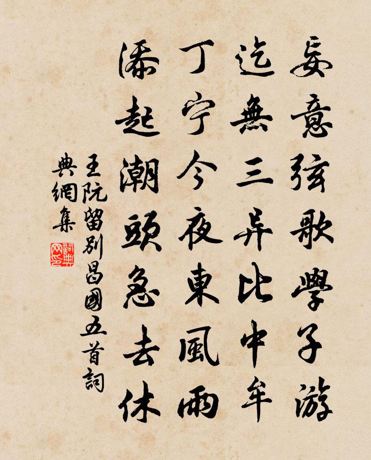 詩詞名句歷史字典書法欣賞書法字典國語詞典說文解字康熙字典古漢語字典標 題 作 者 詩 句 留別昌國五首作者:王阮 朝代:宋代留別昌國五首原文妄意弦歌學子游,迄無三異比中牟。丁寧今夜東風雨,添起潮頭急去休。詩詞問答問:留別昌國五首的作者是誰?答:王阮問:留別昌國五首寫於哪個朝代?答:宋代王阮留別昌國五首書法欣賞留別昌國五首書法作品詩詞推薦送著作佐郎崔融等從梁王東征陳子昂〔唐代〕金天方肅殺,白露始專征。王師非樂戰,之子慎佳兵。海氣侵南部,邊風掃北平。莫賣盧龍塞,歸邀麟閣名。句蔡肇〔宋代〕莫嫌供給難酬客,只為湖山已自賢。次韻王震蘇軾〔宋代〕攜文過我治平間,霧豹當時始一斑。聞道吹噓借餘論,故教流落得生還。清篇帶月來霜夜,妙語先春發病顏。詩酒武陵春佚名〔宋代〕物物般般都放下,熟境自然休。忙裡偷閒鬧處收。不掛一絲頭。動靜不拘無動靜,法界莫能歸境丘。逍遙物外游。夔州元宵和曾端伯韻四首郭印〔宋代〕遊子何須念故鄉,酒酣聊發次公狂。人生行樂真佳耳,休苦棲心名利場。無悶丁注〔宋代〕風急還收,雲凍又開,海闊無人翦水。算六出工夫,怎教容易。剛被郢歌楚舞。鎮獨向,尊前夸輕細。想謝庭詩詠留別心老陳與義〔宋代〕老心霜下松,名與隆公齊。人物北斗南,佛事東院西。平生四海腳,不復煩金篦。卻從夢中別,未免意慘悽。它時殘句:江清風偃木陳師道〔宋代〕江清風偃木,霜落雁橫空。重陽舟中戴復古〔宋代〕扁舟何寂寞,絕不見人家。無處沽村酒,何從問菊花。溪山澹相對,節序謾雲嘉。牢裹烏紗帽,西風日又斜。送李二十四移家之江州劉長卿〔唐代〕煙塵猶滿目,歧路易沾衣。逋客多南渡,征鴻自北飛。九江春草綠,千里暮潮歸。別後難相訪,全家隱釣磯。寄王贊學司空圖〔唐代〕黃卷不關兼濟業,青山自保老閒身。一行萬里纖塵靜,可要張儀更入秦。臨川投贈黃彥平〔宋代〕發策魁丹陛,摛文重禁林。麒麟鞭縷玉,菡萏燭搖金。事與京塵改,愁將瘴發侵。東還應晚合,未用歡升沉。送岳州李十從軍桂州張說〔唐代〕送客之江上,其人美且才。風波萬里闊,故舊十年來。劍拔蛟隨斷,弓張鳥自摧。陽橋書落落,驛馬定先回。郊廟歌辭。禪社首樂章。雍和賀知章〔唐代〕夙夜宥密,不敢寧宴。五齊既陳,八音在縣。粢盛以潔,房俎斯薦。惟德惟馨,尚茲克遍。跋諫長畫軸後五王按樂圖許及之〔宋代〕玉笛床頭取次橫,自吹頭管按新聲。梨園舊譜今何在,一段風流畫得成。上帥漕閔雨十首彭龜年〔宋代〕天子治平切,一賢無王畿。朝廷豈不重,赤子貧無依。元日文天祥〔宋代〕慚愧疚雲台客,飄零雪滿氈。不圖朱鳥影,猶見白蛇年。宮殿荒煙隔,門庭宿草連。乾坤自春色,回首一潸然。魯中送魯使君歸鄭州韓翃〔唐代〕城中金絡騎,出餞沈東陽。九月寒露白,六關秋草黃。齊謳聽處妙,魯酒把來香。醉後著鞭去,梅山道路長。送謝沂進士宋庠〔宋代〕坦床仙格照瓊筵,歸待蘭陔補逸篇。別路雲霞交友闊,慶門酥酪弟兄賢。春郊送目車流水,夕館 * 月上弦。續食感遇岑參〔唐代〕北山有芳杜,靡靡花正發。未及得采之,秋風忽吹殺。君不見拂雲百丈青松柯,縱使秋風無奈何。四時常作青黛色名句推薦淇澳春雲碧,瀟湘夜雨寒。憨山德清《詠竹五首》 灞橋楊柳年年恨,鴛浦芙蓉葉葉愁。蘇庠《鷓鴣天·楓落河梁野水秋》 不經一事,不長一智。佚名《增廣賢文·下集》 當年志氣俱消盡,白髮新添四五莖。薛逢《長安夜雨》 志士不忘在溝壑,勇士不忘喪其元。孟子《孟子·滕文公章句下·第一節》 長記曾攜手處,千樹壓、西湖寒碧。姜夔《暗香·舊時月色》 而浮生若夢,為歡幾何?李白《春夜宴桃李園序 / 春夜宴從弟桃花園序》 濃霧知秋晨氣潤,薄雲遮日午陰涼,不須飛蓋護戎裝。范成大《浣溪沙·江村道中》 秋在水清山暮蟬,洛陽樹色鳴皋煙。王昌齡《送狄宗亨》 鞭影落春堤,綠錦鄣泥卷。納蘭性德《生查子·鞭影落春堤》