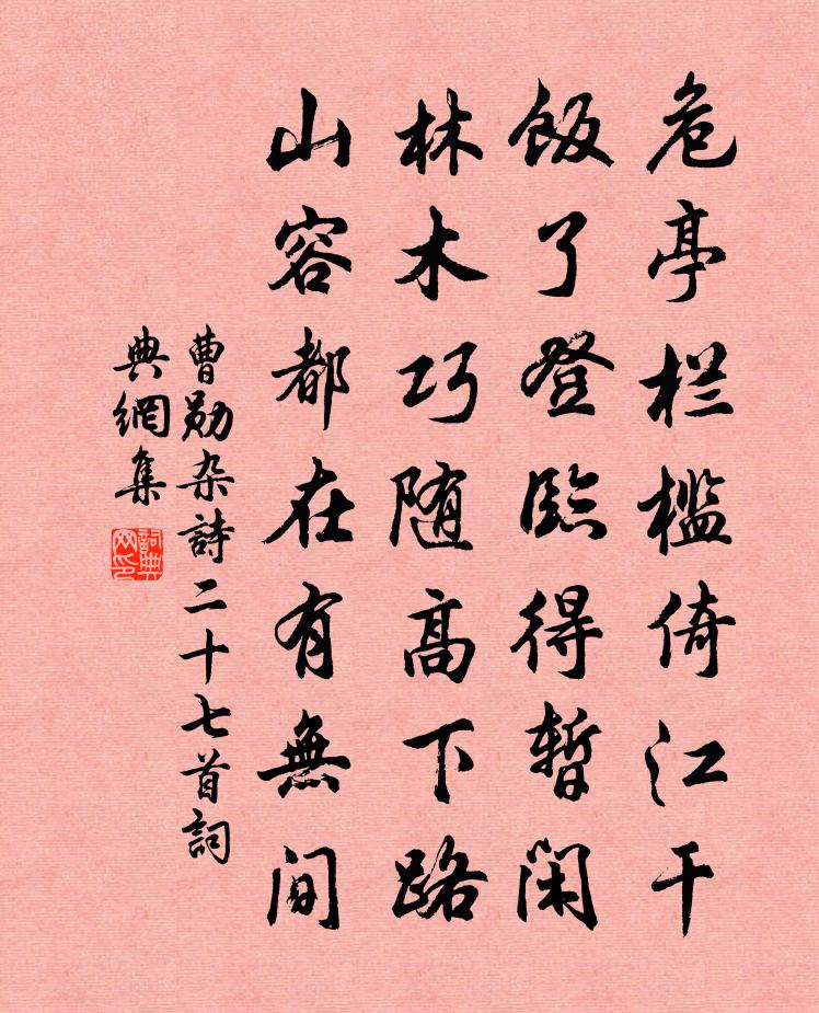詩詞名句歷史字典書法欣賞書法字典國語詞典說文解字康熙字典古漢語字典標 題 作 者 詩 句 雜詩二十七首作者:曹勛 朝代:宋代雜詩二十七首原文危亭欄檻倚江乾,飯了登臨得暫閒。林木巧隨高下路,山容都在有無間。詩詞問答問:雜詩二十七首的作者是誰?答:曹勛問:雜詩二十七首寫於哪個朝代?答:宋代曹勛雜詩二十七首書法欣賞雜詩二十七首書法作品詩詞推薦七言二首答黎教授歐陽修〔宋代〕撥瓮浮醅新釀熟,得霜寒菊始開齊。養丹道士顏如玉,愛酒山公醉似泥。不惜蕊從蜂採去,尚余香有蝶來棲。莫嫌代書寄品庫部邵雍〔宋代〕周王八駿走天涯,爭似君家四寶奇。鄭洛風煙雖咫尺,恨無由往一觀之。贈林愚庵墨梅蒲壽宬〔宋代〕色空已解花光意,香影難隨逋老蹤。此叟芒端不著蜜,幾回曾誤壁間蜂。發越州赴潤州使院,留別鮑侍御劉長卿〔唐代〕對水看山別離,孤舟日暮行遲。江南江北春草,獨向金陵去時。陳仲思、陳席珍、李靜翁、周直夫、鄭夢授追范成大〔宋代〕相送不忍別,更行一程路。情知不可留,猶勝輕別去。二陳拱連璧,僊李瑚璉具,周子雋拔俗,鄭子秀風度。嗟我詠史上伏生陳普〔宋代〕睢陽東苑三百里,中山後宮三百人。漢家制度無窮極,僅有寬仁不是秦。撫古晁說之〔宋代〕撫古論今百感生,興亡異世實同情。鬼神能告廣陵散,才智無如大廈傾。天御日躔歸故國,江潮淮浦謾新城。論都途中逢孫輅因得李頻訊息方乾〔唐代〕灞上寒仍在,柔條亦自新。山河雖度臘,雨雪未知春。正憶同袍者,堪逢共國人。銜杯益無語,與爾轉相親。詠史二首鄧肅〔宋代〕雨過東山春意濃,但攜桃李步春風。眼高四海無勍敵,百萬胡奴一□空。德麟以書相招雲已與潘仲寶在中廬可自酇來同李廌〔宋代〕靈溪閟洞鏁華胥,地脈旁通分野殊。莫憚登臨探奇險,恐君他日亦藏書。古興二首沈徽〔唐代〕蔓草自細微,女蘿始夭夭。夤緣至百尺,榮耀非一朝。敷色高碧嶺,流芳薄丹霄。如何摧秀木,正為餘波漂。莖葉戲和壽州曾秘丞黃黃詩王禹偁〔宋代〕黃黃真是小巫娥,買恐千金價不多。別母語嬌空有淚,對人聲顫未成歌。產從南國勝桃李,攜去東山隱薜蘿。滁上柬張簿二首劉宰〔宋代〕簿書閱過幾牛腰,一縷清香午未消。梔室醉吟誰是伴,鐵城折簡可頻招。歸輞川作王維〔唐代〕谷口疏鍾動,漁樵稍欲稀。悠然遠山暮,獨向白雲歸。菱蔓弱難定,楊花輕易飛。東皋春草色,惆悵掩柴扉。送程六王昌齡〔唐代〕冬夜傷離在五溪,青魚雪落膾橙薺。武岡前路看斜月,片片舟中雲向西。憑宣教寫真請贊釋正覺〔宋代〕山林之姿,水月之像。雷潛九地之中,春在百華之上。隨緣半合半開,分付全收全放。淵默家風,縱橫伎倆。道超早春雨中因呈邑大夫宋祁〔宋代〕瑞澍沾春陸,膚雲壓暝台。霰寒休雜下,風好即東來。遠岫吞將盡,陰霞照暫開。遍滋畦下麥,並濕隴頭梅。灑罶山丹花二首佚名〔宋代〕人間花木眼曾經,未識斯花狀與名。丹卻青山暮春色,續他紅樹墜時英。桐柏山黃法師齋高似孫〔宋代〕羽人歸丹丘,輕房冒蒼頂。雲飛北斗壇,瀑洗洪崖井。三更火交坎,八十雪垂領。深香熨玉斧,淑氣回丹鼎。彼空寄立齋王柏〔宋代〕團欒未久又分襟,踽踽{繯糹換女}{繯糹換女}老不禁。陋巷更無佳客語,殘編幸得古人心。熙熙農夫含生意,名句推薦燕歌未斷塞鴻飛,牧馬群嘶邊草綠。李益《塞下曲·其一》 輕則寡謀,驕則無禮。左丘明《國語·周語·王孫滿觀秦師》 民之歸仁也,猶水之就下、獸之走壙也。孟子《孟子·離婁章句上·第九節》 白日淪西河,素月出東嶺。陶淵明《雜詩十二首·其二》 生有七尺之形,死唯一棺之土,唯立德揚名,可以不朽陳壽《三國志·魏書·文帝紀》 衣懶換,酒難賒。可憐此夕看梅花。吳文英《思佳客·癸卯除夜》 淡中交耐久,靜里壽延長。王永彬《圍爐夜話·第一一六則》 飛雪過江來,船在赤欄橋側。呂渭老《好事近·飛雪過江來》 無肉令人瘦,無竹令人俗。蘇軾《於潛僧綠筠軒》 雲鬢花顏金步搖,芙蓉帳暖度春宵。白居易《長恨歌》