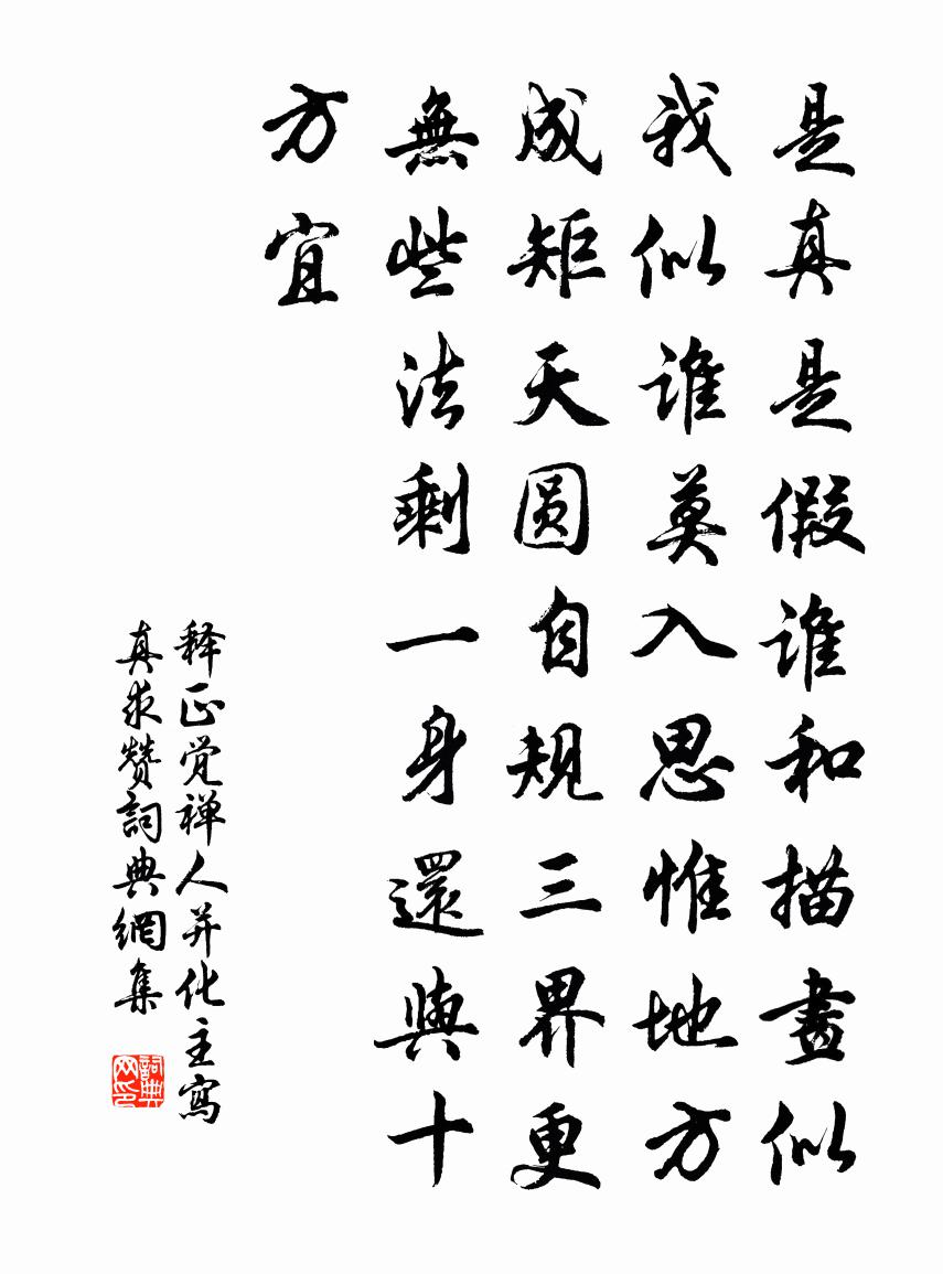 詩詞名句歷史字典書法欣賞書法字典國語詞典說文解字康熙字典古漢語字典標 題 作 者 詩 句 禪人並化主寫真求贊作者:釋正覺 朝代:宋代禪人並化主寫真求贊原文是真是假,誰和描畫。似我似誰,莫入思惟。地方成矩,天圓自規。三界更無些法剩,一身還與十方宜。詩詞問答問:禪人並化主寫真求贊的作者是誰?答:釋正覺問:禪人並化主寫真求贊寫於哪個朝代?答:宋代釋正覺禪人並化主寫真求贊書法欣賞禪人並化主寫真求贊書法作品詩詞推薦周祀五帝歌 白帝雲門舞庾信〔南北朝〕肅靈兌景。承配秋壇。雲高火落。露白蟬寒。帝律登年。金精行令。瑞獸霜耀。祥禽雪映。司藏肅殺。萬寶鹹宜。偈頌一百六十首釋宗杲〔宋代〕今朝又是端午節,文殊善財忙不徹, * 活人藥不靈,自添腦後三斤鐵。觀音妙智力,能救世間苦。是甚麽,鐵蛇重賦三高周南〔宋代〕千金孰與此身多,慚愧君王用已過。乞得頭顱江海去,一生辛苦幾漁蓑。春雪韓愈〔唐代〕新年都未有芳華,二月初驚見草芽。白雪卻嫌春色晚,故穿庭樹作飛花。二疊劉克莊〔宋代〕看來天地萃精英,占斷人間一味清。喚作花王應不忝,未應但做水仙兄。岳陽樓雜詠十二絕胡寅〔宋代〕李杜詞源廣更深,數篇春漲渺雲岑。爭如一首修樓記,妙寫仁人出處心。柳梢青施樞〔宋代〕飛露初霜。冷侵金井,響到銀床。懊恨碧梧,不留一葉,月占紗窗。雁聲做盡淒涼。又陡頓、衾寒夜長。曲曲屏山頌古八首釋道顏〔宋代〕相罵饒汝接嘴,相唾饒汝潑水。等閒摸著蛇頭,拍手囉囉哩哩。頌證道歌證道歌釋印肅〔宋代〕深成認賊將為子,可惜祖宗田人土。如今敗缺卒難收,浪死虛生長劫苦。形贈神陶淵明〔魏晉〕天地長不沒,山川無改時。草木得常理,霜露榮悴之。謂人最靈智,獨復不如茲。適見在世中,奄去靡歸期。奚覺郊行陸游〔宋代〕淒風吹雨過江城,緩策羸驂並水行。古路初驚秋葉墮,荒郊已放候蟲鳴。壯心耿耿人誰識?往事悠悠恨未平。斜日高宗郊前朝獻景靈宮二十一首真宗〔宋代〕涓選休辰,有事嘉薦。琅琅瓊佩,陟降嚴殿。其陟伊何,幣玉斯奠。周旋中禮,千億儲義。雞公幘(去褒城縣二十里)韋莊〔唐代〕石狀雖如幘,山形可類雞。向風疑欲斗,帶雨似聞啼。蔓織青籠合,松長翠羽低。不鳴非有意,為怕客奔齊。詠懷二首宋祁〔宋代〕榮願日雲暮,安論輕且肥。嵇慵元抱病,蘧晚況知非。餌落愁魚齅,巢成羨鳥歸。吾生江海志,終不與心違。自嘲陸游〔宋代〕貪祿忘歸秪自羞,一窗且復送悠悠。鏡明不為人藏老,酒薄難供客散愁。正得虛名真畫餅,元非大器愧函牛。年來謁金門袁去華〔宋代〕煙水闊。夜久風生苹末。東舫西船人語絕。四更山吐月。客里光陰電抹。不記離家時節。樓上單于聽未徹。又催征百字令(壽虞守·正月十二)陳潛心〔宋代〕梅峰孕秀,太仙翁、咫尺元宵三夕。盛德溫溫如玉粹,多少殊勛嘉績。兩擁朱幡,獨清節,高誼真難屈。景疏堂下村居初夏陸游〔宋代〕故鄉風物勝荊吳,流水青山無處無。列植園林多美果,飽鉏畦壟富嘉蔬。橋邊來淬劙桑斧,池畔行芟縛粽菰。我有簡蔡天任吳則禮〔宋代〕天公與此強健身,故遣雨洗南徐春。梅柳暮年經老眼,江湖疇昔著覉臣。要穿遙集腳底屐,不負淵明頭上巾。頗欲偈二首釋文準〔宋代〕今朝臘月十,夜來天落雪。群峰極目高低白,綠竹青松難辨別。必是來年蠶麥熟,張公李公皆忻悅。皆忻悅,鼓腹名句推薦堂上遠於百里,堂下遠於千里,門庭遠於萬里。管仲《管子·法法》 今日重來訪,不見知音人。馮夢龍《警世通言·卷一》 翠鈿曉寒輕,獨倚鞦韆無力。楊冠卿《如夢令·滿院落花春寂》 此路無知己,明珠莫暗投。高適《送魏八》 落梅庭榭香,芳草池塘綠。晏幾道《生查子·落梅庭榭香》 君子素其位而行,不願乎其外。子思《中庸·第十四章》 朗月清風,濃煙暗雨,天教憔悴度芳姿。李清照《多麗·詠白菊》 筆落驚風雨,書成泣鬼神。馮夢龍《醒世恆言·卷二十一》 幽人歸獨臥,滯慮洗孤清。張九齡《感遇十二首》 未成林,難望鳳來棲,聊醫俗。陸容《滿江紅·詠竹》