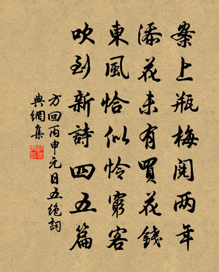 詩詞名句歷史字典書法欣賞書法字典國語詞典說文解字康熙字典古漢語字典標 題 作 者 詩 句 丙申元日五絕作者:方回 朝代:宋代丙申元日五絕原文案上瓶梅閱兩年,添花未有買花錢。東風恰似憐窮客,吹到新詩四五篇。詩詞問答問:丙申元日五絕的作者是誰?答:方回問:丙申元日五絕寫於哪個朝代?答:宋代方回丙申元日五絕書法欣賞丙申元日五絕書法作品詩詞推薦擬玉台體七首其二攜手曲梅堯臣〔宋代〕攜手出中閨,殷勤克密期。密期雖不遠,回顧步遲遲。答裴寄卿書因寄長篇王洋〔宋代〕裴郎短身衣弊服,衣長過身幾半幅。高裙大袖領占肩,要是精神大於腹。古書古字談古人,洗盆滌盎供慈親。慈親秋夕崔道融〔唐代〕自憐三十未西遊,傍水尋山過卻秋。一夜雨聲多少事,不思量盡到心頭。偈頌一百零四首釋紹曇〔宋代〕父{二豕}頑,子惡毒。熱血相噴。嗔拳相{上祝下土}。如風吹水自成紋,醫得耳聾成瞎禿。冷地思量,笑不成別袁昌州詩江總〔隋代〕河梁望隴頭。分手路悠悠。徂年驚若電。別日欲成秋。黃鵠飛飛遠。青山去去愁。不言云雨散。更似東西流。霜天曉角曹冠〔宋代〕浦漵凝煙。誰家女採蓮。手拈荷花微笑,傳雅令、侑清歡。擘葉勸金船。香風襲綺筵。最後殷勤一瓣,分付與、酒胡笳曲六拍文天祥〔宋代〕胡人歸來血洗箭,白馬將軍若雷電。蠻夷 * 錯相干,洛陽宮殿燒焚盡。干戈兵革斗未已,魑魅魍魎徒為爾。慟哭和廬山上人竹軒蘇軾〔宋代〕洞外復空中,千千萬萬同。勞師向竹頌,清是阿誰風。司徒侍中賈魏公輓辭二首蘇頌〔宋代〕仁聖隆儒有漢風,平津經術位三公。君臣契合千齡際,文武名尊二紀中。再謝貂蟬深畏寵,屢提貔虎不言功。一朝後園鑿井歌李賀〔唐代〕井上轆轤床上轉:水聲繁,弦聲淺。情若何?荀奉倩。城頭日,長向城頭住。一日作千年,不須流下去。下鐵礓嶺望秦川晚宿九穀李復〔宋代〕六月登壠如登天,騰夷鐵礓須判年。過險欲涉渭水渡,快眼喜見秦州川。溪塍青身下白鷺,驛亭秀木含疏煙。投鞭頌石頭和尚草庵歌釋印肅〔宋代〕欲識庵中不死人,幾回昏暗又天明。明暗不來渠不動,周天匝地等空平。久雨初霽對酒偶作強至〔宋代〕彌月窮山雨,昏昏氣蔽天。南榮初見日,萬瓦已生煙。節物驚殘臘,歡期減去年。愁來搔短髮,對酒且陶然。金陵雜興二百首蘇泂〔宋代〕八功德水飲一勺,當下令君熱惱消。城裡紅塵莫回首,小屏風嶺好逍遙。題唯庵後大松曹勛〔宋代〕唯庵有長松,秀拔撐青空。銅石並根乾,榆枋比蒿蓬。天地蔭中邊,日月奔西東。原言滋浩養,千歲看此公。寄竹隱先生孫應時劉過〔宋代〕蘇州酒滴如真珠,公能醉之酒百壺。得間政恐不來爾,來則倒屣相與俱。江山繞樓詩句好,奔走萬變同馳驅。大書觀田家韋應物〔唐代〕微雨眾卉新,一雷驚蟄始。田家幾日閒,耕種從此起。丁壯俱在野,場圃亦就理。歸來景常晏,飲犢西澗水。飢劬送張無夢歸天台山馬知節〔宋代〕暫至朝真主,卻思歸舊峰。只依三事布,唯有一枝筇。月上當孤室,風生自古松。陰功從此滿,何處覓遺蹤。詩三首釋邁賢〔宋代〕金斝又聞泛,玉山還報頹。莫教更漏促,趁取月明回。行住坐臥三十二頌釋印肅〔宋代〕生老病死苦相煎,唯我能知速棄捐。十二明中常念佛,聞師一舉耳無邊。名句推薦斗萬花樣巧,深染蜂黃。吳文英《惜黃花慢·菊》 殺一無罪,非仁也;非其有而取之,非義也。孟子《孟子·盡心章句上·第三十三節》 欲渡黃河冰塞川,將登太行雪滿山。李白《行路難·其一》 昔去雪如花,今來花似雪。范雲《別詩》 兒大詩書女絲麻,公但讀書煮春茶。黃庭堅《送王郎》 長使英雄淚滿襟,天意高難問。楊冠卿《卜運算元·秋晚集杜句吊賈傅》 雁過孤峰曉,猿啼一樹霜。賈島《送天台僧》 古人不見今時月,今月曾經照古人。佚名《增廣賢文·上集》 冷艷全欺雪,余香乍入衣。丘為《左掖梨花》 黃雲萬里動風色,白波九道流雪山。李白《廬山謠寄盧侍御虛舟》