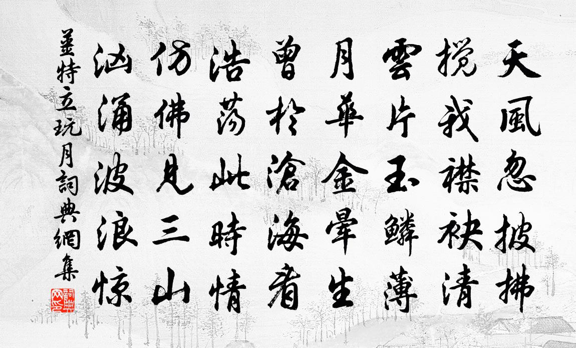 詩詞名句歷史字典書法欣賞書法字典國語詞典說文解字康熙字典古漢語字典標 題 作 者 詩 句 玩月作者:姜特立 朝代:宋代玩月原文天風忽披拂,攪我襟袂清。雲片玉鱗薄,月華金暈生。曾於滄海看,浩蕩此時情。仿佛見三山,洶湧波浪驚。詩詞問答問:玩月的作者是誰?答:姜特立問:玩月寫於哪個朝代?答:宋代姜特立玩月書法欣賞玩月書法作品詩詞推薦寄無為軍張居士王安石〔宋代〕南陽居士月城翁,曾習禪那問色空。卓犖想超文字外,低徊卻寄語言中。真心妙道終無二,末學殊方自不同。此理鍾陵夜闌作韋莊〔唐代〕鍾陵風雪夜將深,坐對寒江獨苦吟。流落天涯誰見問,少卿應識子卿心。榴花宋庠〔宋代〕誰取孤根植檻旁,絳跗丹蘤鬬年芳。驚飈莫損亭亭艷,百子先秋未有房。送朱職方提舉運鹽歐陽修〔宋代〕齊人謹鹽筴,伯者之事爾。計口收其餘,登耗以生齒。民充國亦富,粲若有條理。惟非三王法,儒者猶為恥。後世福唐元夕三首方孝能〔宋代〕街頭如書火山紅,酒面生鱗錦障風。佳客醉醒克色裹,新妝歌舞月明中。賀新郎·太白墓和雅存韻黃景仁〔清代〕何事催人老?是幾處、殘山剩水,閒憑閑吊。此是青蓮埋骨地,宅近謝家之脁。總一樣,文人宿草。只為先生名在次韻袁起岩常熟道中三絕句范成大〔宋代〕吳徑難勝四牡騑,扁舟辛苦鑿冰歸。簡書鞅掌吟詩苦,並與東陽減帶回。寄遠人杜牧〔唐代〕終日求人卜,回回道好音。那時離別後,入夢到如今。老僧念佛施樞〔宋代〕身世皆空境,知空自不悲。何須臨暮日,逐急念阿彌。裴相安心際,維摩懺罪時。同歸無有地,明月在秋池。天壺道院陳觀〔宋代〕山徑崎嶇紫翠連,白雲深處是壺天。客來無物供吟笑,旋摘新茶煮石泉。賦得含峰雲李世民〔唐代〕翠樓含曉霧,蓮峰帶晚雲。玉葉依岩聚,金枝觸石分。橫天結陣影,逐吹起羅文。非得陽台下,空將惑楚君。湘中中秋徐照〔宋代〕出望月輪小,不如臨海生。又疑今夜看,難比故鄉明。立柏正無影,清猿偏有聲。數家弦管外,傳此照離情。頌古四十五首釋慧遠〔宋代〕登壇道士羽衣輕,呪力雖窮法轉新。拇指破開地暗,蛇頭攧落鬼神驚。寄題餘杭郡樓,兼呈裴使君白居易〔唐代〕官曆二十政,宦遊三十秋。江山與風月,最憶是杭州。北郭沙堤尾,西湖石岸頭。綠觴春送客,紅燭夜回舟。不敢次韻李叔飛王洋〔宋代〕溪山春蘭林,桃李花槐市。戲友二三生,興來遠返趾。墨客冠再彈,蒼官仕三已。矜豪柳索強,引分梅知止。緣芳過溪口廣慈院刁約〔宋代〕賞遍林泉去未能,卻來溪口訪岩僧。為觀遠景憂奇處,更陟危亭最上層。雲吐前峰疑霈雨,泉飛別澗旋凝冰。陋容治圃雜書二十首方回〔宋代〕徑捷人蹤雜,牆頹地界斜。織籬呼野老,烹茗諭鄰家。舊穴通羊豕,新畦隔芋瓜。尚當分汝果,幸勿竊予花。柳梢青許楨〔元代〕山霽無嵐。尋幽有屐,不用張帆。樂事關心,良辰修禊,元夜傳柑。芳郊隨處行庵。聽騶導、擔花幾籃。洲渚凝妝夫人閣四首韓維〔宋代〕重錦褰妝幕,請羅換舞衣。釵頭雙燕子,先向社前飛。太常引 壽劉同知王惲〔元代〕太行晴色泛簾*。對書史,日優遊。賓從盡風流。誰健似、東陵故侯。人間萬事,塵埃野馬,一笑付紋楸。眉宇壽名句推薦夜來小雨新霽,雙燕舞風斜。万俟詠《訴衷情·送春》 梧桐葉上三更雨,葉葉聲聲是別離。周紫芝《鷓鴣天·一點殘紅欲盡時》 露從今夜白,月是故鄉明。杜甫《月夜憶舍弟》 旦別河橋楊柳風,夕臥伊川桃李月。宋之問《寒食還陸渾別業》 此後錦書休寄,畫樓雲雨無憑。晏幾道《清平樂·留人不住》 今士之用身,不若商人之用一布之慎也。墨子《墨子·47章 貴義》 傷心千里江南,怨曲重招,斷魂在否?吳文英《鶯啼序·春晚感懷》 檐流未滴梅花凍,一種清孤不等閒。鄭燮《山中雪後》 紅葉黃花秋意晚,千里念行客。晏幾道《思遠人·紅葉黃花秋意晚》 不似天涯,捲起楊花似雪花。蘇軾《減字木蘭花·立春》