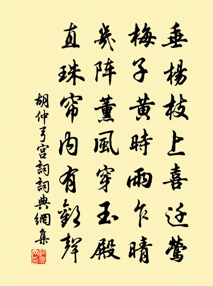詩詞名句歷史字典書法欣賞書法字典國語詞典說文解字康熙字典古漢語字典標 題 作 者 詩 句 宮詞作者:胡仲弓 朝代:宋代宮詞原文垂楊枝上喜遷鶯,梅子黃時雨乍晴。幾陣薰風穿玉殿,直珠簾內有歡聲。詩詞問答問:宮詞的作者是誰?答:胡仲弓問:宮詞寫於哪個朝代?答:宋代胡仲弓宮詞書法欣賞宮詞書法作品詩詞推薦宿普光寺張伯玉〔宋代〕無端未得歸林下,又向南言擁使麾。夜宿禪關更蕭灑,一軒寒月照清池。踏莎行(靈泉重陽作)李流謙〔宋代〕菊露晴黃,楓霜晚翠。重陽氣候偏如此。異鄉牢落怕登臨,吾家落照飛雲是。舉扇塵低,脫巾風細。靈苗醫得人憔廣安雍某〔宋代〕欲說賓城好,先夸方物妍。金羹收稻後,紅臘落梅前。照座梨偏紫,堆盤荔更鮮。清州如斗大,盛事數從前。崖日孟子不愧不作陳普〔宋代〕己私淨盡復何為,觸處逢原與理隨。心廣體胖無所累,浩然之氣未嘗虧。南浦程垓〔宋代〕金鴨懶薰香,向晚來春酲,一枕無緒。濃綠漲瑤窗,東風外、吹盡亂紅飛絮。無言佇立,斷腸惟有流鶯語。碧雲欲和將志父春風亭韻李曾伯〔宋代〕誰能草檄愈頭風,有酒時時共一中。莫把丹青羨蘇武,且將玄白玩揚雄。將軍事在龍荒北,客子心馳馬首東。休笑山館夜作黃景仁〔清代〕長夜山窗面面開,江湖前後思悠哉。當窗試與然高燭,要看魚龍啖影來。詠懷阮籍〔魏晉〕獨坐空堂上,誰可與歡者?出門臨永路,不見行車馬。登高望九州,悠悠分曠野。孤鳥西北飛,離獸東南下。日暮偈頌四首釋惟一〔宋代〕臘月儘是歲除夜,明朝又是正月一。年去年來無盡期,拄杖依前烏律律。樵歌三首鄭起〔宋代〕上山斸山山丁登,下山嵌山山稜層。秋殘日暮歸來晚,茅檐洗腳月又明,明朝早入芙蓉城。久不得孫中叔信鄭獬〔宋代〕秋風起天末,之子在窮途。久客住應悶,故鄉歸得無。清淮不到渭,晚樹自沈吳。願寄一樽酒,與君消壯圖。齊天樂李曾伯〔宋代〕少年塞上秋來早,昴街尚餘芒曜。舉目關河,驚心弧矢,顧我豈堪戎纛。幾番鳳誥。愧保障何功,恩隆旒藻。笑指晨起信筆姜特立〔宋代〕老翁夜不寐,最愛晨起早。既欣鄰雞鳴,更喜林烏噪。紅日忽上窗,亟呼具衣襖。下床一爐火,便覺春浩浩。須臾玉蝴蝶李之儀〔宋代〕以三闋見寄,輒次其韻坐久燈花開盡,暗驚風葉,初報霜寒。冉冉年華催暮,顏色非丹。攪回碭、蛩吟似織,留恨平陰張澄居士隱處三詩之亨泉黃庭堅〔宋代〕水德通萬物,發源會時亨。伏坎非心愿,成川且意行。棲遲林丘下,欲渥無塵纓。杖藜逢載酒,一瓢酌余清。開歲陸游〔宋代〕綠襦新畫衛門扉,賀刺相欺可累欷。賣困不靈仍喜睡,送窮無術又來歸。相尋蠶市人何在,爛醉蟆津事亦非。惟有漢臣明府與公度使君話吾州山水之勝有詩次韻方回〔宋代〕繡作群峰玉作川,筆端秋思浩無邊。賜金增秩從民借,會費將軍九萬箋。第一百七十七文天祥〔宋代〕男兒生世間,居然成濩落。鸞鳳有鎩翮,虹霓就撐握。老農十首曾協〔宋代〕朝家寬詔年年下,天上秋陽日日明。租稅入官公事了,壤歌遞與子孫賡。白兆山寺值雨呈同坐宋祁〔宋代〕飛軒憑望俯丹梯,星雨囊風暝夕曦。翠阜天遙雲待簇,紺園花老樹低枝。巾車預畏煙疇迥,蠟屐先憂磴道危。未似名句推薦朔吹飄夜香,繁霜滋曉白。柳宗元《早梅》 木葉紛紛下,東南日煙霜。劉昚虛《暮秋揚子江寄孟浩然》 蓋世的功勞,當不得一個矜字;彌天的罪過,當不得一個悔字。洪應明《菜根譚·概論》 郭門臨渡頭,村樹連谿口。王維《新晴野望》 一道鵲橋橫渺渺,千聲玉佩過玲玲。徐凝《七夕》 丈夫志四海,萬里猶比鄰。曹植《贈白馬王彪·並序》 觀人以言,美於黼黻、文章荀子《荀子·非相》 不知三江水,何事亦分流?陳子龍《三洲歌》 教人無處寄相思,落花芳草過前期,沒人知。孫光憲《虞美人·好風微揭簾旌起》 見而不見,聞而不聞,知而不知。韓非及後人《韓非子·主道》