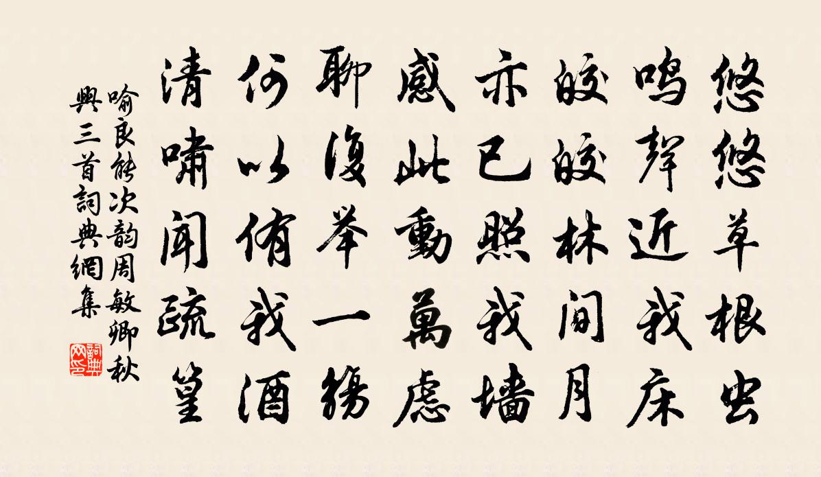 詩詞名句歷史字典書法欣賞書法字典國語詞典說文解字康熙字典古漢語字典標 題 作 者 詩 句 次韻周敏卿秋興三首作者:喻良能 朝代:宋代次韻周敏卿秋興三首原文悠悠草根蟲,鳴聲近我床。皎皎林間月,亦已照我牆。感此動萬慮,聊復舉一觴。何以侑我酒,清嘯聞疏篁。詩詞問答問:次韻周敏卿秋興三首的作者是誰?答:喻良能問:次韻周敏卿秋興三首寫於哪個朝代?答:宋代喻良能次韻周敏卿秋興三首書法欣賞次韻周敏卿秋興三首書法作品詩詞推薦贈杜鼎升張及〔宋代〕家本樊川老蜀都,世家冠劍豈寒儒。筆耕尚可儲三載,酒戰猶能敵百夫。僻愛舜琴湘水弄,每懸孫畫醉仙圖。孟光歲稔姜特立〔宋代〕今負稔熟收田禾,智慧型雞擔谷主人家。農人時節一醉飽,擨歈起舞相喧譁。宿定陵寺(寺在陵內)盧綸〔唐代〕古塔荒台出禁牆,磬聲初盡漏聲長。雲生紫殿幡花濕,月照青山松柏香。禪室夜聞風過竹,奠筵朝啟露沾裳。誰悟疏山曾鞏〔宋代〕一見雲山病眼清,野僧勤動水邊迎。蒼松翠竹東南道,亂石峰前踏月行。臨江仙晁端禮〔宋代〕今夜征帆何處落,煙村幾點人家。莫驚雙淚向風斜。漁人西塞曲,商女後庭花。從此五湖歸去好,一杯酒送生涯。畫堂春毛並〔宋代〕華燈收盡雪初殘。踏青還爾游盤。落梅強半已飛翻。劃地春寒。多病故人日遠,幾時雙燕來還。可憐樓上一憑欄。喜方溪復歸白雲釋行海〔宋代〕十載青燈自苦辛,懶將白眼顧浮塵。鳳聲偏近瑤台月,草色難連玉樹春。雲有去來非本意,世無榮辱是何人。幾番寄高郵僧陳造〔宋代〕門巷蕭然草不鋤,小軒只置兩團蒲。惟師表表叢林秀,眷我涼涼山澤臞。晨飯每同三韭陋,夜棋常辦百籌輸。一書六言陸游〔宋代〕噉飯一簞不盡,結廬環堵猶寬。常得奉祠玉局,不須草詔金鑾。泰山吟謝道韞〔魏晉〕峨峨東嶽高,秀極沖青天。岩中間虛宇,寂寞幽以玄。非工復非匠,雲構發自然。器象爾何物?遂令我屢遷。逝將頌古三十一首釋玿〔宋代〕當機轉處不躊躇,琉璃盤裹走明珠。趙州老子村校書,一條拄杖兩人舁。緩帶軒獨坐范成大〔宋代〕午日烘開豆蔻苞,檐塵飛動雀爭巢。蒙蒙困眼無安處,閒送爐煙到竹梢。挽梁丹隱丘葵〔宋代〕受用伯陽書,萬緣都覺虛。達官直桎梏,大夏即籧篨。世謂求仙妄,誰知是道余。臨終為土解,何必淚盈裾。即事四首劉克莊〔宋代〕待鑿新池引一灣,更規高阜敞三間。縮牆恐犯鄰家地,減樹圖看屋後山。身隱免貽千載笑,書成猶要十年閒。門前望洞庭劉禹錫〔唐代〕湖光秋月兩相和,潭面無風鏡未磨。遙望洞庭山水翠,白銀盤裡一青螺。袁州州學記李覯〔宋代〕皇帝二十有三年,制詔州縣立學。惟時守令,有哲有愚。有屈力殫慮,祗順德意;有假官借師,苟具文書。或連數春貼子皇帝閣六首真德秀〔宋代〕歲朝元朝使,龍荒萬里來。至仁天廣大,朔漠亦春台。和嚴給事聞唐昌觀玉蕊花下有遊仙二絕劉禹錫〔唐代〕玉女來看玉蕊花,異香先引七香車。攀枝弄雪時回顧,驚怪人間日易斜。雪蕊瓊絲滿院春,衣輕步步不生塵。君平郴江百詠並序會勝寺阮閱〔宋代〕靈壽山前古梵宮,粥魚齋鼓白雲中。衲僧若會蒙泉意,竟與曹溪一徑通。避暑鏘璆亭程公許〔宋代〕老怯新秋暑鬱蒸,晚風水檻一披襟。試教通閘喧雷鼓,何似穿岩晌玉琴。默坐自能醒渴夢,微吟時與和清音。專城名句推薦黃鶴一去不復返,白雲千載空悠悠。崔顥《黃鶴樓 / 登黃鶴樓》 凡令之行也,必待近者之勝也,而令乃行。管仲《管子·重令》 水墨畫疏窗,孤影淡瀟湘。納蘭性德《木蘭花慢·立秋夜雨送梁汾南行》 黃鶴樓前日欲低,漢陽城樹亂烏啼李夢陽《夏口夜泊別友人》 一夕輕雷落萬絲,霽光浮瓦碧參差。秦觀《春日》 只恐夜深花睡去,故燒高燭照紅妝。蘇軾《海棠》 不充詘於富貴,不遑遑於所欲。姚察、姚思廉《梁書·列傳·卷五十》 行人莫問當年事,故國東來渭水流。許渾《鹹陽城東樓 / 鹹陽城西樓晚眺 / 西門》 女媧鍊石補天處,石破天驚逗秋雨。李賀《李憑箜篌引》 楊柳風柔,海棠月淡,獨自倚闌時。薩都剌《小闌乾·去年人在鳳凰池》
