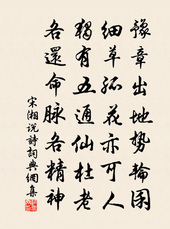 詩詞名句歷史字典書法欣賞書法字典國語詞典說文解字康熙字典古漢語字典標 題 作 者 詩 句 說詩作者:宋湘 朝代:清代說詩原文豫章出地勢輪囷,細草孤花亦可人。獨有五通仙杜老,各還命脈各精神。詩詞問答問:說詩的作者是誰?答:宋湘問:說詩寫於哪個朝代?答:清代問:說詩是什麼體裁?答:七絕宋湘說詩書法欣賞說詩書法作品詩詞推薦送沈倉曹赴江西白居易〔唐代〕落日驅單騎,涼風換袷衣。遠魚傳信至,秋雁趁行飛。洛下閒居住,城東醉伴稀。莫辭船舫重,多覓酒錢歸。 屏居春日宋庠〔宋代〕初服仍從洛涘居,鳴蛙鐃吹滿前除。露園柘彈愁逢雀,磻渚璜鉤枉餌魚。蠟屐幽懷高下齒。斲輪真想古今書。漢人郊廟歌辭享龍池樂章第二章蔡孚〔唐代〕帝宅王家大道邊,神馬龍龜涌聖泉。昔日昔時經此地,看來看去漸成川。歌台舞榭宜正月,柳岸梅洲勝往年。莫言孟津詩曹丕〔魏晉〕良辰啟初節。高會構歡娛。通天拂景雲。俯臨四達衢。羽爵浮象樽。珍膳盈豆區。清歌發妙曲。樂正奏笙竽。曜靈高宗祀明堂前朝享太廟二十一首真宗〔宋代〕於皇我後,祗廿專精。齋肅有容,祖考是承。造次匪懈,孝思純誠。神聽有格,福祿來寧。擬和御製郊祀詩李洪〔宋代〕郊禋饗帝就圜丘,誠格蒼穹靈既留。夜陟紫壇飈馭下,天臨黃道矞雲浮。槐林雙闕恩方渙,禾黍三登歲有秋。幸睹南澗韓元吉〔宋代〕入山衣屨濕。初 * 雨來,稍識雲氣集。空濛掠面過,可玩不可執。不知市廛地,去此凡幾級。青松入長望,白鳥自閔陸游〔宋代〕主人元是客,儒上卻成僧。垂老貧如昔,經春醉未曾。褰衣身傴僂,顧影發鬅鬠。忽憶東岡路,捫蘿試一登。詠佛見笑舒岳祥〔宋代〕錦堂得此添春色,金屋從他著麗人。老佛見之憐且笑,少年休以妄為真。梵天寶相宜方駕,海島金沙合效顰。可是二月晦游東屯拜少陵像陳邕〔宋代〕飛飛鳴梟啄金屋,孔雀飲泉牛牴觸。杜鵑喜免百巢嗔,鷦鷯強息一枝足。燭天光焰幾許長,日眩東極升朝陽。世人追和東坡雨中睡熟至晚王之道〔宋代〕春睡酣帶酒,晚食美當肉。細觀東坡詩,萬事貴精熟。一陰七十日,雨意猶未足。山雲開複合,檐溜斷還續。東鄰待舟西興遣悶釋紹嵩〔宋代〕海涌銀為郭,吳疆與越連。有山來枕上,無酒到愁邊。烈烈寒風起,悠悠落日懸。孤舟未得濟,少駐祖生鞭。金陵雜興二百首蘇泂〔宋代〕多少橫屍疊似樓,官人早晚解紅頭。淮南已是無聊甚,行到江東劃地愁。送喬岑強至〔宋代〕世俗誰夸晝錦歸,鄉人應笑舊儒衣。一言許與經詞伯,三道聲名出禮闈。好在青雲鬚遠步,莫愁黃鵠不高飛。還家三月晦和唐人韻詩云三月正當三十日風光別我胡寅〔宋代〕一氣沖融轉大鈞,四時舒捲見全身。若雲春向晨鐘斷,須信詩人未識春。秋張耒〔宋代〕日落星稀河漢微,清秋一點水螢飛。涼風白露愁先覺,可待梧桐報即知。四仙韻馬鈺〔元代〕丘仙通密。隱跡*溪人不識。通妙劉仙。永住終南屏萬緣。譚仙通正。志在清貧修大定。三髻山侗。願處環牆也放龍隱洞張埏〔宋代〕幾年鱗甲蟄清淵,一旦飛騰石自穿。遺蹟謾存離舊隱,這應銜雨去朝天。謝裴司空寄馬(一作蒙裴相公賜馬,謹以詩謝)張籍〔唐代〕騄耳新駒駿得名,司空遠自寄書生。乍離華廄移蹄澀,初到貧家舉眼驚。每被閒人來借問,多尋古寺獨騎行。長思劉園程公許〔宋代〕陰沍必陽和,快晴差愜意。怒飈妒心賞,清游殊鮮味。擊船枯葦叢,悶損兀坐睡。斷港麴塵波,見引著勝地。逕梅名句推薦拋家傍路,思量卻是,無情有思。蘇軾《水龍吟·次韻章質夫楊花詞》 庫無備兵,雖有義,不能征無義。墨子《墨子·05章 七患》 城外蕭蕭北風起,城上健兒吹落耳。劉基《北風行》 李杜詩篇萬口傳,至今已覺不新鮮。趙翼《論詩五首》 學者不患才之不贍,而患志之不立。徐幹《中論·上卷·治學》 千形萬象竟還空,映水藏山片復重。來鵠《雲》 欲箋心事,獨語斜闌。唐婉《釵頭鳳·世情薄》 澗戶寂無人,紛紛開且落。王維《辛夷塢》 池花春映日,窗竹夜鳴秋。李白《謝公亭·蓋謝朓范雲之所游》 昔歲逢太平,山林二十年。元結《賊退示官吏》