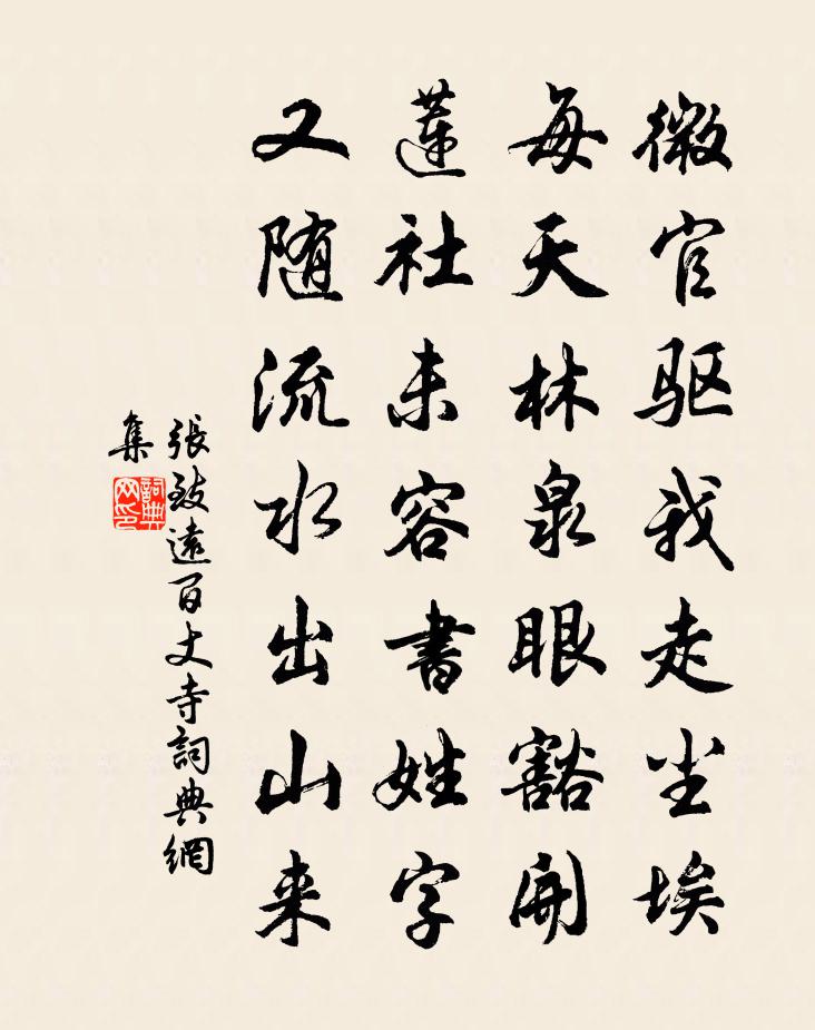詩詞名句歷史字典書法欣賞書法字典國語詞典說文解字康熙字典古漢語字典標 題 作 者 詩 句 百丈寺作者:張致遠 朝代:宋代百丈寺原文微官驅我走塵埃,每天林泉眼豁開。蓮社未容書姓字,又隨流水出山來。詩詞問答問:百丈寺的作者是誰?答:張致遠問:百丈寺寫於哪個朝代?答:宋代張致遠百丈寺書法欣賞百丈寺書法作品詩詞推薦再和堯夫同前韓維〔宋代〕朱弦四十昔嘗聞,藝不論多貴絕倫。少損新聲放平淡,免教醉殺白頭人。江亭夜月送別二首王勃〔唐代〕江送巴南水,山橫塞北雲。津亭秋月夜,誰見泣離群。亂煙籠碧砌,飛月向南端。寂寂離亭掩,江山此夜寒。縣圃十絕和朱待制薛抗〔宋代〕焚香坐清晝,此心自如如。我知拙催科,考甘下下書。游越溪鄭紹〔唐代〕溪水碧悠悠,猿聲斷客愁。漁潭逢釣楫,月浦值孤舟。訪泊隨煙火,迷途視鬥牛。今宵越鄉意,還取醉忘憂。寄別餘明遠董嗣杲〔宋代〕別離臨水闊,迤邐望城微。落日猶回首,空江獨自歸。遙峰攢石樹,飢鳥立沙磯。誰憫貂裘敝,還家且掩扉。百字令/念奴嬌陳潛心〔宋代〕梅峰孕秀,慶仙翁、咫尺元宵三夕。盛德溫溫如玉粹,多少殊勛嘉績。兩擁朱幡,獨清節,高誼真難屈。景疏堂下三月三日雨作遣悶十絕句楊萬里〔宋代〕報答春光酒一卮?貧中無酒著春歁。作詩細與東風道,未必東風肯要詩。宮詞楊皇后〔宋代〕曉窗生白已鶯啼,啼在宮花第幾枝。煙斷獸爐香未絕,曲房朱戶夢回時。視通濟堰二首晁公溯〔宋代〕往年初堰壞,樂歲亦民飢。再見龍尾水,如興鴻卻陂。名同召伯埭,人立許楊祠。祝史有祀事,歌予迎送詩。天台禪院聯句佚名〔唐代〕偶到天台院,因逢物外僧。 ——安守范忘洋州三十景蒸萏亭鮮于侁〔宋代〕夏綠分照水,秋香仍滿地。吳宮誰教戰,一一盡嬌媚。除夜侍酒呈諸兄示舍弟歐陽詹〔唐代〕莫嘆明朝又一春,相看堪共貴茲身。悠悠寰宇同今夜,膝下傳杯有幾人。菩薩蠻李邦獻〔宋代〕薰沈刻蠟工夫巧。蜜脾鎖碎金鍾小。別是一般香。解教人斷腸。冰霜相與瘦。清在江梅右。念我忍寒來。憐君特地代謝玄暉新亭送范零陵曹鄴〔唐代〕楚水洪無際,滄茫接天涯。相看不能語,獨鳥下江蘺。蓬子悉有戀,蓬根卻無期。車輪自不住,何必怨路歧。孟冬雪杜荀鶴〔唐代〕風攪長空寒骨生,光於曉色報窗明。江湖不見飛禽影,岩谷時聞折竹聲。巢穴幾多相似處,路岐兼得一般平。擁袍偶過浣花感舊遊戲作陸游〔宋代〕憶昔初為錦城客,醉騎駿馬桃花色。玉人攜手上江樓,一笑鉤簾賞微雪。寶釵換酒忽徑去,三日樓中香未滅。市人寒食日歸吳興寄魯山仲並〔宋代〕風雲雖不定,日雨亦易乾。殘春猶凜凜,助我朝食寒。想見芳野田,士女游班班。去者日以疏,更為來者歡。青紅青黃二色二首賈似道〔宋代〕黃頭青項銷金翅,二色俱全便為最。若還三件一齊生,鬭到秋深絕無對。失題宋雍〔唐代〕斜雨飛絲織晚風,疏簾半卷野亭空。荷花開盡秋光晚,零落殘紅綠沼中。和趙德麟送陳傳道蘇軾〔宋代〕二陳既妙士,兩歐惟德人。王孫乃龍種,世有籋雲麟。五君從我游,傾寫出怪珍。俗物敗人意,茲游實清醇。那知名句推薦江寒水不流,魚嚼梅花影。釋敬安《題寒江釣雪圖》 梅子青,梅子黃,菜肥麥熟養蠶忙。祝允明《首夏山中行吟》 有花堪折直須折,莫待無花空折枝。無名氏《雜詩》 綠葉青跗映丹萼,與君裴回上金閣。王勃《落花落》 傷心莫語,記那日旗亭,水嬉散盡,中酒阻風去。納蘭性德《摸魚兒·午日雨眺》 一時勸人以口,百世勸人以書。袁黃《了凡四訓·積善之方》 霜草蒼蒼蟲切切,村南村北行人絕。白居易《村夜》 一生傲岸苦不諧,恩疏媒勞志多乖。李白《答王十二寒夜獨酌有懷》 勿貪意外之財,勿飲過量之酒。朱柏廬《朱子家訓·全文》 風定落花深,簾外擁紅堆雪。李清照《好事近·風定落花深》