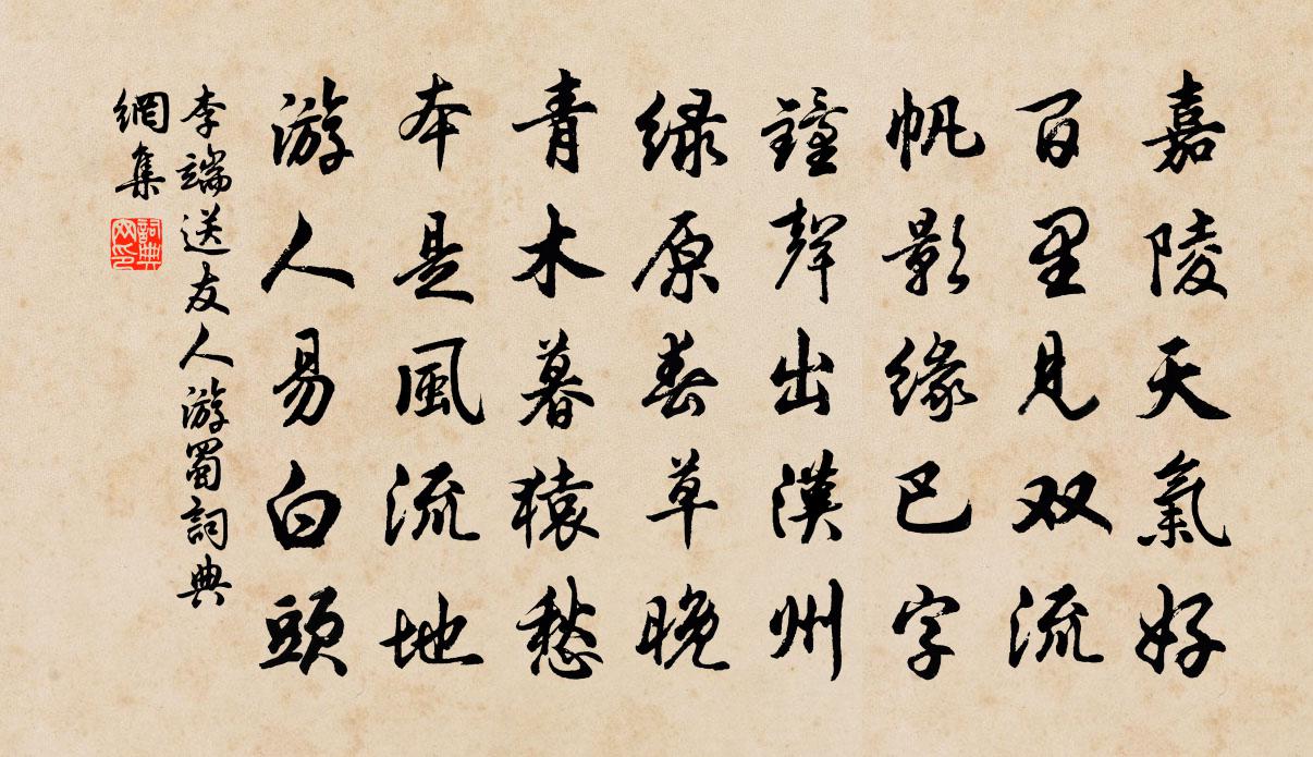 詩詞名句歷史字典書法欣賞書法字典國語詞典說文解字康熙字典古漢語字典標 題 作 者 詩 句 送友人游蜀作者:李端 朝代:唐代送友人游蜀原文嘉陵天氣好,百里見雙流。帆影緣巴字,鐘聲出漢州。綠原春草晚,青木暮猿愁。本是風流地,遊人易白頭。詩詞問答問:送友人游蜀的作者是誰?答:李端問:送友人游蜀寫於哪個朝代?答:唐代問:送友人游蜀是什麼體裁?答:五律李端送友人游蜀書法欣賞送友人游蜀書法作品注釋全唐詩:卷285_16詩詞推薦昔游鄭獬〔宋代〕小旗短棹西池上,青杏煮酒寒食頭。綠楊陰里穿小巷,鬧花深處藏高樓。紫絲絡馬客欲起,錦袖挽衣人相留。逢春偈頌七十六首釋子益〔宋代〕玄沙不出嶺,拄杖生根休用剪。保壽不渡河,缽盂無柄不須安。雜詩二首張耒〔宋代〕高堂斷四聽,鳴雨曉未止。堂空雨聲大,滴滴清我耳。朝眠引幽夢,遇我同心子。談笑未容周,夢開坐千里。李廷老自蔡州見訪雲明日便歸鄭梅堯臣〔宋代〕故人夜相過,秉燭為開席。車馬立在門,樽酒豈暇索。亹亹別後言,亹亹恨將適。既去暝色合,不可見行跡。立春帖子太上皇帝閣周必大〔宋代〕去年春日盛,七十慶儀新。今歲從頭數,重過一萬春。追古亭郭印〔宋代〕結茅覆短椽,仁風追太古。回視輪奐美,唾笑如糞土。憶舊遊張炎〔宋代〕故態頓消。以余之況味,又有甚於元父者,抑重余之惜,因賦此調,且寄元父,當為余愀然而悲也嘆江潭樹老,杜故致政敷文少卿魯公輓詞韓元吉〔宋代〕左學摛文藹儁聲,青雲接武二難兄。主知自紀宜三院,使節更持僅九卿。庭下芝蘭方競秀,舍南桃李已成陰。掛冠紀羅楊二子游南嶺石人峰楊萬里〔宋代〕二子同游石人峰,深行翠筱黃茅中。初嫌微徑無人蹤,行到半嶺徑亦窮。來時猶自聞雞犬,且行且語不覺遠。上頭樂津店北陂歐陽詹〔唐代〕嬋娟有麗玉如也,美笑當予系予馬。羅幃碧簟豈相容,行到山頭憶山下。鄭太灼灸戲成王洋〔宋代〕丈人國地龜,千古秘清廟。側聞扈聖初,彤庭獻喜兆。從此氛霧開,屢錫休瑞報。珪璋厭紛華,江湖樂豐好。一冠為陳介然題持約畫陳與義〔宋代〕層層水落白灘生,萬里征鴻小作程。日暮微風過荷葉,陂南陂北聽秋聲。白鹿洞書院朱熹〔宋代〕昔人讀書處,町疃白鹿場。世道有升降,茲焉更表章。矧今中興年,治具一以張。弦歌獨不嗣,山水無輝光。荒榛陶兀居士贊黃庭堅〔宋代〕兀兀陶陶,借書借不得。陶陶兀兀,問字問不得。是醒是醉,佛也會不得布衣簪紱,有人扶便得。壬辰春上冢五首郭西劉克莊〔宋代〕自古佳城屬吉人,郭書王讖豈能神。掃松稍喜衣冠眾,薦芰何妨俎豆貧。委巷起家基世德,分山葬友等天倫。側傍筇竹杖贊黃庭堅〔宋代〕厲廉隅而不劌,故竊比於彭耽之壽。屈曲而有直體,能獨立於雪霜之後。伯夷食薇而清,陳仲咽李而瘦。涪翁晝寢王九山輓詩薛嵎〔宋代〕俗論鄙迂儒,公胡獨受欺。焦桐方入調,夜鵲忽驚枝。心事將誰計,身名負已知。九原如可作,白首誓為期。題廣州光孝寺林衢〔宋代〕開池曾記虞翻苑,列樹今存建德門。無客不觀丞相硯,有人曾悟祖師幡。舊煎訶子泉猶冽,新種菩提葉又繁。無奈海中醉題時雷雨初霽天水相接也陸游〔宋代〕羈游那復恨,奇觀有南溟。浪蹴半空白,天梁無盡青。吐吞交日月,澒洞戰雷霆。醉後吹橫笛,魚龍亦出聽。寇參軍以孤雁一絕見貽因酬之強至〔宋代〕紫塞來時偶失群,追飛已隔萬重雲。人情所喜惟朋附,耳聽孤鳴似不聞。名句推薦富與貴,是人之所欲也;不以其道得之,不處也。孔子弟子《論語·里仁篇》 士為知己者死,女為悅己者容。劉向《戰國策·趙一·晉畢陽之孫豫讓》 念月榭攜手,露橋聞笛。周邦彥《蘭陵王·柳》 滿紙荒唐言,一把辛酸淚!曹雪芹《紅樓夢·第一回》 見世人可取者多,則德日進矣。王永彬《圍爐夜話·第五六則》 一年滴盡蓮花漏。碧井酴酥沈凍酒。毛滂《玉樓春·己卯歲元日》 憶昔西池池上飲,年年多少歡娛。晁沖之《臨江仙·憶昔西池池上飲》 天將暮,雪亂舞,半梅花半飄柳絮。馬致遠《壽陽曲·江天暮雪》 何當重相見,尊酒慰離顏。溫庭筠《送人東遊》 江上晚來堪畫處,釣魚人一蓑歸去。馬致遠《壽陽曲·江天暮雪》