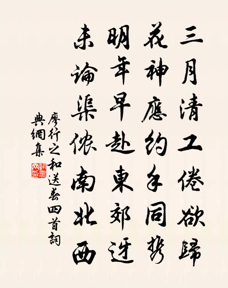 詩詞名句歷史字典書法欣賞書法字典國語詞典說文解字康熙字典古漢語字典標 題 作 者 詩 句 和送春四首作者:廖行之 朝代:宋代和送春四首原文三月清工倦欲歸,花神應約手同攜。明年早赴東郊迓,未論渠儂南北西。詩詞問答問:和送春四首的作者是誰?答:廖行之問:和送春四首寫於哪個朝代?答:宋代廖行之和送春四首書法欣賞和送春四首書法作品詩詞推薦詠白海棠曹雪芹〔清代〕蘅芷階通蘿薜門,也宜牆角也宜盆。花因喜潔難尋偶,人為悲秋易斷魂。玉燭滴乾風裡淚,晶簾隔破月中痕。幽情臨江仙邢俊臣〔宋代〕遠來猶自憶梁陳。江南無好物,聊贈一枝春。山茶郭印〔宋代〕枯林獨秀染胭脂,不使群芳次第窺。月桂殷勤來並色,江梅寂寞許同時。霜飛雪舞終難挫,蝶隱蜂逃各未知。折得送鄭尚書守建安十首彭龜年〔宋代〕革履如今遠帝廬,眼前憂念總區區。黃鐘一氣元來在,安得先生起亞夫。贈恆齋葛太翳陳深〔宋代〕少小煙霞痼疾深,已將鐘鼎等山林。年來更有躭玄癖,煩向膏肓為一鍼。漁父醉黃今是〔宋代〕青煙何處淡孤洲,有客經年業一鉤。芳草渡頭新貰酒,碧雲天際已歸舟。觀化朱繼芳〔宋代〕看見青蟲作蝶時,不知蝶是此身非。床頭為有南華卷,午枕酣來忽夢飛。田園言懷李白〔唐代〕賈誼三年謫,班超萬里侯。何如牽白犢,飲水對清流。和陳少卿鄧肅〔宋代〕懶從蒿目世間憂,緩步招提味九丘。正論羨君無鄭衛,窮途慰我在商周。飄然忽作遷喬興,卓爾難追跨海游。別去七諫東方朔〔兩漢〕初放 平生於國兮,長於原野。 言語訥譅兮,又無彊輔。 淺智褊能兮,聞見又寡。 數言便事兮,見小蓬萊詩楊維楨〔元代〕蓬萊在何許?渺在東海虛。其回五千里,上有神人居。山川異百奧,風俗如三吳。仙官示狡獪,百丈神乾軀。世人風雨中過龍洞閣陸游〔宋代〕飄然醉袖怒人扶,個裡何曾有畏塗。捲地黑風吹慘澹,半天朱閣插虛無。闌邊歸鶴如爭捷,雲表飛仙定可呼。莫怪寒食野外書所見宋祁〔宋代〕一雨初回逗晚涼,近郊連帟儼相望。乞漿易醉墦間客,就養初閒竃下郎。暖吹未休緣迥野,低煙不散為垂楊。家家題宜興庵壁李曾伯〔宋代〕秋盡菊都荒,蜂猶采蜜忙。何如龜縮殼,此際已深藏。九日代羅、樊二妓招舒著作(齊梁格)白居易〔唐代〕羅敷斂雙袂,樊姬獻一杯。不見舒員外,秋菊為誰開?程帥寄詩見憶次韻四首陳造〔宋代〕車笠何人記舊盟,惟公不作白頭新。渠儂欲識九華伯,可但詩壇第一人。和率齋王簾使三首劉鑒〔宋代〕試手東風第一杯,一番人物萃歐梅。曳裙昔憚王門峻,振鐸今逢孔席開。送酒馬軍江上去,持書驛使隴頭來。斯文奉和晦日駕幸昆明池應制沈佺期〔唐代〕法駕乘春轉,神池象漢回。雙星移舊石,孤月隱殘灰。戰鷁逢時去,恩魚望幸來。山花緹綺繞,堤柳幔城開。思逸清平樂辛棄疾〔宋代〕清詞索笑。莫厭銀杯小。應是天孫新與巧。剪恨裁愁句好。有人夢斷關河。小窗日飲亡何。想見重簾不捲,淚痕滴投宋大夫李棲筠〔唐代〕十處投人九處違,家鄉萬里又空歸。嚴霜昨夜侵人骨,誰念高堂未授衣。名句推薦黃昏獨倚朱闌。西南新月眉彎。馮延巳《清平樂·雨晴煙晚》 天涯失鄉路,江外老華發。李白《江南春懷》 捫蘿正意我,折桂方思君。范雲《送沈記室夜別》 草木有本心,何求美人折!張九齡《感遇十二首·其一》 聞人善則疑之,聞人惡則信之,此滿腔殺機也。陳繼儒《小窗幽記·集靈篇》 空門寂寞汝思家,禮別雲房下九華。金地藏《送童子下山》 洞庭一夜無窮雁,不待天明盡北飛。李益《春夜聞笛》 關城榆葉早疏黃,日暮雲沙古戰場。王昌齡《從軍行七首》 御柳如絲映九重,鳳凰窗映繡芙蓉。溫庭筠《楊柳枝》 吾本乘興而行,興盡而返,何必見戴!劉義慶《世說新語·任誕》
