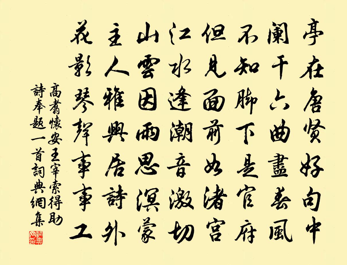 詩詞名句歷史字典書法欣賞書法字典國語詞典說文解字康熙字典古漢語字典標 題 作 者 詩 句 懷安王宰索得助詩奉題一首作者:高翥 朝代:宋代懷安王宰索得助詩奉題一首原文亭在唐賢好句中,闌乾六曲盡春風。不知腳下是官府,但見面前如渚宮。江水逢潮音激切,山雲因雨思溟濛。主人雅興居詩外,花影琴聲事事工。詩詞問答問:懷安王宰索得助詩奉題一首的作者是誰?答:高翥問:懷安王宰索得助詩奉題一首寫於哪個朝代?答:宋代高翥懷安王宰索得助詩奉題一首書法欣賞懷安王宰索得助詩奉題一首書法作品詩詞推薦憶三山陸游〔宋代〕柳橋南北弄煙霏,門不常關客自稀。遣仆遠馱黃檗出,呼兒閒取白鷗歸。片雲忽起迷丹灶,潦水初生沒釣磯。一出和禪月大師見贈羅隱〔唐代〕高僧惠我七言詩,頓豁塵心展白眉。秀似谷中花媚日,清如潭底月圓時。應觀法界蓮千葉,肯折人間桂一支。漂蕩正月四日大雨不已愈暖不寒方回〔宋代〕吳山勝概甲杭州,正旦晴明到上頭。紅袖南人簪翡翠,金鞍北客驟驊騮。豐年似覺春尤好,新歲何為雨不休。自笑偈頌二百零五首釋正覺〔宋代〕陰極而陽生,力窮而位轉。蒼龍退骨而驤,玄豹披霧而變。要將三世佛髑髏,穿作數珠子一穿。莫道明頭暗頭,真蛾眉亭華岳〔宋代〕天邊新月覆雙彎,翠斂雲濃特地寒。我意兩山皆土木,詩人浪作有情看。勉愛行二首送小季之廬山·其二李賀〔唐代〕別柳當馬頭,官槐如兔目。欲將千里別,持此易斗粟。南雲北雲空脈斷,靈台經絡懸春線。青軒樹轉月滿床,下國十一月七日雪中聞宋中道與其內祥源觀燒香梅堯臣〔宋代〕三日不相見,逢人問始知。同車侵朔雪,臨水拜靈龜。絮撲鴛鴦帶,花團蛺蝶枝。如何東郭叟,足跡自穿綦。應天長(柳浪聞鶯)張矩〔宋代〕翠迷倦舞,紅駐老妝,流鶯怕與春別。過了禁菸寒食,東風顫環鐵。遊人恨,柔帶結。更喚醒、羽喉宮舌。畫橋遠九月二十日微雪懷子由弟二首蘇軾〔宋代〕岐陽九月天微雪,已作蕭條歲暮心。短日送寒砧杵急,冷官無事屋廬深。愁腸別後能消酒,白髮秋來已上簪。近買避地傷春六絕句葛立方〔宋代〕菖葉青青杏蕊新,牛耕白水一犁勻。蒨裙窺愛疏籬晚,不是沉香倚太真。秋寄從兄賈島(一作秋夜宿西林寄賈島)無可〔唐代〕螟蟲喧暮色,默思坐西林。聽雨寒更徹,開門落葉深。昔因京邑病,並起洞庭心。亦是吾兄事,遲回共至今。南鄉子劉志淵〔元代〕七返降真陰。主換為賓力不禁。神妙崢嶸三界外,俄臨。徹地通天耀古今。當體慮沉沉。鶴馭清風一片心。自北自西園十詠琴壇吳中復〔宋代〕瀟灑琴壇上,賢侯養道情。無今亦無古,求意不求聲。林邃風初靜,雲收月乍明。拂弦成一弄,塵思浩然清。達磨大師贊釋普濟〔宋代〕五一竺國,東震旦土。傳佛心宗,無本可據。無本據,一葦橫趨,大江東去。白醉樓鑰〔宋代〕處世難獨醒,時作映檐醉。年少足裘馬,安知老夫味。天梳與日帽,且免供酒事。謫居幸三適,得此更慙愧。向來懷素上人草書歌佚名〔唐代〕吾觀文士多利用,筆精墨妙誠堪重。身上藝能無不通,就中草聖最天縱。有時興酣發神機,抽毫點墨縱橫揮。風聲送王龍圖守荊南王安石〔宋代〕壯志高才偃一藩,更嗟賢路此時難。長幡欲動何妨屈,老驥能行豈易閒。沙市放船寒月日,渚宮留御古苔斑。知公小軒生日張埴〔宋代〕玉宇風清金莖,露爽五日新秋。正好小軒相逢,初度七十邊頭。柳梢青佚名〔宋代〕家近閩南。三姑姊妹,秀揖仙岩。須女精神,玉卮標格,謫下塵凡。他時佳婿成雙,紅絲應牽第三。倚看樽前,團題白馬驛薛逢〔唐代〕晚麥芒乾風似秋,旅人方作蜀門游。家林漸隔梁山遠,客路長依漢水流。滿壁存亡俱是夢,百年榮辱盡堪愁。胸中名句推薦雲銷雨霽,彩徹區明。王勃《滕王閣序》 惟天下至誠,為能盡其性。宋祁、歐陽修、范鎮、呂夏卿等《新唐書·列傳·卷八十二》 疏是枝條艷是花,春妝兒女競奢華。曹雪芹《詠紅梅花得“花”字》 對茲佳品酬佳節,桂拂清風菊帶霜。曹雪芹《螃蟹詠》 梅花大庾嶺頭髮,柳絮章台街里飛。李商隱《對雪二首》 倉無備粟,不可以待凶飢。墨子《墨子·05章 七患》 採菊東籬下,悠然見南山。陶淵明《飲酒·其五》 何時倚虛幌,雙照淚痕乾。杜甫《月夜》 碧野朱橋當日事,人不見,水空流。秦觀《江城子·西城楊柳弄春柔》 岱宗夫如何?齊魯青未了。杜甫《望岳》