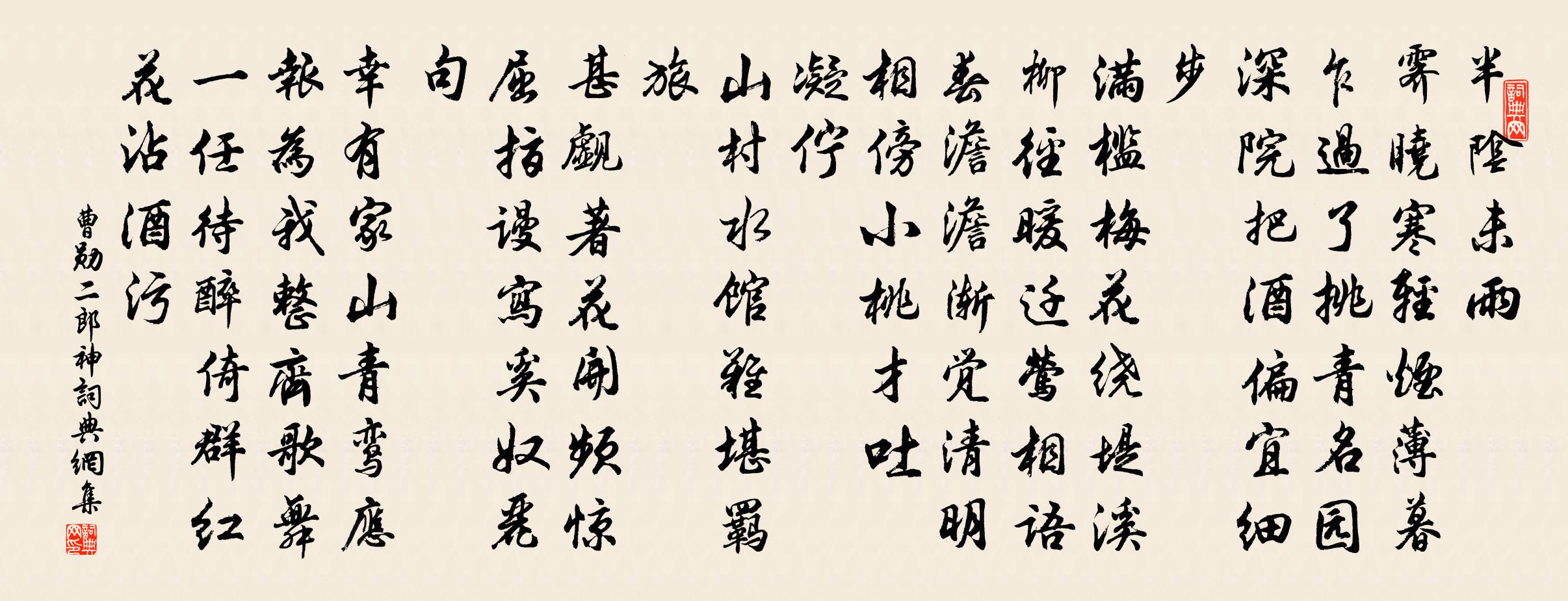 詩詞名句歷史字典書法欣賞書法字典國語詞典說文解字康熙字典古漢語字典標 題 作 者 詩 句 二郎神作者:曹勛 朝代:宋代二郎神原文半陰未雨。霽曉寒、輕煙薄暮。乍過了挑青,名園深院,把酒偏宜細步。滿檻梅花,繞堤溪柳,徑暖遷鶯相語。春澹澹,漸覺清明,相傍小桃才吐。凝佇。山村水館,難堪羈旅。甚覷著花開,頻驚屈指,謾寫奚奴麗句。幸有家山,青鸞應報,為我整齊歌舞。一任待,醉倚群紅,花沾酒污。詩詞問答問:二郎神的作者是誰?答:曹勛問:二郎神寫於哪個朝代?答:宋代問:二郎神是什麼體裁?答:詞曹勛二郎神書法欣賞二郎神書法作品詩詞推薦端午貼子詞皇后閣五首真德秀〔宋代〕民一念渾徹淵泉,內府時時出禁錢。只此自添無量壽,何須彩索頌長年。西峴峰黃溍〔元代〕層雲抱春城,急瀨泄嵌竇。修蹊入窈窕,眾綠郁以茂。名亭標水樂,折柱荒碑仆。幽尋得緇廬,亂石扶結構。青精東陽杜季高遠訪詩以送之陳傅良〔宋代〕當世關衰壯,斯文看合離。強餐吾豈敢,後會子何期。村落秋彌好,溪山晚最宜。逢人相問訊,所欠更能詩。朝中措(同前代御帶作)曾覿〔宋代〕功名雖未壓英游。一種舊風流。人世百年須到,如今七十春秋。當時帷幄,貂璫貴重,譽藹朋儔。贏得尊前沈醉,鹿鳴宴中走筆呈林教授岳珂〔宋代〕 * 催龍浪,朋來盛鹿賓。淵源識餘潤,騰踏已通津。融帳知方盛,陸莊應未貧。成功豈無日,況復值詞人。贈春遊侶李昌符〔唐代〕密林多暗香,輕吹送余芳。啼鳥愁春盡,遊人喜日長。浮雲橫暮色,新雨洗韶光。欲散垂□恨,應須入醉鄉。偈頌七十六首釋師範〔宋代〕去時萬木含愁色,歸日千峰展笑容。此意此心知有自,一爐香爇散天風。送王南強赴紹興簽幕四首陳傅良〔宋代〕人人尊孔孟,家家誦詩書。未省有宇宙,孰與今多儒。儒者道如砥,豈其自崎嶇。申以黃老廢,賈以絳灌疎。漢家峴潭(山)作孟浩然〔唐代〕石潭傍隈隩,沙榜曉夤緣。試垂竹竿釣,果得查頭鯿。美人騁金錯,縴手膾紅鮮。因謝陸內史,蓴羹何足傳。應謝主簿騷體江淹〔南北朝〕山欞靜兮悲凝涼。澗軒掩兮酒涵霜。曾風激兮綠苹斷。積石閉兮紫苔傷。芝原寂少色。筠庭黯無光。沐予冠於極浦次韻韓川奉祠西太乙宮四首黃庭堅〔宋代〕白髦下金神節,青祝攜御爐香。百禮盡修亳祀,九歌不取沈湘。品令歐陽修〔宋代〕漸素景。金風勁。早是淒涼孤冷。那堪聞、蛩吟穿金井。喚愁緒難整。懊惱人人薄倖。負雲期雨信。終日望伊來,送劉貢甫謫官衡陽王安石〔宋代〕劉郎劉郎莫先起,遇酒當歌且歡喜。船頭朝轉暮千里,眼中之人吾老矣。九疑聯綿皆相似,負雪崔嵬插花里。萬里癸丑年下第獻新先輩韋莊〔唐代〕五更殘月省牆邊,絳旆蜺旌卓曉煙。千炬火中鶯出谷,一聲鍾後鶴沖天。皆乘駿馬先歸去,獨被羸童笑晚眠。對酒次韻劉元煇初寒夜坐並序方回〔宋代〕山肩寒聳月隨歸,榾柮爐紅閉板扉。跨灶郎來濕課冊,齊眉人為摺深衣。花傳喜信燈如語,草就佳篇字欲飛。舊日阮郎歸石孝友〔宋代〕燭花吹盡篆煙青。長波拍枕鳴。西風吹斷雁鴻聲。離人夢暗驚。鄉思動,旅愁生。誰知此夜情。亂山重疊擁孤城。謝翁子履子進惠詩二首曾協〔宋代〕聯翩連璧扣柴荊,剝啄初開屣履迎。華袞借褒知不稱,累珠入手見須驚。長篇勢欲傾三峽,古調聲堪被四清。聊遣點絳唇應次蘧〔宋代〕雪意嬌春,臘前妝點春風面。粉痕冰片。一笑重相見。倚竹偎松,誰道羅浮遠。寒更轉。楚騷為伴。韻繞香篝暖。次韻吳竹修發慈雲陳著〔宋代〕入山知幾約,手墨未曾乾。危世一游重,清交百念寒。吟成佳句易,說到太平難。終夜飲不醉,何從得睡鼾。江城口號二首董嗣杲〔宋代〕此郡境有彭澤縣,淵明曾遺晉時蹤。三徑莫知在何處,且撫官圃千尺松。名句推薦商人重利輕別離,前月浮梁買茶去。白居易《琵琶行 / 琵琶引》 因風吹火,用力不多。佚名《增廣賢文·上集》 秋陰時晴漸向暝,變一庭淒冷周邦彥《關河令·秋陰時晴漸向暝》 余亦赴京國,何當獻凱還。孟浩然《送陳七赴西軍》 富貴不能淫,貧賤不能移,威武不能屈。此之謂大丈夫。孟子《孟子·滕文公章句下·第二節》 東風吹雨過青山,卻望千門草色閒。盧綸《長安春望》 玉輪碾平芳草,半面惱紅妝。陳子龍《訴衷情·春遊》 唯器與名,不可以假人左丘明《左傳·成公·成公二年》 天涯海角悲涼地,記得當年全盛時。趙鼎《鷓鴣天·建康上元作》 入則無法家拂士,出則無敵國外患者,國恆亡。孟子及其弟子《生於憂患,死於安樂》