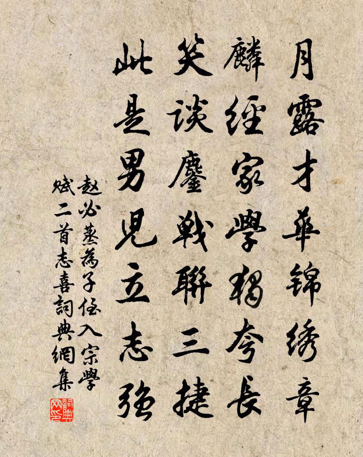 詩詞名句歷史字典書法欣賞書法字典國語詞典說文解字康熙字典古漢語字典標 題 作 者 詩 句 為子侄入宗學賦二首誌喜作者:趙必蒸 朝代:宋代為子侄入宗學賦二首誌喜原文月露才華錦繡章,麟經家學獨夸長。笑談鏖戰聯三捷,此是男兒立志強。詩詞問答問:為子侄入宗學賦二首誌喜的作者是誰?答:趙必蒸問:為子侄入宗學賦二首誌喜寫於哪個朝代?答:宋代趙必蒸為子侄入宗學賦二首誌喜書法欣賞為子侄入宗學賦二首誌喜書法作品詩詞推薦水龍吟劉辰翁〔宋代〕孤煙澹澹無情,角聲正送層城暮。傷懷絕似,龍山罷後,騎台沉處。珠履三千,金人十二,五陵無樹。嘆岐王宅里我愛淳安好陳曄〔宋代〕我愛淳安好,憂民缺致盈。渠通廬避濕,灘鑿浪難生。利涉津梁固,安行道路平。夙宵雖龜勉,終愧漢公卿。嵩山十志十首樾館盧鴻一〔唐代〕紫岩隈兮青谿側,雲松煙蔦兮千古色。芳靃蘼兮蔭蒙蘢,幽人構館兮在其中。靃蘼蒙蘢兮開樾館,臥風霄兮坐霞旦題武侯廟李復〔宋代〕梁甫高吟一幅巾,聯翩眾盜肯同群。久蟠丘壑雖龍臥,默計江山已鼎分。庸蜀欲開來日月,隆中先見會風雲。雜耕酒中十詠酒壚皮日休〔唐代〕紅壚高几尺,頗稱幽人意。火作縹醪香,灰為冬醷氣。有槍盡龍頭,有主皆犢鼻。倘得作杜根,傭保何足愧。秋蕊香晏殊〔宋代〕梅蕊雪殘香瘦。羅幕輕寒微透。多情只是春楊柳。占斷可憐時候。蕭娘勸我杯中酒。翻紅袖。金烏玉兔長飛走。爭湯總管邢監廟約游城東酒間求詩為賦此張栻〔宋代〕春事已如許,客愁空自多。梅花成莫逆,樽酒付亡何。楚楚邢郎子,眈眈老伏波。定應容我醉,耳熱更高歌。泮水佚名〔先秦〕思樂泮水,薄采其芹。魯侯戾止,言觀其旂。其旂茷茷,鸞聲噦噦。無小無大,從公於邁。思樂泮水,薄采其藻。漫興艾性夫〔宋代〕凍耳蕭蕭天欲霜,冬深門巷意蒼涼。一筇徑為梅花出,獨立斜陽影正長。布袋贊釋子益〔宋代〕布袋橫拖,肚皮捺下。行貨有些,沒人酬價。拊背覓錢真奉化。錦山自杭來詩呈鄉曲共舉月集衛宗武〔宋代〕歲月易以邁,羲娥不停旋。憶昔聚嬉戲,縞發今盈顛。日往而月來,壯逝老至焉。交情貴浹洽,良辰忍棄捐。簪舄菩薩蠻(送祐之弟歸浮梁)辛棄疾〔宋代〕無情最是江頭柳。長條折盡還依舊。木葉下平湖。雁來書有無。雁無書尚可。妙語憑誰和。風雨斷腸時。小山生桂孤山寺林逋〔宋代〕雲峰水樹南朝寺,祇隔叢篁作並鄰。破殿靜披虀臼古,齋房閒試酷奴春。白公睡閣幽如畫,張祜詩牌妙入神。乘興閒房書事示五弟及諸侄等獻肅公韓維〔宋代〕老病歸休得桶樓,吾廬蕭酒樂天倪。北窗偃臥都何有,東閣過從亦自揆。碧檜輕煙無鳥哢,綠槐風細或蟬嘶。世間長安里中聞猿吳融〔唐代〕夾巷重門似海深,楚猿爭得此中吟。一聲紫陌才回首,萬里青山已到心。慣倚客船和雨聽,可堪侯第見塵侵。無因西江月(立春)翁元龍〔宋代〕畫閣換粘春帖,寶箏拋學銀鉤。東風輕滑玉釵流。纖就燕紋鶯繡。隔帳燈花微笑,倚窗雲葉低收。雙鴛刺罷底尖頭山齋陳與義〔宋代〕雖愧荷鉏叟,朝來亦不閒。自剪牆角樹,盡納溪西山。經行天下半,送老此途間。日暮煙生嶺,離離飛鳥還。送衣曲王建〔唐代〕去秋送衣渡黃河,今秋送衣上隴坂。婦人不知道徑處,但問新移軍近遠。半年著道經雨濕,開籠見風衣領急。舊來江上阻風鄭谷〔唐代〕水天春暗暮寒濃,船閉篷窗細雨中。聞道漁家酒初熟,晚來翻喜打頭風。過長峰逕遇雨,遣悶十絕句楊萬里〔宋代〕何須人跡到來曾,點汗松風澗水聲。不是先生愛山水,是間卻遣阿誰行。名句推薦故人江海別,幾度隔山川。司空曙《雲陽館與韓紳宿別》 潮平兩岸闊,風正一帆懸。王灣《次北固山下》 醉別江樓橘柚香,江風引雨入舟涼。王昌齡《送魏二》 巴山楚水淒涼地,二十三年棄置身。劉禹錫《酬樂天揚州初逢席上見贈》 勾引東風,也知芳思難禁。韓疁《高陽台·除夜》 誰念文園病客?夜色沉沉,獨抱一天岑寂。張埜《奪錦標·七夕》 善惡同,則功臣倦。黃石公《三略·上略》 借問承恩者,雙蛾幾許長?皇甫冉《婕妤怨》 春花秋月何時了?往事知多少。李煜《虞美人·春花秋月何時了》 柔情似水,佳期如夢,忍顧鵲橋歸路。秦觀《鵲橋仙·纖雲弄巧》