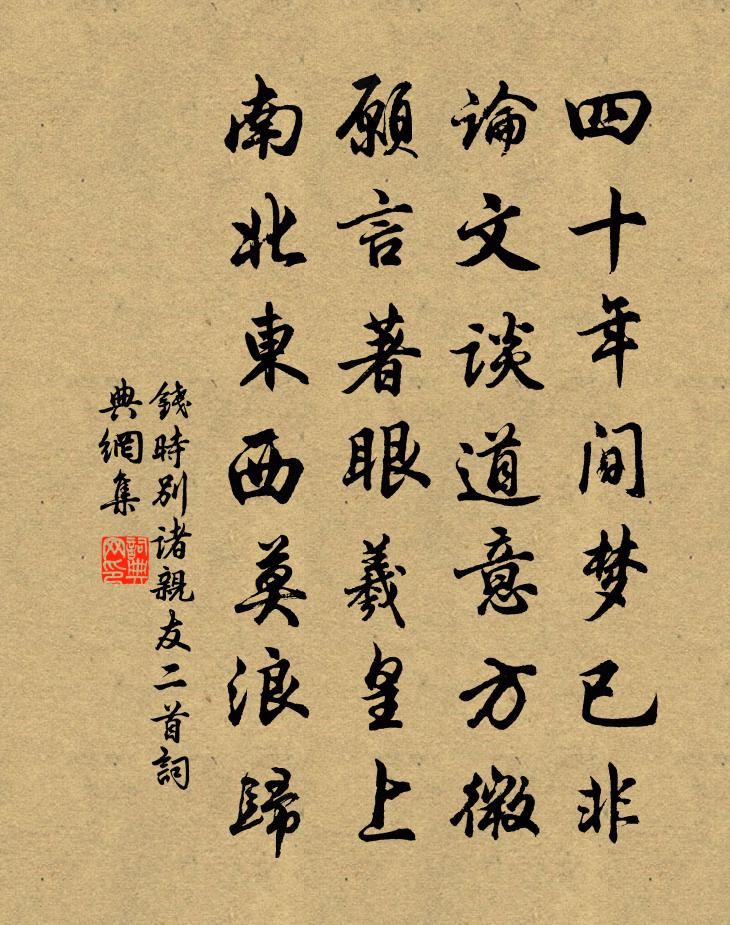 詩詞名句歷史字典書法欣賞書法字典國語詞典說文解字康熙字典古漢語字典標 題 作 者 詩 句 別諸親友二首作者:錢時 朝代:宋代別諸親友二首原文四十年間夢已非,論文談道意方微。願言著眼羲皇上,南北東西莫浪歸。詩詞問答問:別諸親友二首的作者是誰?答:錢時問:別諸親友二首寫於哪個朝代?答:宋代錢時別諸親友二首書法欣賞別諸親友二首書法作品詩詞推薦次韻子夷兄弟十首張耒〔宋代〕金馬聊代耕,淺郎亦為官。何必歌五噫,遭非如伯鸞。物生各自遂,蕭艾與芝蘭。詩人亦多事,屑屑計鶉貆。山居雜詩九十首曹勛〔宋代〕得閒一何樂,佳處先徜徉。每扣隱逸士,屢過清靜坊。地僻干戈遠,年豐禾稻香。訪我亦何所,南澗與東岡。聞虜政衰亂掃蕩有期喜成口號陸游〔宋代〕遺虜遊魂豈足憂,漢家方運幄中籌。天開地辟逢千載,雷動風行遍九州。刁斗令嚴青海夜,旌旗色照鐵關秋。功名賢者之孝二百四十首盛彥林同〔宋代〕既知為異物,號泣絕還生,未有蠐螬炙,翻令母目明。蘇叔黨呂知止許下見訪叔黨有詩戲贈以此奉答張耒〔宋代〕三年齊安有江山,可當中原故人面。北來塵埃逢故人,眼前郄作江山見。君似江山定不疏,能出吾言世亦無。蘇郎辭饋金高登〔宋代〕劉君政成□□□,闔境歡謠騰載道。民不見吏犬無聲,持以百錢勤父老。嗟我官卑志未伸,於人何德人稱好。騰牒用元韻答李郎中王炎〔宋代〕未問仙家九節蒲,且持茗碗對熏爐。黃冠也肯迎留客,咀嚼梅花費一壺。火杜甫〔唐代〕楚山經月火,大旱則斯舉。舊俗燒蛟龍,驚惶致雷雨。爆嵌魑魅泣,崩凍嵐陰昈。羅落沸百泓,根源皆萬古。青林句劉筠〔宋代〕右墄獨登溫樹密,前旌雙抗嶺雲高。情詩其十六倉央嘉措〔清代〕昨趁夜色赴幽期,鵝羽紛紛曉來迷。兩行屐痕深雪裡,教人如何不得知?送友人南歸王貞白〔唐代〕南國菖蒲老,知君憶釣船。離京近殘暑,歸路有新蟬。峴首白雲起,洞庭秋月懸。若教吟興足,西笑是何年。布袋和尚贊三首釋智朋〔宋代〕一肩擔荷非輕,是什麼破落索。雖然顧後瞻前,不知打失樓閣。與王德強王冕〔元代〕阿伯遷官之五羊,嚴尊習隱水南莊。人生出處故有分,世道如斯徒自忙。笑我漂流雙□雪,羨君奔走滿靴霜。功名驀山溪(九日)曹冠〔宋代〕年年九日,萸菊登高宴。今歲旅新豐,聽征雁、吟蛩幽怨。行行游賞,邂逅得詩人,呼斗酒,發清吟,豪氣凌霄漢題上虞蘭芎山陳堯佐〔宋代〕岩岩一峰千萬尋,微茫樓閣寒雲深。巡州佐吏倚欄久,泠泠天籟清塵心。野次遇雨王炎〔宋代〕木末雲屯飛雨暗,柳梢水到水溪深。身隨王事有行役,家在江南無信音。但得林泉堪著眼,莫將軒冕更關心。拂衣盧龍塞行送韋掌記錢起〔唐代〕雨雪紛紛黑山外,行人共指盧龍塞。萬里飛沙咽鼓鼙,三軍殺氣凝旌旆。陳琳書記本翩翩,料敵張兵奪酒泉。聖主醉蓬萊 九月十八日西虢劉氏醮丘處機〔元代〕乍三清鶴降,萬里雲收,昊天空翠。玉磬琅琅,動乾坤聲銳。盡日修齋,虛堂設醮,慶大仙恩惠。滿獻霞觥,長歌聽政陳造〔宋代〕為政貴中和,偏徇古無取。無心斯善應,奸譽乃其蠹。柰何聞見間,往往用心誤。扶弱抑其強,古或垂此譽。世異觀山燈獻徐尚書段成式〔唐代〕風杪影凌亂,露輕光陸離。如霞散仙掌,似燒上峨嵋。道樹千花發,扶桑九日移。因山成眾像,不復藉蟠螭。湧出名句推薦史有三長:才、學、識。宋祁、歐陽修、范鎮、呂夏卿等《新唐書·列傳·卷五十七》 游女昔解佩,傳聞於此山孟浩然《萬山潭作》 料有牽情處,忍思量、耳邊曾道。時彥《青門飲·寄寵人》 從善如順流,去惡如探湯。房玄齡《晉書·列傳·第五十七章》 越鳥巢乾後,歸飛體更輕。李商隱《晚晴》 繁采寡情,味之必厭。劉勰《文心雕龍·情采》 天闕象緯逼,雲臥衣裳冷杜甫《游龍門奉先寺》 去年今日此門中,人面桃花相映紅。崔護《題都城南莊》 知者不言,言者不知。老子《老子·德經·第五十六章》 路入南中,桄榔葉暗蓼花紅。歐陽炯《南鄉子·路入南中》