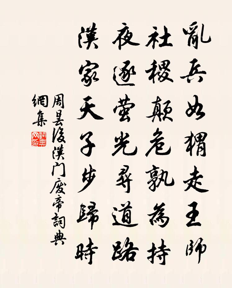 詩詞名句歷史字典書法欣賞書法字典國語詞典說文解字康熙字典古漢語字典標 題 作 者 詩 句 後漢門廢帝作者:周曇 朝代:唐代後漢門廢帝原文亂兵如蝟走王師,社稷顛危孰為持。夜逐螢光尋道路,漢家天子步歸時。詩詞問答問:後漢門廢帝的作者是誰?答:周曇問:後漢門廢帝寫於哪個朝代?答:唐代周曇後漢門廢帝書法欣賞後漢門廢帝書法作品注釋全唐詩:卷729-28詩詞推薦踏莎行王哲〔元代〕說修持,文詞雅。生玉璧光輝射。中交煥汞和鉛,傳甲木唯惺灑。火翁婆,男不寫。公別指清涼話。根甘液是真因蒙求李瀚〔唐代〕王戎簡要,裴楷清通。孔明臥龍,呂望非熊。楊震關西,丁寬易東。謝安高潔,王導公忠。匡衡鑿壁,孫敬閉戶。偈頌一百四十一首釋師範〔宋代〕縱無所畏,說大脫空。雖有希求,辨最上供。除婦服詩孫楚〔魏晉〕時邁不停。日月電流。神爽登遐。忽已一周。禮制有敘。告除靈丘。臨祠感痛。中心若抽。奉和襲美酬前進士崔潞盛制見寄因贈至一百四陸龜蒙〔唐代〕孔聖鑄顏事,垂之千載余。其間王道乖,化作荊榛墟。天必授賢哲,為時攻翦除。軻雄骨已朽,百代徒趑趄。近者最明寺殿悟道後贈之助道頌五首釋普寧〔宋代〕悟了還同未悟時,著衣吃飯順時宜。起居動靜曾無別,始信拈花第二機。題梅山雲悅樓胡宏子〔宋代〕世人之所悅,多在紛華間。毛仙得趣處,白雲滿青山。飛樓俯空曠,登眺長怡顏。跡與雲俱高,心與雲俱閒。八極春情四首高翥〔宋代〕樓頭上馬苦匆匆,百計相留無計從。正好看花郎卻去,江邊春色為誰濃。古意蒿上為徐子宜侍郎賦劉過〔宋代〕桃李多芳妍,開落如春風。吒身終自天,花不百日紅。殘月望朝日,各自相西東。為君整儀容。照水不照鏡。為君岐亭五首蘇軾〔宋代〕酸酒如虀湯,甜酒如蜜汁。三年黃州城,飲酒但飲濕。我如更揀擇,一醉豈易得。幾思壓茅柴,禁網日夜急。西鄰遣興陸游〔宋代〕西州落魄九年余,濯錦江頭已結廬。誰遣徑歸朝鳳闕,不令小住奉魚書。塵埃眯目詩情盡,疾病侵人酒興疏。寄語過裴長官新亭錢起〔唐代〕茅屋多新意,芳林昨試移。野人知石路,戲鳥認花枝。慢水縈蓬戶,閒雲掛竹籬。到家成一醉,歸馬不能騎。從厚卿乞移水仙花韓維〔宋代〕翠葉亭亭出素房,遠分奇艷自襄陽。琴高住處元依水,青女冬來不怕霜。異土花蹊驚獨秀,同時梅援失幽香。當年寄題西洛致仕張比部靜居院四堂梅堯臣〔宋代〕張侯歸靜居,堂宇結四隅。堂中何所有,書畫羅簽廚。四堂各異名,名異義亦殊。夷心與會真,內以道德娛。清白絕句楊杞〔宋代〕三間茅屋獨家村,風雨蕭蕭可斷魂。舊日相如猶有壁,如今無壁更無門。新居感詠杜衍〔宋代〕無似老且病,惟恐歸田遲。一旦得引年,九天還聽卑。尚沾二品祿,俾盡百年期。恩深淪骨髓,感極橫涕洟。始營除夜侍酒呈諸兄示舍弟歐陽詹〔唐代〕莫嘆明朝又一春,相看堪共貴茲身。悠悠寰宇同今夜,膝下傳杯有幾人。新秋早起有懷元少尹白居易〔唐代〕秋來轉覺此身衰,晨起臨階盥漱時。漆匣鏡明頭盡白,銅瓶水冷齒先知。光陰縱惜留難住,官職雖榮得已遲。老去自房州歸掌口聞杜鵑時杜鵑花盛開張嵲〔宋代〕亂中一任青春去,只有閒愁和鬢華。日暮風吹古原樹,杜鵑啼遍滿林花。句晏殊〔宋代〕素奈發時俱北虜,白榆開處欲爭妍。名句推薦愛棄發之費,而忘長發之利,不知權者也。韓非及後人《韓非子·六反》 淥水淨素月,月明白鷺飛。李白《秋浦歌十七首》 故人不可見,新知萬里外。文天祥《端午即事》 邊雪藏行徑,林風透臥衣。賈島《送鄒明府游靈武》 一看腸一斷,好去莫回頭。白居易《南浦別》 東風灑雨露,會入天地春。李白《送郄昂謫巴中》 暗燈涼簟怨分離,妖姬,不勝悲。閻選《河傳·秋雨》 父母教,須敬聽。父母責,須順承。李毓秀《弟子規·入則孝》 憑闌半日獨無言,依舊竹聲新月似當年。李煜《虞美人·風回小院庭蕪綠》 佇久河橋欲去,斜陽淚滿。吳文英《三姝媚·過都城舊居有感》