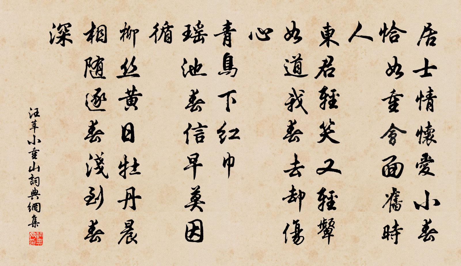 詩詞名句歷史字典書法欣賞書法字典國語詞典說文解字康熙字典古漢語字典標 題 作 者 詩 句 小重山作者:汪莘 朝代:宋代小重山原文居士情懷愛小春。恰如重會面,舊時人。東君輕笑又輕顰。如道我,春去卻傷心。青鳥下紅巾。瑤池春信早,莫因循。柳絲黃日牡丹晨。相隨逐,春淺到春深。詩詞問答問:小重山的作者是誰?答:汪莘問:小重山寫於哪個朝代?答:宋代問:小重山是什麼體裁?答:詞汪莘小重山書法欣賞小重山書法作品詩詞推薦蕃艤舟湘西之明夕鄭仲理吳德夫周伯壽黎季成趙蕃〔宋代〕情親獨數君。贈詩難卒和,別酒易成醺。渺渺江山恨,飄飄鴻雁群。不忘相博約,未可間知聞。晚歸府白居易〔唐代〕晚從履道來歸府,街路雖長尹不嫌。馬上涼於床上坐,綠槐風透紫蕉衫。白首陸游〔宋代〕白首歸來老故園,索居情味更堪論!關河悠邈夢魂到,親舊凋零書札存。身病自憐詩思退,家貧客笑酒醅渾。昏昏挽叔祖戶部侍郎詩四首張鎡〔宋代〕從此無因見,南園老叔翁。朝廷世臣少,文獻我家窮。達宦誰無分,全材不易逢。先生勛第一,號慟仰天公。施南路偶書王周〔唐代〕大石嶺頭梅欲發,南陵陂上雪初飛。苦無酒解愁成陣,又附蘭橈向秭歸。入白水次韻劉漫其詩劉子翬〔宋代〕南山北山舊經行,諸劉相看如弟兄。一枰圍棋果敵國,五字琢句真長城。濁醪粗飯有餘樂,小几疏簾何太清。我來司空平章軍國事贈太師開國正獻呂公輓辭五首蘇頌〔宋代〕運偶千齡旦,家傳萬石風。五朝京兆尹,三世大司空。致主唐虞上,論經伏鄭中。生鍾維岳瑞,葬復近神崧。次酬陳雲谷劉黻〔宋代〕書空咄咄懶題詩,深愧敲門客問奇。向晚小窗閒遠眺,西風吹霧出秋峗。鹿鳴燕陳造〔宋代〕亂山森立圍古房,重碧疊青天與長。鍾奇孕秀為雋良,有如六子爭軒昂。胸次襞積雲錦章,漢之晁董唐常楊。當日用韻謝前人文天祥〔宋代〕茲游良邂逅,吾道未逶遲。斗野橫雙劍,牛津直兩旗。此風應小住,明日便相思。輸與君家近,扶桑五色曦。辭洞齋華父二劉兄惠寒衣謝枋得〔宋代〕平生愛讀龔勝傳,進退存亡斷得明。范叔綈袍雖見意,大顛衣服莫留行。此時要看英雄樣,好漢應無兒女情。只願尤溪縣之南李花千樹無一雜木春時嘗飲其中酒朱槔〔宋代〕見說小軒久,無人喚我來。直如春力快,故遣客懷開。玉立花千樹,霞翻酒一杯。江陵二月尾,襟韻信難陪。補樂歌十首網罟元結〔唐代〕吾人苦兮,水深深。網罟設兮,水不深。吾人苦兮,山幽幽。網罟設兮,山不幽。中秋前夕三首方回〔宋代〕稍穿疏樹殘光碎,徐碾晴空素艷流。交過子時是明日,攙先半夜賞中秋。句釋惠崇〔宋代〕露館濤驚枕,空庭月伴琴。南康趙明府贈予四詩和其首篇二首劉克莊〔宋代〕二老風流接見聞,餘香未遠尚堪薰。明師豈不使人巧,老僕安能重子文。策蹇何由追抹電,化龍吾亦願為雲。從來頌古二十四首釋勝〔宋代〕驅耕夫牛照即用,奪飢人食用即照。不得同參把手行,安知袖裡有穿竅。吊張道從郭印〔宋代〕風俗久頹壞,人物無軒昂。夫君抱貞質,卓卓誠所長。千牛解寸刃。萬象窮智囊。獸群走麒麟,鳥族鳴風凰。炎政和雲心除夕韻胡仲弓〔宋代〕歲除明日是,心事落梅邊。節物催雙鬢,情懷欠少年。桃符依帖寫,竹爆應聲圓。椒頌無人獻,酴酥亦自煎。點絳唇(六月十四日夜,與社友泛湖過西陵橋,已子夜矣)史達祖〔宋代〕山月隨人,翠苹分破秋山影。釣船歸盡。橋外詩心迥。多少荷花,不蓋鴛鴦冷。西風定。可憐潘鬢。偏浸秦台鏡。名句推薦今夕不登樓,一年空過秋。高觀國《菩薩蠻·何須急管吹雲暝》 綠陰不減來時路,添得黃鸝四五聲。曾幾《三衢道中》 善惡到頭終有報,只盼來早與來遲。佚名《增廣賢文·上集》 不得乎親,不可以為人;不順乎親,不可以為子。孟子《孟子·離婁章句上·第二十八節》 東飛烏鵲西飛燕。盈盈一水經年見。陳師道《菩薩蠻·七夕》 山光忽西落,池月漸東上。孟浩然《夏日南亭懷辛大》 後其身而身先,外其身而身存。老子《老子·道經·第七章》 胸中有誓深于海,肯使神州竟陸沉?鄭思肖《二礪》 明朝寒食了,又是一年春。顧太清《臨江仙·清明前一日種海棠》 行人莫便消魂去,漢渚星橋尚有期。晏幾道《鷓鴣天·梅蕊新妝桂葉眉》