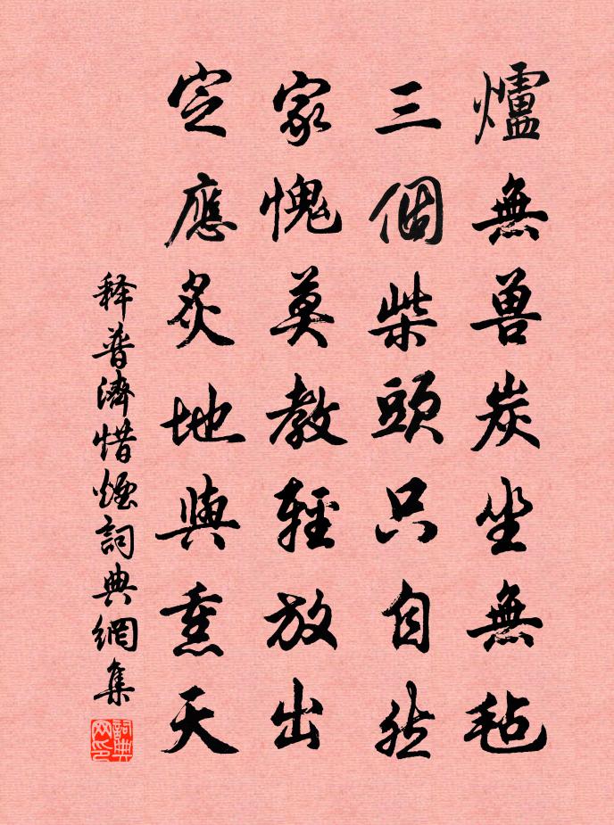 詩詞名句歷史字典書法欣賞書法字典國語詞典說文解字康熙字典古漢語字典標 題 作 者 詩 句 惜煙作者:釋普濟 朝代:宋代惜煙原文爐無獸炭坐無氈,三個柴頭只自然。家愧莫教輕放出,定應炙地與熏天。詩詞問答問:惜煙的作者是誰?答:釋普濟問:惜煙寫於哪個朝代?答:宋代釋普濟惜煙書法欣賞惜煙書法作品詩詞推薦明妃曲陸游〔宋代〕漢家和親成故事,萬里風塵妾何罪?掖庭終有一人行,敢道君王棄蕉萃?雙駝駕車夷樂非,公卿誰悟和戎非!蒲桃同年葛簽挽章周南〔宋代〕少年並馬曲江游,曾到慈恩塔上頭。過眼流光真露電,驚心宦海半沉浮。君今又隔重泉夢,世事嗟傷逝水流。獨立和李公擇赴歷下道中雜詠十二首其十梁山洎見蘇轍〔宋代〕行到平湖意自寬,繁花仍得就船看。回頭卻向吳儂說,從此遠遊心未闌。鶴沖天·清明天氣杜安世〔宋代〕清明天氣,永日愁如醉。台榭綠陰濃,薰風細。燕子巢方就,盆池小,新荷蔽。恰是逍遙際。單袷衣裳,半籠軟玉寄神光末宗和尚釋可湘〔宋代〕萬太神光滌世昏,莫知誰信有乾坤。三山眼底多尊宿,那個來敲老觀門。挽曹泰宇居士三首陳著〔宋代〕匆匆相聚處,未足滿平生。鐙雨對眠夢,花晴攜話行。前盟空在耳,外哭若為情。已矣不可作,高山孤月明。偈頌一百二十三首釋普度〔宋代〕雨洗炎威,秋磨霄漢。風傳{左禾右罷}稏香,鼓腹寒岩畔。位轉功回木馬嘶,劫外不須重借伴。秋懷十首趙蕃〔宋代〕秋林如老發,剩好忽已衰。委身造物中,寧得逭厥時。木落有再榮,人衰無少期。可不思自勉,無聞戒在茲。鷓鴣天佚名〔宋代〕寶炬金蓮一萬條。火龍圍輦轉州橋。月迎仙仗回三殿,風遞韻音下九霄。登復道,聽鳴鞘。再頒酥酒賜臣僚。太平點絳唇張孝祥〔宋代〕萱 * 花,畫堂永晝風清暑。麝團菰黍。助泛菖蒲醑。兵辟神符,命續同心縷。宜歡聚。綺筵歌舞。歲歲酬端午。雨中花令(吳興道中,頗厭行役,作此曲寄武林交舊)周紫芝〔宋代〕山雨細、泉生幽谷,水滿平田。雪繭紅蠶熟後,黃雲隴麥秋間。武陵煙暖,數聲雞犬,別是山川。嗟老去、倦遊蹤逍遙詠宋太宗〔宋代〕何人曉了是兼非,鉛汞從凡隱聖機。福壽丹砂隨日變,長生藥鼎負龍威。秦皇漢武終邪見,大道神仙在杳微。學似宿歸仁寺張嵲〔宋代〕精藍置屋切雲根,此地何從著世紛。縹緲僧窗更臨水,氛氳崖樹欲參雲。青山細認千重疊,暮氣徐觀萬里曛。兩岸閒記老境陸游〔宋代〕嫌鬧不入市,怕寒稀出門。擁爐愁兀兀,投枕睡昏昏。柳色新如染,梅花香滿村。猶嗟未免俗,薄酒誑空樽。頻夜夢至南鄭小益之間慨然感懷陸游〔宋代〕客枕夢遊何處所,梁州西北上危台。雪雲不隔平安火,一點遙從駱谷來。西園堂榭落成種植畢工偶成口號十首呈參政張周麟之〔宋代〕草木青歸二月天,川原明媚發春妍。臨流忽見寒梅影,皎若凌波洛浦仙。田上崔道融〔唐代〕雨足高田白,披蓑半夜耕。人牛力俱盡,東方殊未明。杖錫虎戴表元〔宋代〕杖錫山中深,與世絕往學。從來稱是仙聖窟,虎暴不得奸其間。今年山神大失職,虎來山前搏人食。傳聞此義我亦偶成馮去非〔宋代〕春風吹送笑談香,玉漏銀燈破夜涼。歸去東華聽宮漏,杏花落盡六更長。僧舍二首趙嘏〔唐代〕只言雙鬢未蹉跎,獨奈牛羊送日何。禪客不歸車馬去,晚檐山色為誰多。溪上禪關水木間,水南山色與僧閒。春風名句推薦採桑秦氏女,織錦竇家妻。薛道衡《昔昔鹽》 黃葉覆溪橋,荒村唯古木。柳宗元《秋曉行南谷經荒村》 舌為利害本,口是禍福門。馮夢龍《醒世恆言·卷二十九》 紅葉晚蕭蕭,長亭酒一瓢。許渾《秋日赴闕題潼關驛樓 / 行次潼關逢魏扶東歸》 今夜不知何處宿,平沙萬里絕人煙。岑參《磧中作》 風急桃花也似愁,點點飛紅雨。如晦《楚天遙過清江引·有意送春歸》 應憐屐齒印蒼苔,小扣柴扉久不開。葉紹翁《遊園不值》 鄉國真堪戀,光陰可合輕。白居易《洛橋寒食日作十韻》 山甫歸應疾,留侯功復成。張九齡《奉和聖制送尚書燕國公赴朔方》 捲地風來忽吹散,望湖樓下水如天。蘇軾《六月二十七日望湖樓醉書》