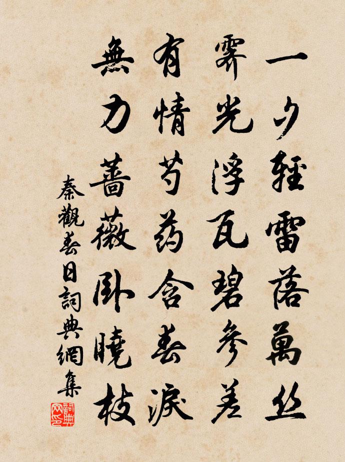 這首詩寫雨後春景。瞧,雨後庭院,晨霧薄籠,碧瓦晶瑩,春光明媚;芍藥帶雨含淚,脈脈含情,薔薇靜臥枝蔓,嬌艷嫵媚。這裡有近景有遠景,有動有靜,有情有姿,隨意點染,參差錯落。全詩運思綿密,描摹傳神,自具一種清新、婉麗的韻味,十分惹人喜愛 詩人捕捉到春雨“萬絲”的特徵,把鏡頭的焦點對準了庭院一角,攝下了一幅雷雨後晴春曉日的精巧畫面。通過對偶形式,擬人手法,襯托庭院的華麗,描繪了芍藥和薔薇百媚千嬌的情態。芍藥亭亭玉立、薔薇攀枝蔓延,故各有“含春淚”之態、“無力臥”之狀。因其體物入微,情致蘊藉,通篇自具一種清新婉麗的韻味,展示了詩人對自然界景物、現象敏銳的觀察力、感受力和攝取力、表現力。在意境上以“春愁”統攝全篇,雖不露一“愁”字,但可從芍藥、薔薇的情態中領悟,又曲折體現了詩人由於宦途艱險而形成的多愁善感的性格。