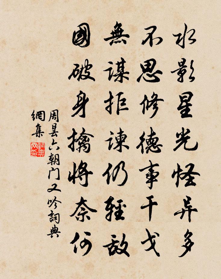 詩詞名句歷史字典書法欣賞書法字典國語詞典說文解字康熙字典古漢語字典標 題 作 者 詩 句 六朝門又吟作者:周曇 朝代:唐代六朝門又吟原文水影星光怪異多,不思修德事干戈。無謀拒諫仍輕敵,國破身擒將奈何。詩詞問答問:六朝門又吟的作者是誰?答:周曇問:六朝門又吟寫於哪個朝代?答:唐代周曇六朝門又吟書法欣賞六朝門又吟書法作品注釋全唐詩:卷729-64詩詞推薦三月十三日夜五更聞杜鵑時成父欲入浙因賦六趙蕃〔宋代〕歸去來兮,斯言可師。我今已歸,胡能不如。滿庭芳(賞梅)葛立方〔宋代〕臘雪方凝,春曦俄漏,畫堂小秩芳筵。玉台仙蕊,簾外冪瑤煙。莫話青山萬樹,聊須對、一段孤妍。杯行處,香參聽早蟬歌耿湋〔唐代〕蟬鳴兮夕曛,聲和兮夏雲。白日兮將短,秋意兮已滿。乍悲鳴兮欲長。猶嘶澀兮多斷。風蕭蕭兮轉清,韻嘒嘒兮初贈聞人必大釋紹嵩〔宋代〕未遂青雲一掛科,科名成後竟如何。貧穎陋巷春偏少,學辦痴龍藝最多。剩把文章鳴新地,卻思猿鳥共煙蘿。高吟留別王元治師中譚純益三首胡寅〔宋代〕幸不當官也去思,春江風日正舒遲。少留畫鷁呼桃葉,卷盡紅螺看柘枝。三爵勸酬三益友,四並除掃四愁詩。渭城古意胡仲弓〔宋代〕溪水滔滔去不回,好花能得幾時開。丁寧莫剪門前竹,留兩三竿待鳳來。寄題蒲氏清風閣范祖禹〔宋代〕閬山錦屏秀,閬水碧玉寒。高閣俯城邑,飛甍出雲端。惟昔隱君子,卜築茲考槃。圖書侔藏室,一一手自刊。山園情詩其三倉央嘉措〔清代〕西風吹謝花成泥,蜂蝶每向香塵泣。情猶未了緣已盡,箋前莫賦斷腸詩。鸚鵡白居易〔唐代〕竟日文還默,中宵棲復驚。身囚緣彩翠,心苦為分明。暮起歸巢思,春多憶侶聲。誰能拆籠破,從放快飛鳴。追和賈浪仙古鏡徐夤〔唐代〕誰開黃帝橋山冢,明月飛光出九泉。狼藉蘚痕磨不盡,黑雲殘點污秋天。贈僧盧延讓〔唐代〕浮世浮華一斷空,偶拋煩惱到蓮宮。高僧解語牙無水,老鶴能飛骨有風。野色吟餘生竹外,山陰坐久入池中。禪師賞花趙葵〔宋代〕人樂清明三月天,也隨人賞萬花園。偷閒把酒簪花去,不似兒童笑語喧。石竺山二十詠劉克莊〔宋代〕惜齒埋之土,何曾願世知。終為交趾獻,亦被普賢騎。詩品二十四則。飄逸司空圖〔唐代〕落落欲往,矯矯不群。緱山之鶴,華頂之雲。高人畫中,令色絪縕。御風蓬葉,泛彼無垠。如不可執,如將有聞。竹湖李內翰哀詩二首劉克莊〔宋代〕鰲頂綸言古,蠅頭諫草忠。予環猶昨日,賜扇忽秋風。貌肅深衣叟,官同禿鬢翁。百年會有別,不料許匆匆。秋懷張嵲〔宋代〕忽忽經年事,悠悠滯客心。晚花生廢圃,老樹立秋陰。豈有清樽醉,寧辭白髮侵。樓高見膏發,老大怯登臨。俞太古嘗叩閽上書有名天下予甚敬之相會於姑劉過〔宋代〕人樹俱不堪,歲月駒隙過。老懷淚如洗,欲唱誰當和。洛陽今少年,弊事勞力破。精神經百鍊,鋒銳堅不挫。陶名四月五日集陳園照山堂范成大〔宋代〕尋壑經丘到此堂,官閒聊作送春忙。短籬水面殘紅滿,團扇風前眾綠香。盡捲簾旌延竹色,深斟杯酒納山光。洞門句李埴〔宋代〕日射紅鸞扇,風清白野樽。憶舊遊黃廷璹〔宋代〕乍梅黃雨過,遍倚層樓,時舞垂陽。暗綠知誰換,似煙濃霧薄,望眼偏妨。昔人畫鷁無數,相引入橫塘。縱細切香名句推薦樹荊棘得刺,樹桃李得蔭馮夢龍《警世通言·卷十八》 花意爭春,先出歲寒枝。辛棄疾《江神子·賦梅寄余叔良》 來歲花前。又是今年憶去年。呂本中《減字木蘭花·去年今夜》 思歸未可得,書此謝情人。李白《送郄昂謫巴中》 牧童歸去橫牛背,短笛無腔信口吹。雷震《村晚》 勸君終日酩酊醉,酒不到劉伶墳上土。李賀《將進酒》 民之從事,常於幾成而敗之。老子《老子·德經·第六十四章》 落日無人松徑里,鬼火高低明滅。薩都剌《念奴嬌·登石頭城次東坡韻》 樓頭小婦鳴箏坐,遙見飛塵入建章。王昌齡《青樓曲二首》 凡與敵戰,須要選揀勇將銳卒,使為先鋒,一則壯我志,一則挫敵威。佚名《百戰奇略·第一卷·選戰》