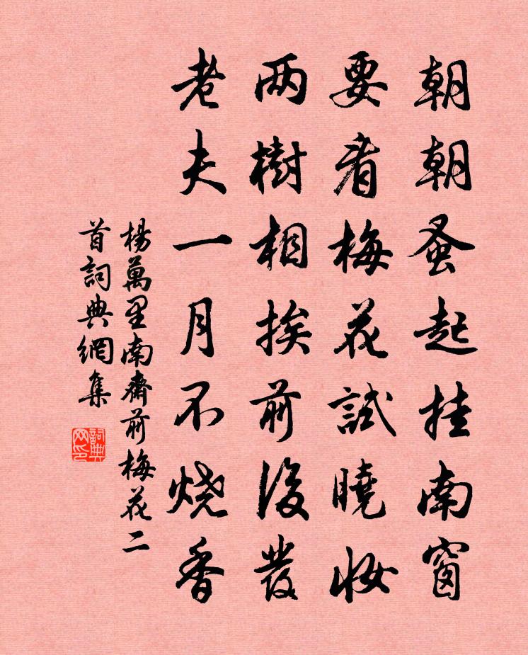 詩詞名句歷史字典書法欣賞書法字典國語詞典說文解字康熙字典古漢語字典標 題 作 者 詩 句 南齋前梅花二首作者:楊萬里 朝代:宋代南齋前梅花二首原文朝朝蚤起掛南窗,要看梅花試曉妝。兩樹相挨前後發,老夫一月不燒香。詩詞問答問:南齋前梅花二首的作者是誰?答:楊萬里問:南齋前梅花二首寫於哪個朝代?答:宋代問:楊萬里的名句有哪些?答:楊萬里名句大全楊萬里南齋前梅花二首書法欣賞南齋前梅花二首書法作品詩詞推薦異獸陳宗遠〔宋代〕甬東有異獸,俗名訛曰歆。其形類猴玃,或謂虎之精。逐人求口食,咿啞小兒聲。滿望乃謝去,不遂輒生嗔。利爪感詠十解寄呈楊安撫白玉蟾〔宋代〕雞翹豹尾中,鳳閣鸞台客。何似許旌陽,西山煮白石。陪王使君晦日泛江就黃家亭子二首杜甫〔唐代〕山豁何時斷,江平不肯流。稍知花改岸,始驗鳥隨舟。結束多紅粉,歡娛恨白頭。非君愛人客,晦日更添愁。有徑和何子應夜讀書馮時行〔宋代〕軒頊握元氣,堯舜法令疏。三王備文物,古意漸欲無。周平一東轍,列國異車書。祖龍失雲雨,大漢天為謨。後更次韻酬徐仲元王安石〔宋代〕投老逍遙屺與堂,天刑真已脫桁楊。緣源靜翳無魚淰,度谷深追有鳥頏。每苦交遊尋五柳,最嫌尸祝擾庚桑。相看次韻太守會宜休亭二首張嵲〔宋代〕屐齒破苔色,林塘欣共尋。水光連竹塢,山翠上衣襟。疏柳搖斜日,高梧轉晚陰。娵偶休入詠,可怕兕觥深。齊天樂姬翼〔元代〕自為形所累,寒餓交侵,贅疣何異。試究虛玄從初本,有一點圓明無際。塵緣漠漠,似千里晴空,幻生雲醫。仗此過金牛自勞李新〔宋代〕帖險緣虛知幾蟠,小山細水入平寬。云何癭婦翻相笑,土木形骸亦屬官。晨興張耒〔宋代〕喔喔雞向晨,夙興鄰里靜。朝光出東崗,秋曉氣耿耿。亭亭脫樹葉,寒意已疏勁。草根有微露,醲綠尚交映。老夫和邢和叔學士見別邵雍〔宋代〕世路如何若大東,相逢不待語言通,觀君自比諸葛亮,顧我殊非黃石公。講道污隆無巨細,語時興替有初終。出人胡笳曲十六拍文天祥〔宋代〕乃知貧賤別更苦,況我飄轉無定所。心懷百憂復千慮,世人那得知其故。嬌兒不離膝,哀哉兩決絕。也復可憐人,春詞毛滂〔宋代〕誕敷文德金鈴振,盡納熙河玉律諧。御柳宮梅動春意,朝來黃鳥亦喈喈。新正吟邵雍〔宋代〕蘧瑗知非日,宣尼讀易年。人情止於是,天意豈徒然。立事情尤倦,思山興益堅。誰能同此志,相伴老伊川。楊知錄送千葉白蓮趙蕃〔宋代〕幾思載酒問揚雄,不但尊空囊亦空。枉道荷花有新發,又聞能白勝能紅。從軍行杜頠〔唐代〕秋草馬蹄輕,角弓持弦急。去為龍城候,正值胡兵襲。軍氣橫大荒,戰酣日將入。長風金鼓動,白露鐵衣濕。四起初三日出東郊碑樓院范成大〔宋代〕遠柳新晴暝紫煙,小江吹凍舞清漣。紅塵一哄人歸後,跕跕飢鳶蹙紙錢。正月一日雪中過淮謁客回作二首蘇軾〔宋代〕十里清淮上,長堤轉雪龍。冰崖落屐齒,風葉亂裘茸。萬頃穿銀海,千尋渡玉峰。從來修月手,合在廣寒宮。攢眉漁父/漁歌子陸游〔宋代〕晴山滴翠水挼藍。聚散漁舟兩復三。橫埭北,斷橋南。側起船篷便作帆。壽王通判五首吳勢卿〔宋代〕古稱半刺已翱翔,□壘迴旋舞袖長。賴有治齊清淨法,宏開壽哉海沂康。和潔堂見壽十章馬廷鸞〔宋代〕風雨傾燕巢,波濤漲鯨海。茅檐得此生,其誰為爾宰。名句推薦誰料蘇卿老歸國,茂陵松柏雨蕭蕭。李商隱《茂陵》 風蒲獵獵小池塘。過雨荷花滿院香。李重元《憶王孫·夏詞》 而浮生若夢,為歡幾何?李白《春夜宴桃李園序 / 春夜宴從弟桃花園序》 天下皆知美之為美,斯惡已。皆知善之為善,斯不善已。老子《老子·道經·第二章》 上林苑裡花徒發,細柳營前葉漫新。杜審言《春日京中有懷》 紛紛紅紫已成塵,布穀聲中夏令新。陸游《初夏絕句》 階下青苔與紅樹,雨中寥落月中愁。李商隱《端居》 獨自立瑤階,透寒金縷鞋。納蘭性德《菩薩蠻·隔花才歇廉纖雨》 滿川風雨獨憑欄,綰結湘娥十二鬟。黃庭堅《雨中登岳陽樓望君山》 君家何處住,妾住在橫塘。崔顥《長干行·君家何處住》