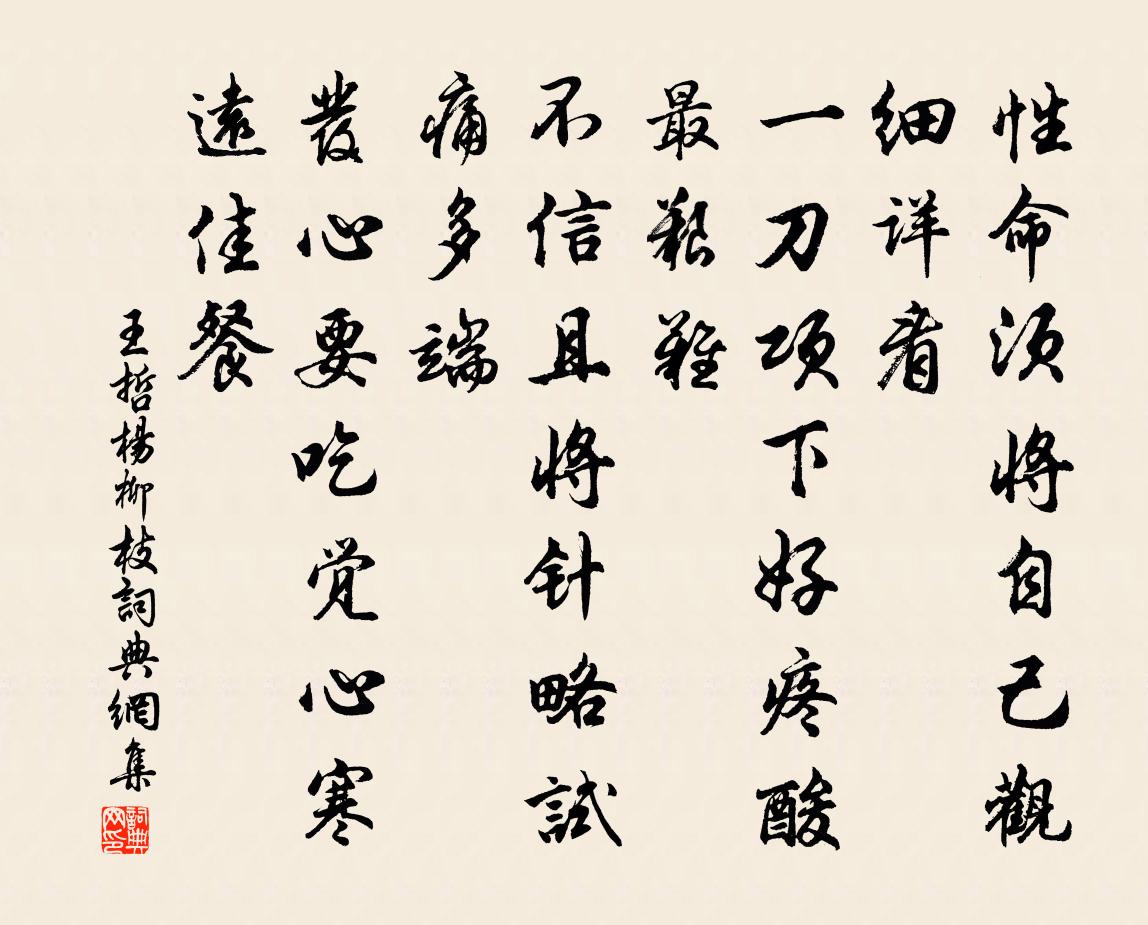 詩詞名句歷史字典書法欣賞書法字典國語詞典說文解字康熙字典古漢語字典標 題 作 者 詩 句 楊柳枝作者:王哲 朝代:元代楊柳枝原文性命須將自己觀。細詳看。一刀項下好疼酸。最艱難。不信且將針略試,痛多端。發心要吃覺心寒。遠佳餐。詩詞問答問:楊柳枝的作者是誰?答:王哲問:楊柳枝寫於哪個朝代?答:元代問:楊柳枝是什麼體裁?答:詞王哲楊柳枝書法欣賞楊柳枝書法作品詩詞推薦浣溪沙·江村道中范成大〔宋代〕十里西疇熟稻香,槿花籬落竹絲長,垂垂山果掛青黃。濃霧知秋晨氣潤,薄雲遮日午陰涼,不須飛蓋護戎裝。夜坐燒香台樓鑰〔宋代〕長晝苦炎熱,夜分涼始生。電中千嶂立,琴外一蛩鳴。急雨催詩思,遙空答鼓聲。誰知一府地,得此意淒清。津途風雨欲雪衛宗武〔宋代〕宇宙忽凝合,一元如未分。天慳花剪水,風潑墨成雲。飢鳥啄木理,戲鳧生浪紋。祁寒飛兩櫂,行役為誰勤。次韻校理盛居中上元晁補之〔宋代〕四見都城燈火春,看驅肥馬走朱輪。天傳九奏虛群籟,海踴三山跨萬鱗。追賞謾逃深禁直,拜迎祗望屬車塵。預知送大理張卿(一題作送張衛尉)顧況〔唐代〕春色依依惜解攜,月卿今夜泊隋堤。白沙洲上江蘺長,綠樹村邊謝豹啼。遷客比來無倚仗,故人相去隔雲泥。越禽和府推官冬菊蘇頌〔宋代〕經冬寒菊已離披,梁苑殘英尚滿墀。尊酒還思元亮醉,秋香又過子愚期。尋芳意思人尤厚,耐冷枝條土所宜。墨客夢筆驛陸游〔宋代〕朱扉水際亭,白塔道邊寺,扁舟幾往返,每過輒歔欷。經秋病不死,歲暮復一至。少年自喧譁,此老獨憔悴。可憐雪後小軒方回〔宋代〕紙色光新聳壞櫺,履聲忪脆兀閒庭。飢禽啐砌留奇蹟,枯樹拿空失醜形。早與花根添曲糵,可容畫手著丹青。溪西喜王志夫來晁公溯〔宋代〕懶觀南土化,歸勒北山銘。蠟屐乃相過,巾車何不停。復回千里駕,去食五侯鯖。想見知君到,傳呼合下鈴。摸魚兒 春日西湖泛舟張翥〔元代〕漲西湖、半篙新雨,麴塵波外風軟。蘭舟同上鴛鴦浦,天氣嫩寒輕暖。簾半卷。度一縷、歌雲不礙桃花扇。鶯嬌燕且據告行求題其父所作夢記之後晁說之〔宋代〕前身嵩陽老道士,今日京東蔡秀才。杜門藏書萬餘卷,不知何身得之哉。病中六首陳師道〔宋代〕軟熟羞盤饌,芳辛實枕幃。候晴先曬席,占濕預烘衣。易粟雞皮皺,難培鶴骨肥。頭顱雖若此,虛白日生輝。答庫部韓郎中韋應物〔唐代〕高士不羈世,頗將榮辱齊。適委華冕去,欲還幽林棲。雖懷承明戀,忻與物累暌。逍遙觀運流,誰復識端倪。而我賀新郎王奕〔宋代〕帆卸西灣側。望康廬、老峰面目,舊曾相識。歲歲滔滔江浪遠,回首暮雲空碧。今想見、發痕全白。眠鹿磯頭茅屋三月芙蓉盛開二十餘花和友人韻陳宓〔宋代〕芳辰美景最難兼,桃李春風桂子蟾。百卉並生吾道泰,嘉祥敢恃我師謙。古意贈鄭彥能八音歌黃庭堅〔宋代〕金欲百鏈剛,不欲繞指柔。石羊臥荒草,一世如蜉蝣。絲成蠶自縛,智成龜自囚。竹箭天與美,豈願作嚆矢。匏枯孫氏女哀詞三章羅椅〔宋代〕秋風蕭颯兮白露下,豈不日月兮照我下土。持此白頭兮言何所,默已不堪兮哭微更苦。兒孫為吾一慟兮萬萬古。頌古十七首釋道行〔宋代〕門前石塔子,八白與九紫。方道既分明,免被巡官使。憶同張子長游北山諸名勝方鳳〔宋代〕昔與張公子,翩翩訪赤松。重來逾兩紀,獨去宿孤峰。古木蒼陂映,禪房側逕通。夕陰千嶂黑,人靜一燈紅。幸及山中採藥翁卷〔宋代〕岩崖產靈藥,等閒人顧稀。采掇獲所願,躋登倦忘歸。沃葉帶露滋,深根涵土肌。妍光媚幽笈,芳氣盈我衣。濯以名句推薦九日登高處,群山入望賒。趙時春《原州九日》 動人以行不以言,應天以實不以文,故我清靜而人自正。房玄齡《晉書·帝紀·第六章》 將軍狐裘臥不暖,都護寶刀凍欲斷。岑參《天山雪歌送蕭治歸京》 閉心塞意,不高瞻覽者,死人之徒也哉。王充《論衡·卷十三·別通篇》 晝成淒黯,雁飛過、垂楊轉青。吳文英《慶 * ·秋感》 別離在今晨,見爾當何秋。韋應物《送楊氏女》 沙上並禽池上暝。雲破月來花弄影。張先《天仙子·水調數聲持酒聽》 雪虐風饕愈凜然,花中氣節最高堅。陸游《落梅》 別後不知君遠近。觸目淒涼多少悶。歐陽修《玉樓春·別後不知君遠近》 黃河之水天上來,奔流到海不復回。李白《將進酒》