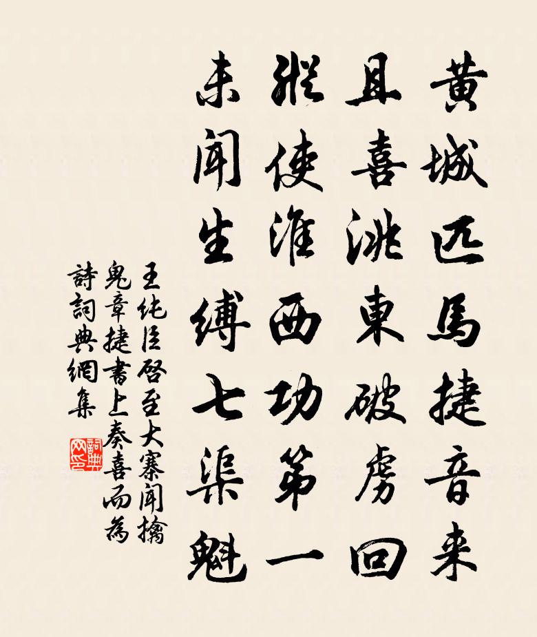 詩詞名句歷史字典書法欣賞書法字典國語詞典說文解字康熙字典古漢語字典標 題 作 者 詩 句 啟至大寨聞擒鬼章捷書上奏喜而為詩作者:王純臣 朝代:宋代原文黃城匹馬捷音來,且喜洮東破虜回。縱使淮西功第一,未聞生縛七渠魁。詩詞問答問:《啟至大寨聞擒鬼章捷書上奏喜而為詩》的作者是誰?答:王純臣問:該詩寫於哪個朝代?答:宋代書法欣賞啟至大寨聞擒鬼章捷書上奏喜而為詩書法作品詩詞推薦寒山拾得贊釋普寧〔宋代〕指東畫西,眼笑眉垂。心似秋月,發如亂絲。吟句不成句,題詩不是詩。豐乾輕饒舌,敗缺一時知。善哉苦哉,敢村社禱晴有應陸游〔宋代〕叢祠牲酒走村村,賴是龍歸為解紛。爽氣收回騎月雨,快風散盡滿天雲。數峰縹緲如屏面,一浦漣漪作簟紋。猶勝偶述黃庚〔宋代〕漂泊江湖祗自鄰,人生窮達信關天。老來於祿心灰矣,貧不求人氣浩然。五斗豈能留靖節,一瓢亦足樂顏淵。客來留別王元治師中譚純益三首胡寅〔宋代〕兒釣童游幾夢思,春風千里恨歸心。君今舊隱治三徑,我尚他州寄一枝。載酒猶慚來問字,對花深欲共論詩。不堪題松江館羊士諤〔唐代〕津柳江風白浪平,棹移高館古今情。扁舟一去鴟夷子,應笑分符計日程。綿王夢應〔宋代〕天錫公純嘏,洵美且仁。如南山之壽,展也大成。從以孫子,繩其祖武。清明黃庭堅〔宋代〕佳節清明桃李笑,野田荒壠只生愁。雷驚天地龍蛇螫,雨足郊原草木柔。人乞祭余驕妾婦,士甘焚死不公侯。賢愚曲幌宋祁〔宋代〕曲幌囊風入,前軒峽雨收。醉羅初解夕,珍簟暗知秋。衰柳金城恨,幽蘭楚國愁。更堪聞短笛,珪月在西樓。梅葉茵〔宋代〕溪橋一樹玉精神,香色中間集大成。疏影逼真前處士,群花推重老先生。春回隴首人千里,月到窗前夢五更。甚欲飲酒望西山戲詠陸游〔宋代〕太白十詩九言酒,醉翁無詩不說山。若耶老農識幾字,也與二事日相關。錦被堆徐去非〔宋代〕一種兩容儀,紅共白、交映南枝。紫霞仙指冰翁語,花如醉玉,香同臭雪,別樣風姿。相守歲寒期。春造化、密與頌證道歌證道歌釋印肅〔宋代〕夢裹明明有六趣,驢胎馬腹甚滋味。負鞍銜鐵償他錢,何以今生早歇去。游山遇雨陸游〔宋代〕千秋觀前雨濕衣,石帆山下叩漁扉。鷓鴣苦道行不得,杜鵑更勸不如歸。瑞鶴仙(母氏生朝二首)趙善括〔宋代〕月華凝露掌。正極目鸞霄,望風鯨壤。深宮注遐想。聽點點花漏,盈盈仙仗。笙簫迎響。降瓊輪、玄雲步障。洞□善哉行曹丕〔魏晉〕朝游高台觀。夕宴華池陰。大酋奉甘醪。狩人獻嘉賓。齊倡發東舞。秦箏奏西音。有客從南來。為我彈清琴。五音書懷送田二舍人自吏部郎中出典泰州王禹偁〔宋代〕共嘆蹉跎兩鬢蒼,立朝為郡是尋常。重歸謝客中書省,又送山濤吏部郎。三入承明身最忝,十年兄事分偏長。喜聞連雲樓林景熙〔宋代〕我心適無事,看雲起南山。層檐接空影,而不礙往還。昔年凡鱗化,乘此青冥間。膚寸未膏物,黃埃滿人寰。剛風秦樓月劉秉忠〔元代〕調羹手。殘枝莫折離亭柳。離亭柳。年年春盡,為誰消瘦。海棠過雨愁紅皺。行人駐馬空搔首。空搔首。秦樓花月戲述淵鴻漸遺事陸游〔宋代〕桑薴柴桑一世豪,區區玩物亦徒勞。品茶未及毀茶妙,飲酒何如止酒高?風光好佚名〔宋代〕柳陰陰。水深深。風約雙鳧不自禁。碧波心。孤村橋斷人迷路。舟橫渡。旋買村醪淺淺斟。更微吟。名句推薦亂點碎紅山杏發,平鋪新綠水蘋生。白居易《南湖早春》 夕陽閒淡秋光老,離思滿蘅皋柳永《少年游·參差煙樹灞陵橋》 以欲從人者昌,以人樂己者亡。吳兢《貞觀政要·卷六·論儉約》 荷絲傍繞腕,菱角遠牽衣蕭綱《採蓮曲》 樹荊棘得刺,樹桃李得蔭馮夢龍《警世通言·卷十八》 從善如登,從惡如崩。左丘明《國語·周語·劉文公與萇弘欲城周》 獨立小橋風滿袖,平林新月人歸後。馮延巳《鵲踏枝·誰道閒情拋擲久》 民之從事,常於幾成而敗之。老子《老子·德經·第六十四章》 佇久河橋欲去,斜陽淚滿。吳文英《三姝媚·過都城舊居有感》 井放轆轤閒浸酒,籠開鸚鵡報煎茶。張蠙《夏日題老將林亭》