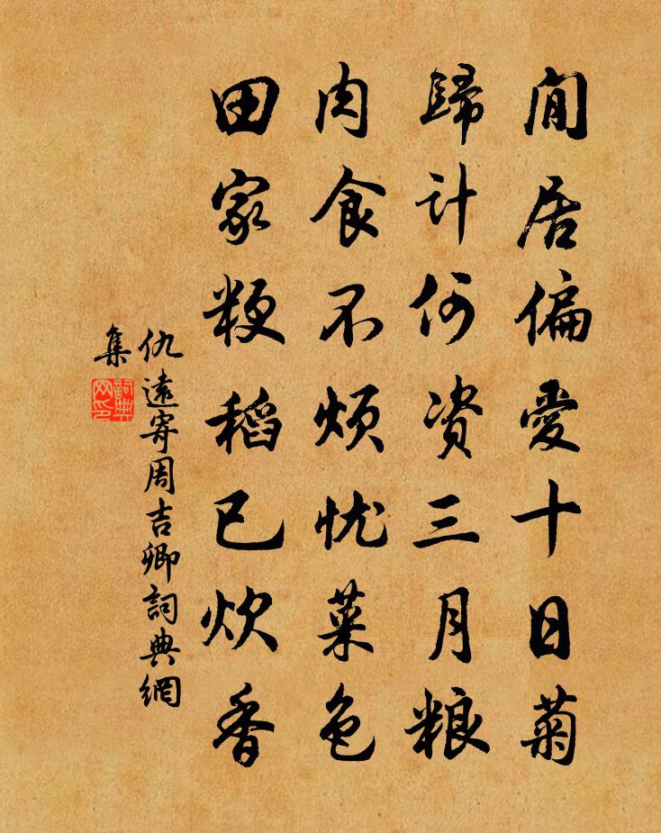 詩詞名句歷史字典書法欣賞書法字典國語詞典說文解字康熙字典古漢語字典標 題 作 者 詩 句 寄周吉卿作者:仇遠 朝代:宋代寄周吉卿原文閒居偏愛十日菊,歸計何資三月糧。肉食不煩憂菜色,田家粳稻已炊香。詩詞問答問:寄周吉卿的作者是誰?答:仇遠問:寄周吉卿寫於哪個朝代?答:宋代仇遠寄周吉卿書法欣賞寄周吉卿書法作品詩詞推薦北橋夜泊釋行海〔宋代〕夜泊北橋楊柳汀,卷蓑為枕夢魂清。覺來亂滴孤蓬雨,認作梧桐葉上聲。華嚴寺范成大〔宋代〕眾峰攢壁立,中有路一線。攀援白雲梯,食頃已天半。我本紫芝曲,誤落青芻棧。向來脫新羈,恍已還舊觀。花煙茶瓶兒趙彥端〔宋代〕澹月華燈春夜。送東風、柳煙梅麝。寶釵宮髻連嬌馬。似記得、帝鄉遊冶。悅親戚之情話。況溪山、坐中如畫。凌題半山寺壁二首王安石〔宋代〕寒時暖處坐,熱時涼處行。眾生不異佛,佛即是眾生。觀性吟邵雍〔宋代〕千萬年之人,千萬年之事。千萬年之情,千萬年之理。惟學之所能,坐而爛觀爾。燕山亭(面力·侄求睡紅亭為賦)毛並〔宋代〕暖靄輝遲,雨過夜來,簾外春風徐轉。霞散錦舒,密映窺,亭亭萬枝開遍。一笑嫣然,猶記有、畫圖曾見。無伴。挽鄭昂叔珪母蔡夫人二首王邁〔宋代〕鍾秀端明裔,來嬪通德家。早甘寒水玉,晚愛白蓮花。樂施陰功厚,回班慶事賒。他年龍鳳麓,曾典有光華。送吳郎西使成州徐鉉〔唐代〕所向皆為道,遐征豈足辭。中華垂盡處,別路正秋時。高閣蘭台筆,閒吟板屋詩。良工無棄物,珍重歲寒姿。遷居臨皋亭蘇軾〔宋代〕我生天地間,一蟻寄大磨。區區欲右行,不救風輪左。雖雲走仁義,未免違寒餓。劍米有危炊,針氈無穩坐。豈無五月七日見賣瓠者梅堯臣〔宋代〕老圃奪天時,馬通為煦嫗。四月彼種瓜,五月此賣瓠。陽陂與糞壤,功力且異趣。瓜遲瓠何早,豈不同雨露。速利競渡櫂歌黃公紹〔宋代〕月明中,月明中,滿湖春水望難窮。欲學楚歌歌不得,一場離恨兩眉峰。滿庭芳 重陽真人升霞之前馬鈺〔元代〕重陽師父,遇呂真人。養成神內之神。心起慈悲不住,開闡良因。時時出神入夢,化人人、要出迷津。登州北,有送春雍陶〔唐代〕勿言春盡春還至,少壯看花復幾回。今日已從愁里去,明年更莫共愁來。奉和御製讀宋書夏竦〔宋代〕漢宋開聖緒,得歲與周同。金石終移律,山河始誓功。飛名傳秘記,嘉讖起游童。能使奸豪讋,誠為一世雄。贈別羅舜舉廖行之〔宋代〕憶昔相從游,往往嘗繼晷。論文在肺肝,商確到肌體。一從悵分攜,鳧雁慣居徙。相望兩川間,別夢縈百里。向來賈誼張耒〔宋代〕賈生未免孝文疑,自古功名嘆數奇。逐得洛陽年少去,白頭絳灌亦何為。送丁廓秀才歸汝陰王安石〔宋代〕風駛柳條乾,駝裘未勝寒。殷懃陌上日,為客暖征鞍。呈摺子明丈十首趙蕃〔宋代〕故家人物幾沈淪,公獨風流似昔人。不但金聲吐佳句,尚余玉立聳長身。賢者之孝二百四十首范滂林同〔宋代〕寧將身塞禍,不忍母流離。我自不為惡,黃泉今有辭。舟中陳天麟〔宋代〕湖闊帆風飽,山長眼力疲。晚涼行進酒,秋色最宜詩。別意果作惡,虛名難療飢。此生無住著,投老欲何之。名句推薦女媧鍊石補天處,石破天驚逗秋雨。李賀《李憑箜篌引》 公天下之身,公天下之物,其唯至人矣!列子及其弟子《列子·楊朱》 推手遽止之,濕衣淚滂滂韓愈《聽穎師彈琴》 午醉未醒紅日晚,黃昏簾幕無人卷。蘇軾《蝶戀花·蝶懶鶯慵春過半》 人間夢隔西風,算天上、年華一瞬。吳文英《惜秋華·七夕》 落日暴風雨,歸路繞汀灣蘇舜欽《水調歌頭·滄浪亭》 山中何所有,嶺上多白雲。陶弘景《詔問山中何所有賦詩以答》 凡事謹守規模,必不大錯;一生但足衣食,便稱小康。王永彬《圍爐夜話·第五三則》 今宵酒醒何處?楊柳岸,曉風殘月。柳永《雨霖鈴·寒蟬淒切》 喚起一天明月,照我滿懷冰雪,浩蕩百川流。辛棄疾《水調歌頭·和馬叔度游月波樓》