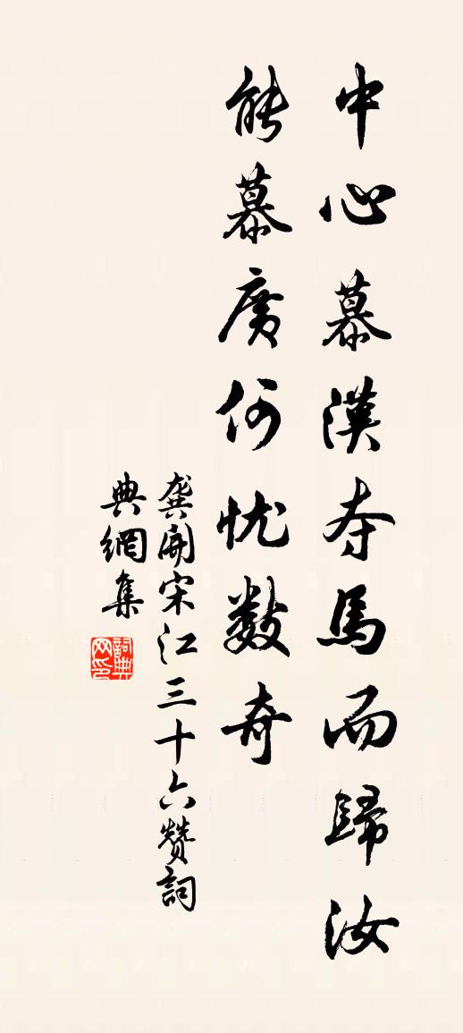 詩詞名句歷史字典書法欣賞書法字典國語詞典說文解字康熙字典古漢語字典標 題 作 者 詩 句 宋江三十六贊作者:龔開 朝代:宋代宋江三十六贊原文中心慕漢,奪馬而歸。汝能慕廣,何憂數奇。詩詞問答問:宋江三十六贊的作者是誰?答:龔開問:宋江三十六贊寫於哪個朝代?答:宋代龔開宋江三十六贊書法欣賞宋江三十六贊書法作品詩詞推薦送張端明赴召周必大〔宋代〕心正能教筆不欹,古來書法獨公知。顏筋柳骨留蕭寺,總是甘棠去後思。瑞鷓鴣譚處端〔元代〕莫言容易做修持。損損存存恐礙違。兩飯慮頻侵道友,一錢外恐損希夷。眾中戒口忘矜俊,獨坐防心斷騁馳。十二個儂廖瑩中〔宋代〕恨個儂無賴,賣嬌眼、春心偷擲。蒼苔花落,先印下一雙春跡。花不知名,香才聞氣,似月下箜篌,蔣山傾國。半自孟津舟西上雨中作韋莊〔唐代〕秋煙漠漠雨濛濛,不捲征帆任晚風。百口寄安滄海上,一身逃難綠林中。來時楚岸楊花白,去日隋堤蓼穗紅。卻到金陵雜興二百首蘇泂〔宋代〕池亭楚楚更堂堂,占得寬閒地一方。花竹四時隨處有,縱無人賞亦何妨。登女郎台穆修〔宋代〕女郎名字本風流,好與州人作勝游。倘使此台呼醜女,汝陰城裡一荒丘。採桑子(瑞香)吳文英〔宋代〕茜羅結就丁香顆,顆顆相思。猶記年時。一曲春風酒一卮。彩鸞依舊乘雲到,不負心期。清睡濃時。香趁銀屏胡蝶晨鐘動雷池望日張栻〔宋代〕浮氣列下陳,天淨澄秋容。朝暾何處升,偏偏認微紅。須臾眩眾采,閶闔開九重。金鉦忽湧出,晃蕩浮雙瞳。乾坤尋春次韻樓鑰〔宋代〕曉來陌上雨斑斑,同社相將便出關。席地亦堪尋酒所,得園徑與坐花間。從教多病須行樂,任是清貧也破慳。門外送葉吉甫往建康項安世〔宋代〕腳底東林路,船頭下土溝。所之仍作客,何日定歸休。眉為鄉人蹙,心將世事謀。書生千西病,至竟欲誰瘳。耕圖二十一首三耘樓璹〔宋代〕農田亦甚劬,三復事耘耔。經年苦艱食,喜見苗薿薿。老農念一飽,對此出饞水。願天均雨暘,滿野如雲委。寄意三絕胡仲弓〔宋代〕塵滿胡床沔滿衣,深閨寂寂鎖相思。一春幽恨無人共,手撚梨花腸斷時。和陶淵明二十首陳造〔宋代〕作計憂患場,賢聖頗中之。淮鄉酒價賤,希復獨醒時。齒髮變今昔,撫己萬負茲。清坐挹飲客,辭費未免疑。客歡頌古一○一首釋子淳〔宋代〕一句相酬難取則,輪王不化閻浮國。無邊剎海浪痕平,獨駕泥牛耕月色。行次成皋途經先聖擒建德之所緬思功業感而賦詩李隆基〔唐代〕有隋政昏虐,群雄已交爭。先聖按劍起,叱吒風雲生。飲馬河洛竭,作氣嵩華驚。克敵睿圖就,擒俘帝道亨。顧慚大牆上蒿行曹丕〔魏晉〕 陽春無不長成,草木群類,隨大風起。零落若何翩翩,中心獨立一何煢。四時舍我驅馳,今我隱約欲何為?生會吟行謝靈運〔南北朝〕六引緩清唱。三調佇繁音。列筵皆靜寂。鹹共耹會吟。會吟自有初。請從文命敷。敷績壺冀始。刊木至江汜。列宿夜後把火看花南園招李十一兵曹不至呈座上諸公呂溫〔唐代〕夭桃紅燭正相鮮,傲吏閒齋困獨眠。應是夢中飛作蝶,悠揚只在此花前。家居陸游〔宋代〕蒲葦村深地,風霜歲晚天。溪柴勝熾炭,黎布敵純綿。有客問奇字,無人嘲晝眠。誰言此翁老?懹抱尚超然。征秋稅畢題郡南亭白居易〔唐代〕高城直下視,蠢蠢見巴蠻。安可施政教,尚不通語言。且喜賦斂畢,幸聞閭井安。豈伊循良化,賴此豐登年。案牘名句推薦喚起一天明月,照我滿懷冰雪,浩蕩百川流。辛棄疾《水調歌頭·和馬叔度游月波樓》 高樓目盡欲黃昏,梧桐葉上蕭蕭雨。晏殊《踏莎行·碧海無波》 寒氣先侵玉女扉,清光旋透省郎闈。李商隱《對雪二首》 前經洛陽陌,宛洛故人稀。王維《送魏郡李太守赴任》 治大者不治細,成大功者不成小列子及其弟子《列子·楊朱》 夫大寒至,霜雪降,然後知松柏之茂也。劉安及其門客《淮南子·俶真訓》 行坐深閨里。懶更妝梳,自知新來憔悴。杜安世《鶴沖天·清明天氣》 反聽之謂聰,內視之謂明,自勝之謂強。司馬遷《史記·商君列傳》 娉娉裊裊十三餘,豆蔻梢頭二月初。杜牧《贈別二首》 西宮南內多秋草,落葉滿階紅不掃。白居易《長恨歌》