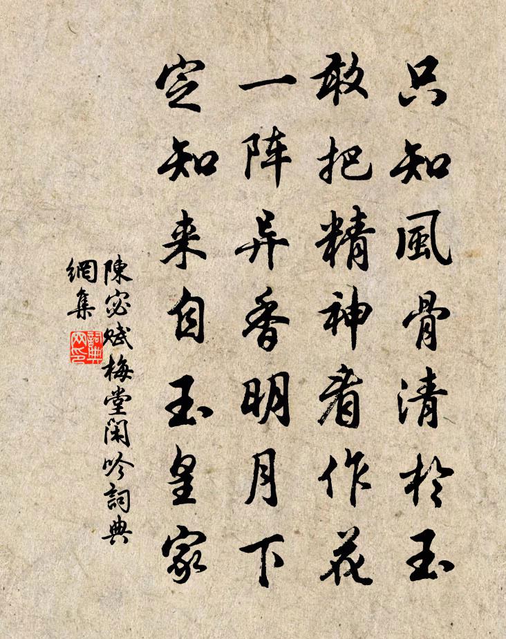 詩詞名句歷史字典書法欣賞書法字典國語詞典說文解字康熙字典古漢語字典標 題 作 者 詩 句 賦梅堂閒吟作者:陳宓 朝代:宋代賦梅堂閒吟原文只知風骨清於玉,敢把精神看作花。一陣異香明月下,定知來自玉皇家。詩詞問答問:賦梅堂閒吟的作者是誰?答:陳宓問:賦梅堂閒吟寫於哪個朝代?答:宋代陳宓賦梅堂閒吟書法欣賞賦梅堂閒吟書法作品詩詞推薦有別何應龍〔宋代〕樓上佳人唱渭城,樓前楊柳識離情。一聲未是難聽處,最是難聽第四聲。踏莎行 雪晴縱步汪斌〔元代〕踏雪橋邊,訪梅溪曲。春風初破梢頭玉。村村茅屋晚炊煙,更尋村酒穿茅屋。兔月初眉,瑤峰眩目。**振屐鳴空寄何紹余林寬〔唐代〕雁過君猶未入城,清賢門下舊知名。風波凍馬遙逢見,革橐飢僮尚挈行。住在閒坊無轍跡,別來何寺有泉聲。芙蓉聖恩增秩進職致仕,感恩述懷楊萬里〔宋代〕雨露絲綸下玉宸,問天乞得個閒身。一生無恨長多感,三請皈休恰四春。手板抽還大丞相,安車縣示後來人。從今題金家竹溪王建〔唐代〕少年因病離天仗,乞得歸家自養身。買斷竹溪無別主,散分泉水與新鄰。山頭鹿下長驚犬,池面魚行不怕人。鄉使勸農同幕皆預即事四絕陳杰〔宋代〕鐵騎琱戈夾道馳,元戎小隊出郊時。白袍容與其音得,莫是參謀老拾遺。孤憤吟十三首高斯得〔宋代〕無罪無辜竄逐人,幾經大霈不沾恩。更將改正張羅網,結尺千千萬萬冤。春社日效宛陵先生體社雨陸游〔宋代〕開歲才幾時,春社忽已及。茫茫草色深,蕭蕭雨聲急。扶犁行白水,不惜芒屨濕。村童更可憐,赤腳牛背立。宮詞王仲修〔宋代〕紅日初生捧殿高,蔥蔥佳氣拂雲袍。今朝駕幸化成殿,先對東風賞小桃。青城縣會飲何氏池亭贈譚德稱陸游〔宋代〕赤日黃塵行路難,青城縣裡得偷閒。十年去國悲霜鬢,六月登樓望雪山。醉客千言猶落筆,美人斗酒未酡顏。憑誰再次去年子中兄送黃雀不至韻周必大〔宋代〕祝壽筵開正小春,兄酬弟勸喜津津。披綿走送非無意,小愧乘成多忘人。聽泉齊己〔唐代〕落石几萬仞,冷聲飄遠空。高秋初雨後,半夜亂山中。只有照壁月,更無吹葉風。幾曾廬岳聽,到曉與僧同。賀新郎(憶鶴)佚名〔宋代〕蒼蘚黏溪路。帳山君、翛然羽化,夢魂何許。曾約秋雲縈客袖,舞傍吟皋硯塢。矯清唳、裂穿雲宇。江碧空濛無處直釣岩李芮〔宋代〕無械仙翁去,岩垂直釣名。重開茅葦塞,仰見斗山明。便覺天光近,從教俗眼驚。登臨試一覽,心目得雙清。寄張珍甫殿院五首李流謙〔宋代〕江湖淹遠使,昆閬侶飛仙。豸首承恩渥,龍墀接邇聯。豺狼莫當道,鵰鶚不空拳。黯惷猶冠見,驕王易縮肩。奉和文潛贈無咎篇末多見及以既見君子云胡不黃庭堅〔宋代〕談經用燕說,束棄諸儒傳。濫觴雖有罪,末派彌九縣。張侯真理窟,堅壁不與戰。難以口舌爭,水清石自見。新居用韓昌黎詩辛勤三十年以有此屋廬為韻蔡戡〔宋代〕我亦大痴人,勸者多不足。抖擻囊中金,傾倒囷內粟。雖雲壁徒立,尚有田可鬻。百口勿啼飢,張頤仰看屋。雨中花慢姬翼〔元代〕一點靈源,澄湛照徹,多生浩劫情塵。有不夜壺天風物,亘古仍存。踞閫玉麟哮吼,對床石女談論。海童微念,寥錢光祿兩張卿退居杜衍〔宋代〕七十引年遵禮經,君家何事最為榮。清朝叔侄同辭祿,歸去田無盡列卿。遠近溪山資勝嘗,往還舟楫稱閒行。誰知減字木蘭花 吳江夜泊邵亨貞〔元代〕江頭日暮。客子移舟迷去路。望斷天涯。燈火深村賣酒家。銅*巷陌。荒*寒鴉煙樹隔。往事無情。舊夢依然到五名句推薦日高煙斂,更看今日晴未。李清照《念奴嬌·春情》 了卻君王天下事,贏得生前身後名。辛棄疾《破陣子·為陳同甫賦壯詞以寄之》 親愛我,孝何難。親憎我,孝方賢。李毓秀《弟子規·入則孝》 松排山面千重翠,月點波心一顆珠。白居易《春題湖上》 執手相看淚眼,竟無語凝噎。柳永《雨霖鈴·寒蟬淒切》 天地無全功,聖人無全能,萬物無全用。列子及其弟子《列子·天瑞》 相逢處,自有暗塵隨馬。周邦彥《解語花·上元》 獨行潭底影,數息樹邊身。賈島《送無可上人》 一晌憑欄人不見,鮫綃掩淚思量遍。馮延巳《鵲踏枝·梅落繁枝千萬片》 半畝方塘一鑒開,天光雲影共徘徊。朱熹《活水亭觀書有感二首·其一》