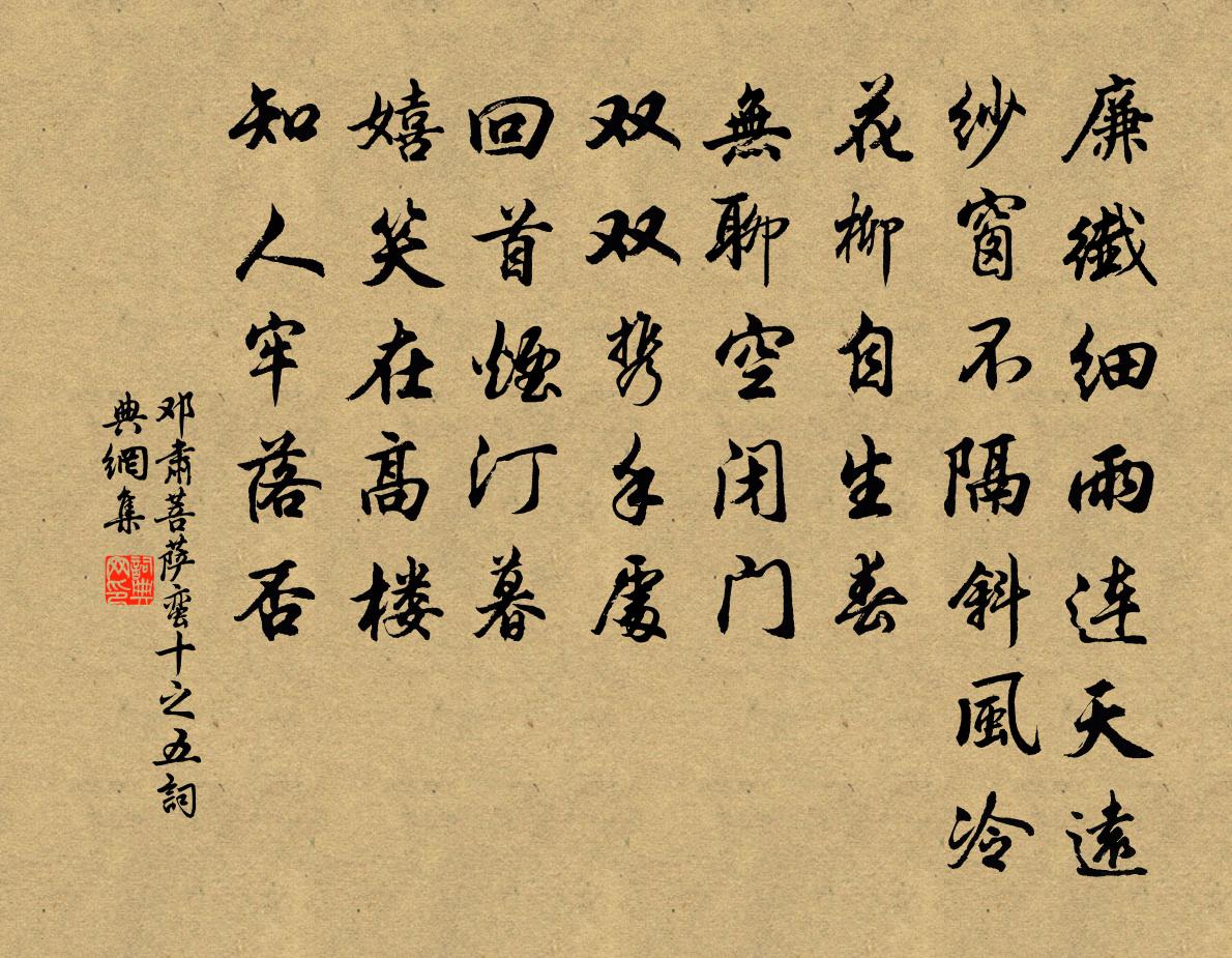 詩詞名句歷史字典書法欣賞書法字典國語詞典說文解字康熙字典古漢語字典標 題 作 者 詩 句 菩薩蠻(十之五)作者:鄧肅 朝代:宋代菩薩蠻(十之五)原文廉纖細雨連天遠。紗窗不隔斜風冷。花柳自生春。無聊空閉門。雙雙攜手處。回首煙汀暮。嬉笑在高樓。知人牢落否。詩詞問答問:菩薩蠻(十之五)的作者是誰?答:鄧肅問:菩薩蠻(十之五)寫於哪個朝代?答:宋代問:菩薩蠻(十之五)是什麼體裁?答:詞鄧肅菩薩蠻(十之五)書法欣賞菩薩蠻(十之五)書法作品詩詞推薦喜晴再用閒字韻李彌遜〔宋代〕風掠游雲露遠山,長藤竟欲與君攀。花神爭作瓊瑤報,野老心如鐵如頑。千樹暗春難比富,一枝照眼未應慳。不須偶得胡仲參〔宋代〕挑燈伴寒夜,兀坐竹爐邊。赤腳知吟苦,時將山茗煎。歲朝方岳〔宋代〕青山不似歲華老,白酒最於鷗鳥親。十事九休書作崇,百無一有硯生春。貧中只是尋常日,醉裹何知見在身。卻喜眼兒媚(送別)王質〔宋代〕雨潤梨花雪未乾。猶自有春寒。不如且住,清明寒食,數日之間。想君行盡嘉陵水,我已下江南。相看萬里,時須寓興七首魏野〔宋代〕天地勞覆載,日月勞往還。此尚不能息,何況在其間。鳥獸飲食外,悠悠無食慳。如何人異此,晝夜機相關。顧我伏奉佳句猥寄鄙夫輒寫丹誠仰依高韻李至〔宋代〕獨慚師長念遺簪,長感知心在寸心。要路未離扶遣進,閒曹因病放教吟。風鵬雖遠丹霄勢,月兔猶依綠桂陰。從此玉蝴蝶李之儀〔宋代〕坐久燈花開盡,暗驚風葉,初報霜寒。冉冉年華催暮,顏色非丹。攪迴腸、蛩吟似織,留恨意、月彩如攤。無歡。曾守譙樓既成邀賓從同登議辟雙門以復舊觀從虞儔〔宋代〕樓下遺蹤宛可尋,尚須賓從一來臨。三峰嵂崒渾依舊,雙闕岧嶢復見今。麻麥向來迷綠野,簪纓久矣負儒林。使君正冊判詞曹雪芹〔清代〕子系中山狼,得志便猖狂。金閨花柳質,一載赴黃粱。枯魚過河泣李白〔唐代〕白龍改常服,偶被豫且制。誰使爾為魚,徒勞訴天帝。作書報鯨鯢,勿恃風濤勢。濤落歸泥沙,翻遭螻蟻噬。萬乘偈頌七首釋亮〔宋代〕九旬禁足今朝滿,漆桶掀翻快活人。莫怪點胸夸獨步,只緣過夏在清真。木蘭花庾傳素〔唐代〕木蘭紅艷多情態,不似凡花人不愛。移來孔雀檻邊栽,折向鳳凰釵上戴。是何芍藥爭風彩,自共牡丹長作對。若教聖人之孝十首文王林同〔宋代〕問安寢門外,旦旦俟雞鳴。以至日中昃,居常盡此誠。到官歸志浩然二絕句黃庭堅〔宋代〕鳥烏未覺常先曉,筍蕨登盤始見春。斂手還他能者作,從來刀筆不如人。喜罷郡白居易〔唐代〕五年兩郡亦堪嗟,偷出遊山走看花。自此光陰為己有,從前日月屬官家。樽前免被催迎使,枕上休聞報坐衙。睡到頌古八首釋道印〔宋代〕何必不必,方圓曲直。眉目分明,若為辨的。影草既隨身,覿面當機疾。一雙孤雁忽高飛,兩隻鴛鴦還獨立。和人賦琴高魚吳潛〔宋代〕仙人藥苗化為魚,身雖纖細味豐腴。土人涉溪如採荇,以布為網猶恐疏。不比吳王耽嗜膾,松江千古留腥滓。好似倉部弟生日五絕劉克莊〔宋代〕爵並開鄉邑,官皆視大蓬。年齒高略似,鬚髮黑難同。答吳侍郎二首劉克莊〔宋代〕昨泛靈槎河漢津,今撐小艇水雲身。相居自作蹲池計,天子何曾如屋嗔。開綠野尊姑領客,第甘泉頌可無人。白沙戲呈珉禪師周麟之〔宋代〕我來何幸識支郎,百丈峰頭寶月光。質薄自憐非燕頷,途窮誰信是龜腸。漸看鬢底千絲白,敢說眉間一點黃。坐見名句推薦久廢山行疲犖确,尚能村醉舞淋浪。蘇軾《捕蝗至浮雲嶺山行疲苶有懷子由弟二首·其二》 團扇,團扇,美人病來遮面。王建《宮中調笑·團扇》 醉里乾坤大,壺中日月長施耐庵《水滸傳·第二十九回》 彊弩之極,矢不能穿魯縞;衝風之末,力不能漂鴻毛。司馬遷《史記·七十列傳·韓長孺列傳》 觀棋不語真君子,把酒多言是小人。馮夢龍《醒世恆言·卷九》 斑騅只系垂楊岸,何處西南任好風。李商隱《無題·鳳尾香羅薄幾重》 壯別天涯未許愁,盡將離恨付東流李大釗《口占一絕(壯別天涯未許愁)》 秦中已久烏頭白,卻是君王未備知。李商隱《人慾》 棗花至小能成實,桑葉雖柔解吐絲。王溥《詠牡丹》 寧知寸心裡,蓄紫復含紅!沈約《詠新荷應詔》