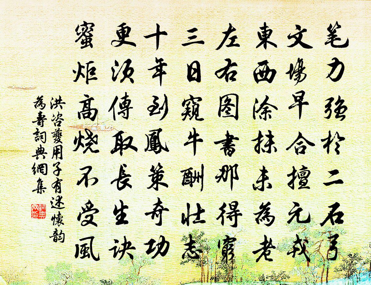 詩詞名句歷史字典書法欣賞書法字典國語詞典說文解字康熙字典古漢語字典標 題 作 者 詩 句 用子有述懷韻為壽作者:洪咨夔 朝代:宋代用子有述懷韻為壽原文筆力強於二石弓,文場早合擅元戎。東西塗抹未為老,左右圖書那得窮。三日窺牛酬壯志,十年到鳳策奇功。更須傳取長生訣,蜜炬高燒不受風。詩詞問答問:用子有述懷韻為壽的作者是誰?答:洪咨夔問:用子有述懷韻為壽寫於哪個朝代?答:宋代洪咨夔用子有述懷韻為壽書法欣賞用子有述懷韻為壽書法作品詩詞推薦長思仙侯善淵〔元代〕道無邊。性光圓。認得龜蛇兩下纏。陰陽合地天。汞和鉛。氣神全。光迸流霞耀晃然。方知玄又玄。送金上人之水南釋正覺〔宋代〕里許由來懶荷擔,百草頭上何廉纖。半夜對月笑拍手,不見噴霜三腳蟾。劫空有句妙如許,公去誰余對眉語。後見漢宮春(春苑賞牡丹)汪元量〔宋代〕玉砌雕欄。見吳宮西子,一笑嫣然。舞困人間半嚲,艷粉爭妍。珠簾盡卷,看人間、金屋神仙。歌隊里,霞裾裊娜次韻趙達夫過訪方回〔宋代〕無限溪山畫不如,特尋花竹到貧居。相迎具茗涼堂上,獨肯沖泥苦雨余。伐病政思翻素問,論詩徒覺過黃初。脫然僧院聽琴(一作宿藏公院聽齊孝若彈琴)楊巨源〔唐代〕禪思何妨在玉琴,真僧不見聽時心。離聲怨調秋堂夕,雲向蒼梧湘水深。芳草渡/系裙腰張先〔宋代〕主人宴客玉樓西。風飄雪、忽氛霏。唐昌花蕊漸平枝。浮光里,寒聲聚,隊禽棲。驚曉日,喜春遲。野橋時伴梅飛清平樂 題漁父圖沈禧〔元代〕煙波深處。占斷溪山趣。逢著忘機閒伴侶。旋斫錦鱗烹煮。隔船相喚相呼。瓮頭酒盡須沽。醉後都忘爾汝。生來不病中早訪招國李十將軍遇挈家游曲江李商隱〔唐代〕十頃平波溢岸清,病來惟夢此中行。相如未是真消渴,猶放沱江過錦城。大蜀皇帝壽春節進堯銘舜頌二首堯銘貫休〔唐代〕金冊昭昭,列聖孤標。仲尼有言,巍巍帝堯。承天眷命,罔厥矜驕。四德炎炎,階蓂不凋。永孚於休,垂衣飄颻。即事示兒辛棄疾〔宋代〕掃跡衡門下,終朝抱膝吟。貧須依稼穡,老不厭山林。有酒無餘願,因閒得此心。西園早行樂,桃李漸成陰。留題新安幕府聚秀軒李彌遜〔宋代〕星聚群賢上幕賓,層軒高敞枕溪漘。一時盧駱五楊輩,萬里東西南北人。句里江山端有助,學餘民社政須親。青冥招隱三章贈李洋洪咨夔〔宋代〕雲氯冒兮天目之趾,疊湫噴薄兮洞石齒齒。列缺正晝兮睡蛟起,可仰而擾兮浴以天河倒流之水。余為成都帥司參議成將軍漢卿為成都路兵鈐相陸游〔宋代〕將軍鐵胸中備文鐵武,鐵馬黃鐵旗玉關路鐵。羌胡可滅心自知,富貴有命才可與。奪官置之三硤中,空山猿鳥同朝泊唐棲寺釋行海〔宋代〕颯颯寒聲折葦風,唐棲岸下泊孤篷。白頭不見頤山老,寂寞門前楓葉紅。臨平道中范成大〔宋代〕煙雨桃花夾岸栽,低低渾欲傍船來。石湖有此紅千葉,前日春寒總未開。詠史下趙雲陳普〔宋代〕子龍一身都是膽,更有仁心並義肝。士勸渠能和益土,百驚不動是人安。大雨杜甫〔唐代〕西蜀冬不雪,春農尚嗷嗷。上天回哀眷,朱夏雲鬱陶。執熱乃沸鼎,纖絺成縕袍。風雷颯萬里,霈澤施蓬蒿。敢辭寄故人施彥執張九成〔宋代〕百念都忘萬事休,一觴一詠自賡酬。坐看庾嶺當南斷,又送橫江轉北流。已覺摧頹侵兩鬢,更無術畫補前旒。何時代謝劉小坡送鄉會勸酒賡韻王與鈞〔宋代〕履端開帝歷,會拜謹王春。百世枌榆舊,一番桃李新。珍頒來腆渥,妙句帶清真。騎省雲霄上,寧辭染翰頻。登越王台呂定〔宋代〕海上荒台草樹平,登臨不盡古人情。白雲萬里懷親舍,紅日中天望帝京。百粵山咱秋歷落,山城樓閣晚崢嶸。醉來名句推薦巧言令色,鮮矣仁。孔子弟子《論語·學而篇》 林中有奇鳥,自言是鳳凰。阮籍《詠懷八十二首·其七十九》 胸中有誓深于海,肯使神州竟陸沉?鄭思肖《二礪》 漸老多憂百事忙,天寒日短更心傷。李覯《秋晚悲懷》 岸邊兩兩三三,浣沙游女。柳永《夜半樂·凍雲黯淡天氣》 浮天水送無窮樹,帶雨雲埋一半山。辛棄疾《鷓鴣天·送人》 堂上謀臣尊俎,邊頭將士干戈辛棄疾《西江月其六》 睡起覺微寒。梅花鬢上殘。李清照《菩薩蠻·風柔日薄春猶早》 記取西湖西畔,正暮山好處,空翠煙霏。蘇軾《八聲甘州·寄參寥子》 過盡征鴻來盡燕,故園訊息茫然。趙長卿《臨江仙·暮春》