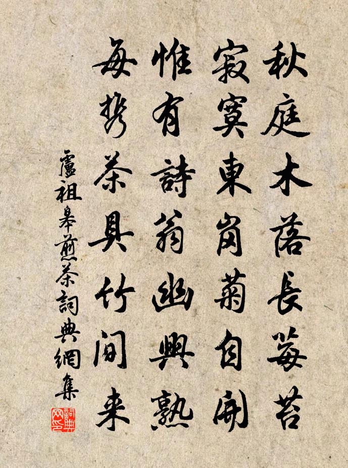 秋庭木落長莓苔,寂寞東崗菊自開。惟有詩翁幽興熟,每攜茶具竹間來。