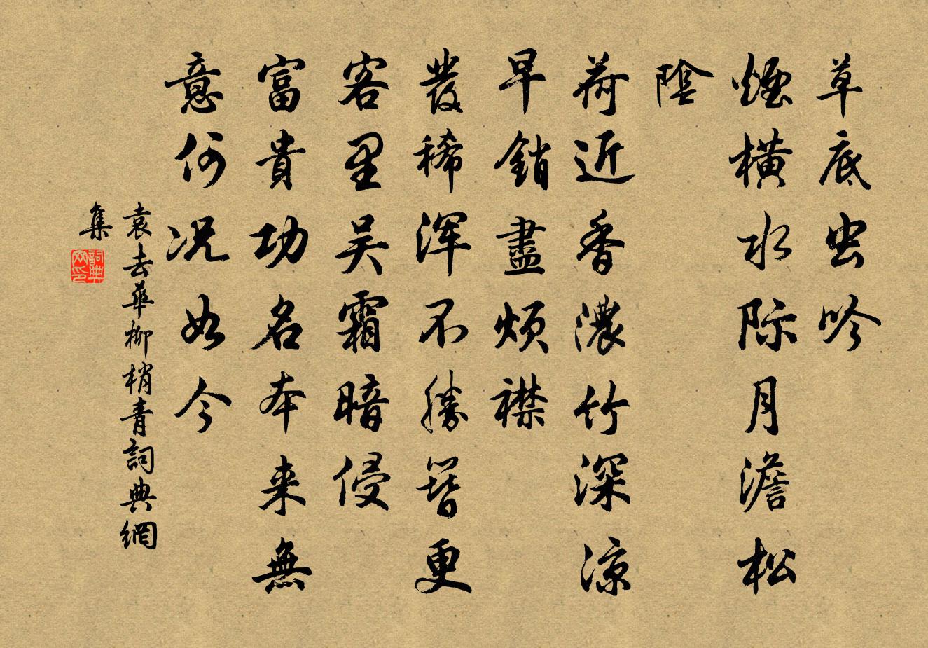 詩詞名句歷史字典書法欣賞書法字典國語詞典說文解字康熙字典古漢語字典標 題 作 者 詩 句 柳梢青作者:袁去華 朝代:宋代柳梢青原文草底蟲吟。煙橫水際,月澹松陰。荷近香濃,竹深涼早,銷盡煩襟。發稀渾不勝簪,更客里、吳霜暗侵。富貴功名,本來無意,何況如今。詩詞問答問:柳梢青的作者是誰?答:袁去華問:柳梢青寫於哪個朝代?答:宋代問:柳梢青是什麼體裁?答:詞袁去華柳梢青書法欣賞柳梢青書法作品詩詞推薦天育二老禪惠示經佛偈答以十詩鄭清之〔宋代〕四十劫來閒坐休,忽拋長舌鬧籃頭。若言面壁為心法,瞿老還輸第一壽。一一光明釋印肅〔宋代〕日月燈光未足奇,若逢肉眼轉迷痴。恆沙眷屬光無二,萬億龍天守護持。無眠虞儔〔宋代〕蛩吟砌下豈知時,我亦無眠有所思。夜永只憐燈作伴,秋涼最許簟先知。十年擾擾夢中事,一笑悠悠世上兒。數盡送少卿張學士知洪州梅堯臣〔宋代〕朱旗畫舸一百尺,五月長江水拍天。穩去先應望廬岳,暫來誰復見龍泉。閣經吏部重為記,山識吳天舊鑄錢。往跡欲之新鄉答崔顥綦毋潛李頎〔唐代〕數年作吏家屢空,誰道黑頭成老翁。男兒在世無產業,行子出門如轉蓬。吾屬交歡此何夕,南家搗衣動歸客。銅爐晦日送窮三首姚合〔唐代〕年年到此日,瀝酒拜街中。萬戶千門看,無人不送窮。送窮窮不去,相泥欲何為。今日官家宅,淹留又幾時。古人夜坐林尚仁〔宋代〕焚香獨坐勘騷經,庭樹無風葉不鳴。靜入夜深聞鼓吹,一池明月亂蛙聲。簡郡中諸生韋應物〔唐代〕守郡臥秋閣,四面盡荒山。此時聽夜雨,孤燈照窗間。藥園日蕪沒,書帷長自閒。惟當上客至,論詩一解顏。嘉泰壬戍歸省墳墓感仲叔舊所惠詩及延慶堂夢姜特立〔宋代〕延慶堂中夢,人言積善家。翠娥環繞句,今日定如何。曾耆英自太和攜所錄謝民師觀妙詩文副以長句趙蕃〔宋代〕別時落落問山風,見日清霜鳴啞鍾。二謝有詩皆可誦,七言兼與見傳宗。舉幡故異司隸救,右袒徒聞呂氏從。君獨萱花劉應時〔宋代〕碧玉長簪出短籬,枝頭腥血耐炎暉。北堂花在親何在,幾對薰風淚濕衣。自禮賢還鵝湖望山頂飛流有作二首張嵲〔宋代〕夾日赤雲方變火,行人渴肺欲生塵。飛流百丈垂虹冷,愧爾山中宴坐人。春日書懷薛能〔唐代〕伯牙琴絕豈求知,往往情牽自有詩。壟月正當寒食夜,春陰初過海棠時。耽書未必酬良相,斷酒唯堪作老師。多病山行見月四言蘇軾〔宋代〕吟喔傲兀,仰晤岩月。遇巘迎崖,銀刓玉齧。源魚噞喁,岸雁臲卼。臥玩我語,聱牙岌嶪。木蘭花慢 席上呈張仲固帥興元辛棄疾〔宋代〕漢中開漢業,問此地、是耶非?想劍指三秦,君王得意,一戰東歸。追亡事、今不見,但山川滿目淚沾衣。落日胡貢麟鄭獬〔宋代〕麟本出中國,無聞貢海濱。豈將遠方獸,煩我太平民。烹割羅牲餼,奔趨掃路塵。漢高嘗聘士,此禮屬蠻人。俗有雪上加霜之諺今日之謂也二詩呈知縣契丈趙蕃〔宋代〕雨雪欣能霽,冰霜苦未和。體孱寒有相,絮敗暖無多。二妙今誰敵,有詩皆可歌。暗中知沈謝,灰里撥陰何。題江郎廟六絕陳淳〔宋代〕好看三石絕奇蹤,自是山靈氣所鍾。致雨興雲功利博,合編祀典以神封。送權侍者游洞庭釋如珙〔宋代〕七十二峰波面出,盧公去後石屏存。高歌數曲游三日,圖畫又添僧一尊。橫吹曲辭出塞曲於鵠〔唐代〕微雪將軍出,吹笳天未明。觀兵登古戍,斬將對雙旌。分陣瞻山勢,潛軍制馬鳴。如今新史上,已有滅胡名。單于名句推薦垓下美人泣楚歌,定陶美人泣楚舞,真龍亦鼠虎亦鼠。王象春《書項王廟壁》 其言必信,其行必果,已諾必誠司馬遷《史記·七十列傳·遊俠列傳》 吾本乘興而行,興盡而返,何必見戴!劉義慶《世說新語·任誕》 天涯也有江南信。梅破知春近。黃庭堅《虞美人·宜州見梅作》 大丈夫處事,論是非,不論禍福王永彬《圍爐夜話·第二五則》 屈盤戲白馬,大笑上青山。李白《登敬亭北二小山余時送客逢崔侍御並登此地》 林外鳴鳩春雨歇,屋頭初日杏花繁。歐陽修《田家》 取次花叢懶回顧,半緣修道半緣君。元稹《離思五首·其四》 威宜自嚴而寬,先寬後嚴者人怨其酷。洪應明《菜根譚·概論》 更被夕陽江岸上,斷腸煙柳一絲絲。韋莊《江外思鄉》