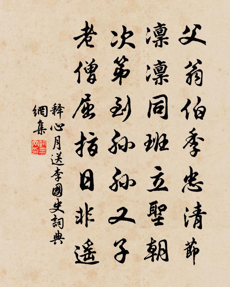 詩詞名句歷史字典書法欣賞書法字典國語詞典說文解字康熙字典古漢語字典標 題 作 者 詩 句 送李國史作者:釋心月 朝代:宋代送李國史原文父翁伯季忠清節,凜凜同班立聖朝。次第到孫孫又子,老僧屈指日非遙。詩詞問答問:送李國史的作者是誰?答:釋心月問:送李國史寫於哪個朝代?答:宋代釋心月送李國史書法欣賞送李國史書法作品詩詞推薦和閩人龔玉峰韻何夢桂〔宋代〕病鶴衰翎嘆折傷,惟余芝草療腸。陣圖死不忘魚復,江艦生難候馬當。自分無帷埋畜狗,尚憐有肆返屠羊。頭顱老眼兒媚高觀國〔宋代〕輕雲終被斷雲留。不肯放春愁。翠樓舊倚,粉牆重見,歌酒風流。今朝畢竟吟情澹,芳意未全酬。東風向晚,鶯花題忠憫公送婿邢得昭歸婺女詩後徐木潤〔宋代〕小人護局可畏,君子得與常遲。老秦歿已一歲,胡李方始量移。滴翠松黃庚〔宋代〕老翠蟠空一樣高,月分寒影落庭皋。喔詩猛把闌乾拍,宿鶴驚飛露濕袍。被詔假軺傳詣闕宋庠〔宋代〕輕郵千里給台符,曉月征驂上道初。自比漢儒恩太渥,一生龔勝恨私車。野意陸游〔宋代〕堤長逾十里,村小隻三家。山客弛樵擔,溪翁鳴釣車。花深迷蝶夢,雨急散蜂衙。衰疾新年減,青鞋上若耶。三韻雜詠七首李若川〔宋代〕瞽者不視色,聾者不聽聲。觀其動作間,視聽由心生。一心苟有蔽,耳目絕聰明。半俸自戊辰二月置不復言作絕句陸游〔宋代〕俸券新同廢紙收,迎賓僅有一絁裘。日鋤幽圃君無笑,猶騰牆東學儈牛。東池張耒〔宋代〕東池暮春風景妍,汩汩淺渠鳴細泉。菖蒲遶堤青似劍,荷葉出水大如錢。薔薇著花方未已,楊柳飛絮任飄然。鄰翁送僧歸日本釋文珦〔宋代〕遠人仍遠別,把手話江皋。積水一韓路,古風八月濤。海門山似粒,洋嶼樹如毛。他日難通信,想思夢寐勞。早梅芳/喜遷鶯李之儀〔宋代〕雪初花銷,斗覺花寒將變。花已報梅梢花暖。日邊霜外,迤邐枝條自柔軟。嫩苞勻點綴,綠萼輕裁剪。隱深心,未寄叔文石介〔宋代〕幾年持筆事征西,未省樽前略展眉。草檄朝慷腕勞脫,論兵夜苦舌瘡痍。報君自說心如石,尤國人言鬢欲絲。若紀臨江仙(同前)晁補之〔宋代〕常記河陽花縣裡,恰如飯顆山逢。春城何處滿絲桐。綸巾並羽扇,君有古人風。重向梁王台畔見,黃花綠酒誰同。歲初喜皇甫侍御至嚴維〔唐代〕湖上新正逢故人,情深應不笑家貧。明朝別後門還掩,修竹千竿一老身。早春司空圖〔唐代〕傷懷同客處,病眼卻花朝。草嫩侵沙短,冰輕著雨消。風光知可愛,容發不相饒。早晚丹丘去,飛書肯見招。大人築室將畢道祖亦作宅基治園作四詩示道祖葛立方〔宋代〕世事只如許,幽居誠樂哉。報安知楚竹,索笑得江梅。岸放平湖入,窗邀遠岫來。兩家車馬地,莫遣染蒼苔。虞美人(無為作)張孝祥〔宋代〕雪消煙漲清江浦。碧草春無數。江南幾樹夕陽紅。點點歸帆吹盡、晚來風。樓頭自擫昭華管。我已無腸斷。斷行雙送周府尹三首方回〔宋代〕樂土豐年舊觀不,使君心事最相關。只因標緻清於水,便有聲名重若山。一室爐香書史畔,萬家杯酒管弦間。漢庭郊廟朝會歌辭紹熙元年恭上壽星聖皇太后至尊佚名〔宋代〕慈皇天臨,睟表怡怡。欽哉聖子,親奉玉卮。豐抃嵩呼,歡浹華夷。邇臣捧同,是恪是祗。紅梅楊平洲〔宋代〕誰將醉里春風面,換卻平生玉雪身。賴得月明留瘦影,芳心香骨見天真。名句推薦鞭影落春堤,綠錦鄣泥卷。納蘭性德《生查子·鞭影落春堤》 握手西風淚不乾,年來多在別離間。納蘭性德《於中好·送梁汾南還為題小影》 石溪久住思端午,館驛樓前看發機。盧肇《競渡詩 / 及第後江寧觀競渡寄袁州剌史成應元》 恨入空帷鸞影獨,淚凝雙臉渚蓮光,薄情年少悔思量。顧敻《浣溪沙·荷芰風輕簾幕香》 識時務者為俊傑,昧先幾者非明哲。程登吉《幼學瓊林·卷三·人事》 利天下者,天下啟之;害天下者,天下閉之。姜子牙《六韜·武韜·發啟》 龜靈未免刳腸患,馬失應無折足憂。白居易《放言五首·其二》 如花美眷,似水流年曹雪芹《紅樓夢·第二十三回》 一蓑煙雨任平生。蘇軾《定風波·莫聽穿林打葉聲》 霧失樓台,月迷津渡。秦觀《踏莎行·郴州旅舍》