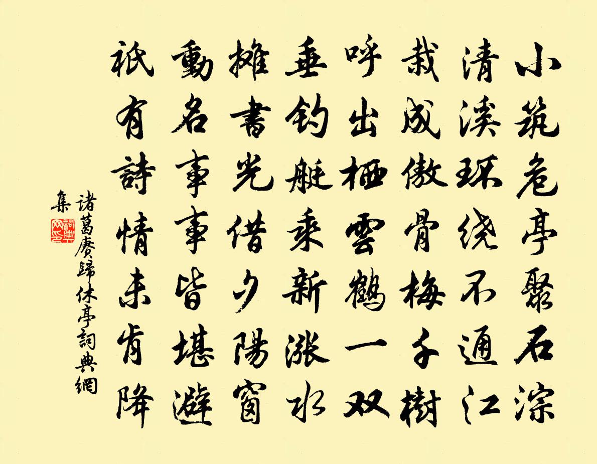 詩詞名句歷史字典書法欣賞書法字典國語詞典說文解字康熙字典古漢語字典標 題 作 者 詩 句 歸休亭作者:諸葛賡 朝代:宋代歸休亭原文小築危亭聚石淙,清溪環繞不通江。栽成傲骨梅千樹,呼出棲雲鶴一雙。垂釣艇乘新漲水,攤書光借夕陽窗。動名事事皆堪避,祇有詩情未肯降。詩詞問答問:歸休亭的作者是誰?答:諸葛賡問:歸休亭寫於哪個朝代?答:宋代諸葛賡歸休亭書法欣賞歸休亭書法作品詩詞推薦六言四鄧深〔宋代〕三峽上游煙水,四川極險關山。滿市笙歌晝永,漫山桃花春閒。與致道約游陽華尋以雨阻追和山欲集中岑公澗李長庚〔宋代〕垂垂雨腳幾時晴,便擬扁舟乘興行。想得斜川今更好,勝游恨不繼淵明。秋晚雜書三十首方回〔宋代〕我觀滿囷粟,一粟之所充。海魚千百億,孕卵與粟同。春菊寸許芽,霜華秋叢叢。誤耘或失溉,槁死厥壤童。萬物贈元秘書崔峒〔唐代〕舊書稍稍出風塵,孤客逢秋感此身。秦地謬為門下客,淮陰徒笑市中人。也聞阮籍尋常醉,見說陳平不久貧。幸有頌古十八首釋寶印〔宋代〕李公要勸張公酒,卻被張公罰一杯。珠繞團團休錯會,還家拍手笑哈哈。如夢令汪晫〔宋代〕一隻船兒沒賽。七十六年裝載。把柁更須牢,風飽蒲帆輕快。無礙。無礙。匹似子猷訪戴。偈頌二十三首釋雲岫〔宋代〕發生爪長常如此,筋轉脈搖休問他。動靜不乾消長事,從教門外雪寒多。寄鄭谷郎中齊己〔唐代〕上國誰傳訊息過,醉眠醒坐對嵯峨。身離道士衣裳少,筆答禪師句偈多。南岸郡鍾涼度枕,西齋竹露冷沾莎。還應題桐柏石道士院妙聲堂曾惇〔宋代〕門外千峰翠作堆,道人名籍在丹台。是非榮辱俱休問,只放泉聲入耳來。次韻斯遠二十七日道中見懷二首趙蕃〔宋代〕我姿甚不敏,與俗仍倍殊。難貪太常酒,顧歸陶令廬。山中亦何有,寂寞誰與娛。晤言闊無友,展卷聊得書。人生郊廟歌辭。後唐宗廟樂舞辭。永平舞佚名〔唐代〕慶傳瓚祚,位正瑤圖。功宣四海,化被八區。靜彰帝道,動合乾符。千秋萬祀,永荷昭蘇。頌古八首釋師一〔宋代〕岩頭婆子鐵肝心,擊碎乾坤覓賞音。眨上眉毛如下薦,岳陽惡浪轉增深。聞桂香張九成〔宋代〕清晨未盥櫛,桂香遞秋風。不知此花意,何為惱衰翁。舉頭復何有,燕雁書晴空。景物如此好,誰雲吾道窮。送陸歙州傪韓愈〔唐代〕我衣之華兮,我佩之光。陸君之去兮,誰與翱翔。斂此大惠兮,施於一州。今其去矣,胡不為留。我作此詩,歌於句李埴〔宋代〕日射紅鸞扇,風清白野樽。安居瀕江小藍留三小詩李新〔宋代〕觀水觀瀾見會同,人情難似水朝東。寄聲囑付王家老,深鎖堂前悲翠籠。滿庭芳蔡伸〔宋代〕風卷龍沙,雲垂平野,晚來密雪交飛。坐看闌檻,瓊蕊遍寒枝。妝點蘭房景致,金鋪掩、簾幕低垂。紅爐畔,淺斟詠史上武帝陳普〔宋代〕先帝齋宮內弄兒,阿嬌金屋篡歌姬。披香博士真才子,劉氏家傳卻未知。彭檢法號仍舊釋心月〔宋代〕者漢本來無面目,幾年向外空馳逐。驀然憶著便歸來,六六依前三十六。送李使君赴瓊州兼五州招討使無可〔唐代〕分竹雄兼使,南方到海行。臨門雙旆引,隔嶺五州迎。猿鶴同枝宿,蘭蕉夾道生。雲垂前騎失,山豁去帆輕。雨霧名句推薦碧雲天,黃葉地,秋色連波,波上寒煙翠。范仲淹《蘇幕遮·懷舊》 何意更觴昌歜酒,為君擊節一長歌。趙蕃《端午三首》 二月春花厭落梅。仙源歸路碧桃催。渭城絲雨勸離杯。晏幾道《浣溪沙·二月春花厭落梅》 荒戍落黃葉,浩然離故關。溫庭筠《送人東遊》 龍噓氣成雲,雲固弗靈於龍也。韓愈《雜說一·龍說》 皮之不存,毛將安傅?左丘明《左傳·僖公·僖公十四年》 慘慘柴門風雪夜,此時有子不如無。黃景仁《別老母》 窮則變,變則通,通則久。佚名《易傳·繫辭傳下·第二章》 人迷洞庭水,雁度瀟湘煙。李白《郢門秋懷》 長歌吟松風,曲盡河星稀。李白《下終南山過斛斯山人宿置酒》