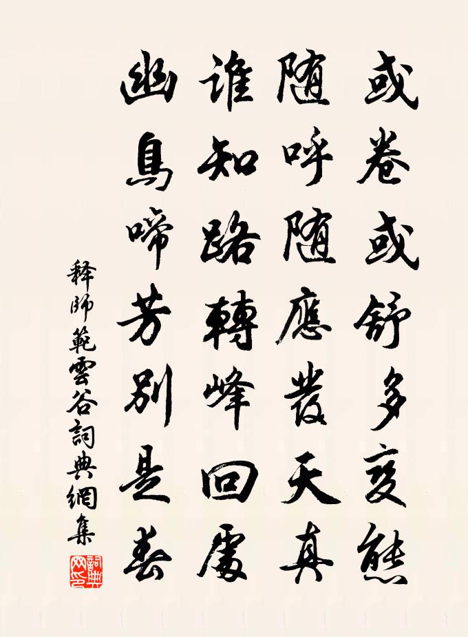 詩詞名句歷史字典書法欣賞書法字典國語詞典說文解字康熙字典古漢語字典標 題 作 者 詩 句 雲谷作者:釋師範 朝代:宋代雲谷原文或卷或舒多變態,隨呼隨應發天真。誰知路轉峰迴處,幽鳥啼芳別是春。詩詞問答問:雲谷的作者是誰?答:釋師範問:雲谷寫於哪個朝代?答:宋代釋師範雲谷書法欣賞雲谷書法作品詩詞推薦醉題陸游〔宋代〕目光炯炯射車牛,何至隨人作浪愁。身處江湖如富貴,心親魚鳥等朋儔。孤帆滅沒三湘曉,野店荒寒二華秋。醉墨偈頌二十二首釋道生〔宋代〕南邊是黑雲,今日應有雨。宜林宜豆,宜禾宜黍。雖然歲稔年豐,粒粒幾多辛苦。為報參玄人,要須知落處。昔方孚若主管雲台予監衡岳每歲瑞慶節常聚廣劉克莊〔宋代〕同作祠官荷聖朝,年年相待放生橋。精廬此日來無伴,稽首爐熏自祝堯。殘雪未消林用中〔宋代〕凍壓林巢欲墮鴉,素花飄落結煙霞。陰風慘澹青山老,不辨梅花與雪花。萬年春馬鈺〔元代〕道人財色酒雖無。一點無明著甚除。惡念不生歸瑩素,觸來勿競證元初。我人起處愁無極,煙火消時樂有餘。欲學奉和御製讀唐書夏竦〔宋代〕天祚文皇德,元成雅道施。納忠裨闕政,偃革致昌期。宴喜刀方解,人亡鑒遽隳。數行遺奏在,猶可動神祗。春晚五言寄夢得朱松〔宋代〕美景足可惜,殘春尤不堪。晚英余燕蹴,熟顆墜鶯含。歲月蓬雙鬢,生涯粟一甔。唯思對公瑾,把酒話江南。別小女鄭獬〔宋代〕一別寸腸破,再別玄發衰。人生無百年,那堪長別離。萬事從委蛻,漆園真誕辭。去去復何言,東風雙淚垂。鹿郎中山居高似孫〔宋代〕非是拜龐公,何繇識此峰。自唐無兩見,如漢有高蹤。徑吐歸來菊,山連種老松。輕飛雲惟健,精煉玉為容。鶴要贈別史堯弼〔宋代〕天地有佳處,岷峨橫翠微。茅廬介山趾,嵐色入書幃。共社公應可,論心我亦稀。他年能似約,江漢會思歸。即景黃庚〔宋代〕籬落西風野老家,閒看景物感年華。柳衰荷改芙蓉死,交割秋光與菊花。和王龍圖七夕直宿宋祁〔宋代〕二星秋早駕雲車,此夕聞君寓直廬。月在宮中穿線處,香傳樓下曝衣餘。橋烏徑度明河近,巢鳳歸翻暝閣虛。寂寞滿江紅晁端禮〔宋代〕五兩風輕,移舟向、斜陽島外。最好是、瀟湘煙景,自然心會。倒影芙蓉明鏡底,更折花嗅西風裡。待問君、明日拂霓裳晏殊〔宋代〕樂秋天。晚荷花綴露珠圓。風日好,數行新雁貼寒煙。銀簧調脆管,瓊柱撥清弦。捧觥船。一聲聲、齊唱太平年。次韻和吳侍郎謝王陝州寄酒宋庠〔宋代〕遙聞齋酎挈,來佐客觴酣。棠野歌新續,兵廚興舊諳。竹供醅上色,蘭獻液中甘。欲識西台勝,厭厭夜雪庵。春寢白居易〔唐代〕何處春暄來,微和生血氣。氣薰肌骨暢,東窗一昏睡。是時正月晦,假日無公事。爛熳不能休,自午將及未。緬思端午豐宅之提舉送酒戴復古〔宋代〕海榴花上雨蕭蕭,自切菖蒲泛濁醪。今日獨醒無用處,為公痛飲讀離騷。贈句芒神李商隱〔唐代〕佳期不定春期賒,春物夭閼興咨嗟。願得句芒索青女,不教容易損年華。壽崔帥卿七絕洪咨夔〔宋代〕連蜷雌霓墮晴空,光照書樓捲紙紅。天為斯文開瑞應,海南海北一宗工。春社有感陸游〔宋代〕憔悴前朝白髮郎,祠庭賦祿玷恩光。寸心未與年俱老,萬事惟憑酒暫忘。穿仗兩曾觀揖遜,扶犁獨幸返耕桑。耆年名句推薦一言足以召大禍,故古人守口如瓶,惟恐其覆墜也王永彬《圍爐夜話·第四八則》 思則有備,有備無患左丘明《左傳·襄公·襄公十一年》 扁舟去作江南客,旅雁孤雲。朱敦儒《採桑子·彭浪磯》 農不出則乏其食,工不出則乏其事,商不出則三寶絕,虞不出則財匱少。司馬遷《史記·七十列傳·貨殖列傳》 贈君明月滿前溪,直到西湖畔。毛滂《燭影搖紅·送會宗》 多君相門女,學道愛神仙李白《送內尋廬山女道士李騰空二首》 愁因薄暮起,興是清秋發。孟浩然《秋登蘭山寄張五》 小扇引微涼,悠悠夏日長。顧太清《菩薩蠻·端午日詠盆中菊》 渡頭餘落日,墟里上孤煙。王維《輞川閒居贈裴秀才迪》 生當作人傑,死亦為鬼雄。李清照《夏日絕句》