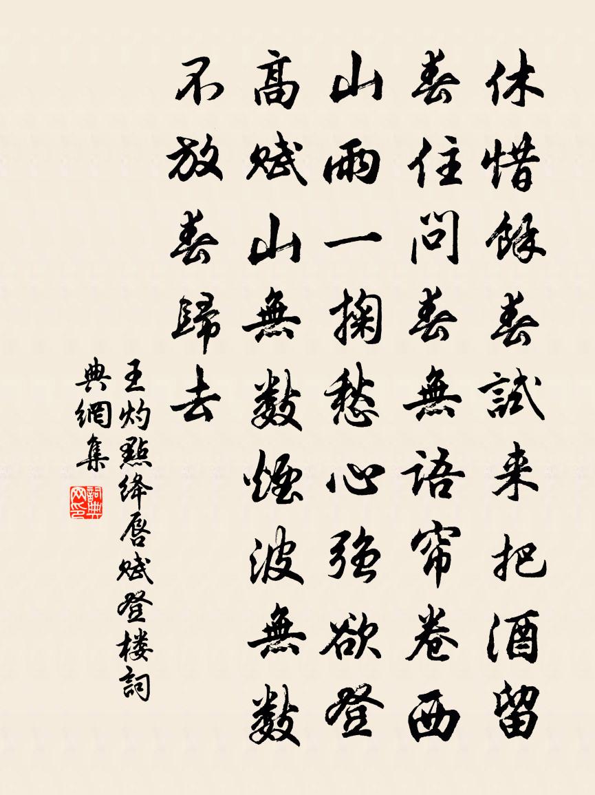 詩詞名句歷史字典書法欣賞書法字典國語詞典說文解字康熙字典古漢語字典標 題 作 者 詩 句 點絳唇(賦登樓)作者:王灼 朝代:宋代點絳唇(賦登樓)原文休惜余春,試來把酒留春住。問春無語。簾卷西山雨。一掬愁心,強欲登高賦。山無數。煙波無數。不放春歸去。詩詞問答問:點絳唇(賦登樓)的作者是誰?答:王灼問:點絳唇(賦登樓)寫於哪個朝代?答:宋代王灼點絳唇(賦登樓)書法欣賞點絳唇(賦登樓)書法作品詩詞推薦陳用之學士輓詞秦觀〔宋代〕雲台觀者候昏明,奎壁躔中失二星。上界真人重離別,陰風一夜攪青冥。秋深過田家吳龍翰〔宋代〕策杖行行過石橋,農家雞黍遠相招。田鋪棋局露雅下,山展畫屏煙雨描。病骨枯於秋後葉,詩懷雄似海東潮。一聲紹興以後時享二十五首真宗〔宋代〕[大呂為角]聖靈在天,九嚴崇深。風馬雲車,紛其顧臨。江城子晁端禮〔宋代〕幽香閒艷露華濃。晚妝慵。略勻紅。春困厭厭,常愛鬢雲鬆。早是自來蓮步小,新樣子,為誰弓。畫堂西下小欄東示師文王冕〔元代〕爾父既清苦,爾身何可言?且宜修道德,不必問田園。花落江城晚,煙橫野樹昏。此時光景異,只合住山村。依韻閻中孚職方暴雨幸涼梅堯臣〔宋代〕天津赫日欲焦拆,西北風來斗減威。太帝宮庭無暑入,大明冠佩退朝歸。泠泠冷襲琉璃簟,奕奕涼翻翡翠幃。交扇過淮陰縣楊萬里〔宋代〕索寞淮陰縣,人家草草中。荻籬緯春勝,茅屋學船篷。今日非昨日,南風轉北風。霍然香霧散,放出一輪紅。武陵春 贈李道人拆字譚處端〔元代〕日勸君君不省,下越貪忙。識常常內轉傷。肯恁思量。養靈根牢固取,目好回光。兀騰騰萬事忘。內*仙香。蘇才翁輓詩二首歐陽修〔宋代〕握手接歡言,相知二十年。文章家世事,名譽弟名賢。可惜英魂掩,惟余醉墨傳。秋風衰柳岸,撫柩送歸船。靜暉樓曉坐鄧深〔宋代〕嶺宿寒雲薄,樓迎曉日斜。危檐排語雀,落木點啼鴉。佛鼓依山寺,炊煙隔岸家。移時收足坐,清興會煙霞。菩薩蠻(披風)侯置〔宋代〕靚妝金翠盈盈晚。凝情有恨無人管。何處一簾風。故人天際逢。從教香撲鬢。只怕繁華盡。牢落正悲秋。非□誰解題石門張氏圍莫若沖〔宋代〕為米徒勞束帶難,當時彭澤便休官。高情曾賦歸來句,盡入名園扁署看。送彭孕先赴辰州教授趙蕃〔宋代〕因行碧湘門,倏念黃草尾。曩辭戴安道,同者歐陽子。那知三年過,僅謂一日爾。惟辰雖陋邦,分教多名士。前瞻高宗郊前朝獻景靈宮二十一首真宗〔宋代〕於赫炎榮,十葉華耀。屢茲郊報,陟降在廟。其降伊何,椒漿桂酒。再拜斟酌,永御九有。南鄉子 贈歌者怡雲,和盧處道韻張野〔元代〕靄靄度春空。長妒花陰月影中。曾為清歌還少駐,匆匆。變作春前喜氣濃。一笑為誰容。只許幽人出處同。卻恐等暑雨陸游〔宋代〕欲雨未雨雷車奔,欲睡不睡人思昏。蠻童正報煮茶熟,忽有野僧來叩門。久雨五首劉克莊〔宋代〕復置漢平準,稍修隋義倉。群公猶禹稷,陛下況堯湯。送韋秀才赴舉顧況〔唐代〕鄱陽中酒地,楚老獨醒年。芳桂君應折,沈灰我不然。洛橋浮逆水,關樹接非煙。唯有殘生夢,猶能到日邊。美人倚樓圖游九言〔宋代〕檐頭燕子說春寒,蝴蝶悠悠午夢殘。睡起高樓多少恨,天涯小雨怯闌乾。偶興四首韓元吉〔宋代〕桂花飄盡菊花黃,閒對芳叢靜愛香。堂下草深須一丈,會看春決滿池塘。名句推薦陌上風光濃處。第一寒梅先吐。李彌遜《十樣花·陌上風光濃處》 江海之所以能為百穀王者,以其善下之,故能為百穀王。老子《老子·德經·第六十六章》 十年舊夢無尋處,幾度新春不在家。吳文英《思佳客·癸卯除夜》 滿地黃花堆積。憔悴損,如今有誰堪摘?李清照《聲聲慢·尋尋覓覓》 荊溪白石出,天寒紅葉稀。王維《山中》 風摧寒棕響,月入霜閨悲。李白《獨不見》 檐流未滴梅花凍,一種清孤不等閒。鄭燮《山中雪後》 授書不在徒多,但貴精熟王陽明《傳習錄·卷下·右南大吉錄》 知者樂水,仁者樂山。孔子弟子《論語·雍也篇》 盡日空濛無所見,雁行斜去字聯聯。韋莊《登鹹陽縣樓望雨》