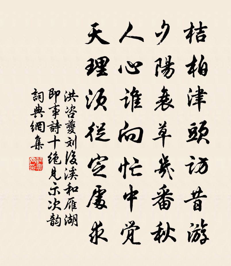詩詞名句歷史字典書法欣賞書法字典國語詞典說文解字康熙字典古漢語字典標 題 作 者 詩 句 劉後溪和雁湖即事詩十絕見示次韻作者:洪咨夔 朝代:宋代原文桔柏津頭訪昔游,夕陽衰草幾番秋。人心誰向忙中覺,天理須從定處求。詩詞問答問:《劉後溪和雁湖即事詩十絕見示次韻》的作者是誰?答:洪咨夔問:該詩寫於哪個朝代?答:宋代書法欣賞劉後溪和雁湖即事詩十絕見示次韻書法作品詩詞推薦晚歸山居劉滄〔唐代〕寥落霜空木葉稀,初行郊野思依依。秋深頻憶故鄉事,日暮獨尋荒徑歸。山影暗隨雲水動,鐘聲潛入遠煙微。娟娟游日山馬良器〔宋代〕雲外朝陽照古台,千岩宿霧一時開。使君久負登臨約,今日朱轓特地來。煙波即事陸游〔宋代〕落雁沙邊艇子斜,分明清夢上三巴。眼明一點炊煙起,不是漁家即酒家。偈頌一百零二首釋紹曇〔宋代〕是是,荊棘叢林,黃金田地。非非,伊蘭旃蔔,甘露蒺藜。是不是,非不非,鶴健將雛去,猿閒抱子歸。醉中長歌陸游〔宋代〕闌乾斗柄搖天東,人間一夜回春風。注桃染柳歲相似,惟我衰顏非昔紅。可憐逢春不自感,更欲使氣驚兒童。煙郊挽錢仲耕運使孫應時〔宋代〕族廩規模大,鄉評德義尊。家傳忠孝舊,國賴典刑存。曷不登三壽,嗟誰起九原。晚生長自恨,早失拜龍門。翠羽辭梅堯臣〔宋代〕秦女乘鸞遺翠羽,落在人間與風舞。風休不歸誰作主,此郎拾取裝金縷。郎家主婦愛且憐,系向裙腰同出處。朝來西江月范智聞〔宋代〕紫素全如玉琢,清音不假金妝。海沈時許試芬芳。仿佛雲飛仙掌。煙縷不愁淒斷,寶釵還與商量。佳人特特為翻香訪陳復齋寺丞於私第戴復古〔宋代〕以時為出處,真有古人風。奉母易為孝,事君難盡忠。閒居非傲世,直氣尚摩空。語及朝廷事,乾坤萬感中。漢上偶題李涉〔唐代〕謫仙唐世游茲郡,花下聽歌醉眼迷。今日漢江煙樹盡,更無人唱白銅鞮。漁家傲呂勝己〔宋代〕特為梅花來渭水。有人折得橫梢至。粉毖香慳春意未。多應是。江南信息爭先寄。水綠山青風日美。此時正愜幽人過虎門康有為〔清代〕粵海重關二虎尊,萬龍轟斗事猶存。至今遺壘余殘石,白浪如山過虎門。櫂歌九章寄彭鶴林白玉蟾〔宋代〕碧潭藏老龍,夜半水底吟。激飛寒空露,淒動幽人心。別州民白居易〔唐代〕耆老遮歸路,壺漿滿別筵。甘棠無一樹,那得淚潸然?稅重多貧戶,農飢足旱田。唯留一湖水,與汝救凶年。[今題雜書卷六言三首劉克莊〔宋代〕論篤惟昌黎伯,史法止太史公。誰雲孔墨道二,但見聃非傳同。太上皇帝輓詩王炎〔宋代〕億兆方同慶,三宮洽孝慈。坤輿俄{拖扌換弓}衛,天極遂纏悲。共憾遺丹鼎,無由奉玉卮。光輝終不熄,徽號日臘月二日雪齊與王君玉榮淳甫謁山陰陸放翁夜孫應時〔宋代〕十日山陰雪塞門,曉來飛霰尚紛紛。扁舟忽憶尋安道,載酒還成訪子云。便喜晴湖光璀璨,何妨歸路日黃曛。侯家食楊梅三首曾幾〔宋代〕年年梅里見諸楊,火齊堆盤更有香。風味十分如荔子,何妨盛著絳紗囊。題寺壁二首呂群〔唐代〕路行三蜀盡,身及一陽生。賴有殘燈火,相依坐到明。社後辭巢燕,霜前別蒂蓬。願為蝴蝶夢,飛去覓關中。寒食前三日行腳遇雨楊萬里〔宋代〕信腳那知遠,雖勞亦快哉。如何寒食近,無數野花開。碧草望中去,黑雲頭上來。吾行吾自返,雨子不須催。名句推薦牆頭馬上遙相顧,一見知君即斷腸。白居易《井底引銀瓶·止淫奔也》 逞奸謀事,事難必其穩重,可惜他徒自壞心。王永彬《圍爐夜話·第五一則》 事父母幾諫,見志不從,又敬不違,勞而不怨。孔子弟子《論語·里仁篇》 茅檐長掃淨無苔,花木成畦手自栽。王安石《書湖陰先生壁》 浮雲終日行,遊子久不至。杜甫《夢李白二首·其二》 兵不完利,與無操者同實管仲《管子·參患》 喧鳥覆春洲,雜英滿芳甸。謝朓《晚登三山還望京邑》 移風易俗,莫善於樂。孔子及其弟子《孝經·廣要道》 不鳴則已,一鳴驚人。司馬遷《滑稽列傳》 風暖鳥聲碎,日高花影重。杜荀鶴《 * 怨》
