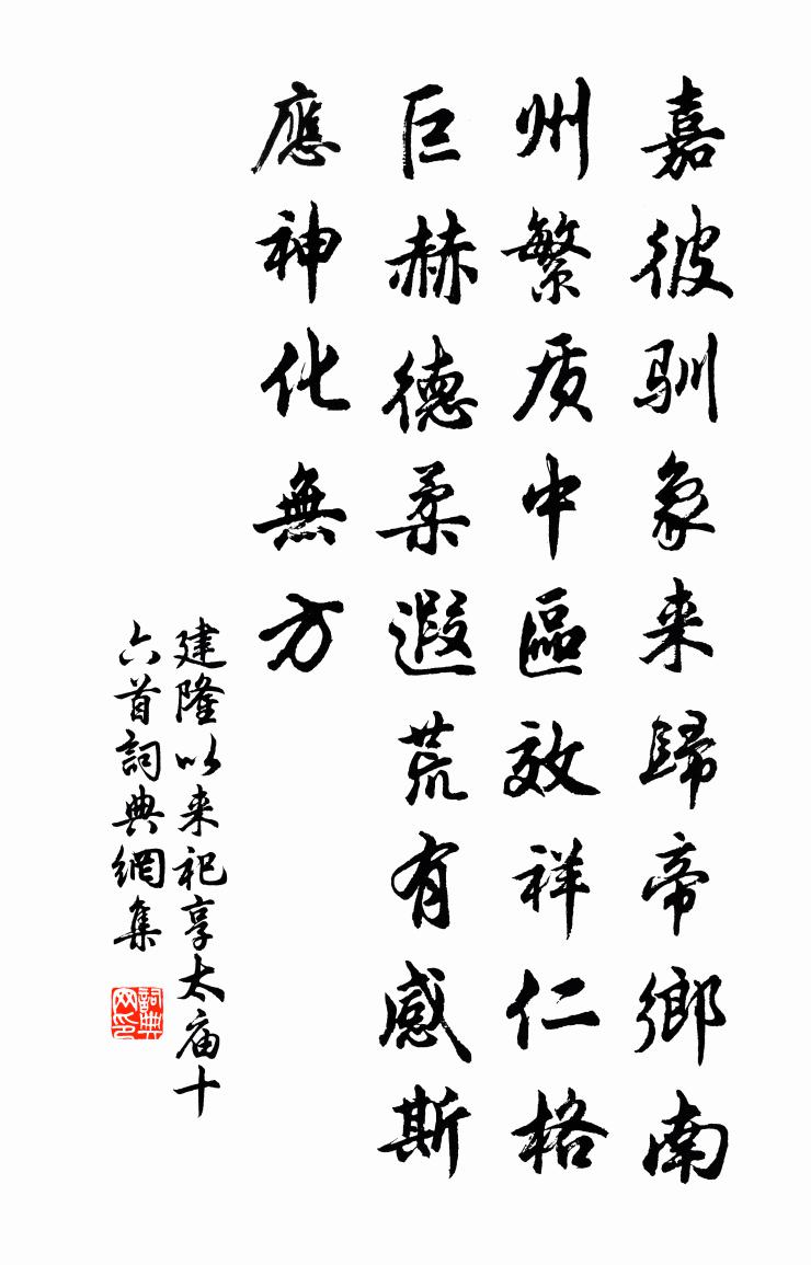 詩詞名句歷史字典書法欣賞書法字典國語詞典說文解字康熙字典古漢語字典標 題 作 者 詩 句 建隆以來祀享太廟十六首作者:佚名 朝代:宋代建隆以來祀享太廟十六首原文嘉彼馴象,來歸帝鄉。南州繁質,中區效祥。仁格巨赫,德柔遐荒。有感斯應,神化無方。詩詞問答問:建隆以來祀享太廟十六首的作者是誰?答:佚名問:建隆以來祀享太廟十六首寫於哪個朝代?答:宋代問:佚名的名句有哪些?答:佚名名句大全佚名建隆以來祀享太廟十六首書法欣賞建隆以來祀享太廟十六首書法作品詩詞推薦送友人之上都法振〔唐代〕玉帛征賢楚客稀,猿啼相送武陵歸。湖頭望入桃花去,一片春帆帶雨飛。紫蓋峰前作小圃日親圃事情見乎辭呈伯氏兼簡胡宏〔宋代〕有志從來不浪憂,只憂心不似前修。數菑未況已頭白,待獲忘情在晚秋。自覺才疏勝北海,又無經學震西州。甘為答蘇武書李陵〔兩漢〕子卿足下: 勤宣令德,策名清時,榮問休暢,幸甚幸甚。遠托異國,昔人所悲,望風懷想,能不依依?昔者不防江行五首劉子翬〔宋代〕朝來殺氣秋,千里無立草。翩翩黑幟飛,結壘天長道。獵罷楚天寒,黃雲淡如掃。西征范田遇雪三絕陳淳〔宋代〕夜宿荒村曰范田,聲聲頻滴屋檐前。朝來揭起柴扉看,滿目青山白玉巔。滿庭芳馬鈺〔元代〕山侗昔日,忒*暮故。肯替兒孫死去。正受艱難,忽爾風仙救度。提出迷津海,到長生、彼岸回顧。方知得,在前環波亭曾鞏〔宋代〕水心還有拂雲堆,日日應須把酒杯。楊柳巧含煙景合,芙蓉爭帶露華開。城頭山色相圍出,檐底波聲四面來。誰信偈釋戒香〔宋代〕孟冬改旦曉天寒,葉落歸根露遠山。不是見聞生滅法,當頭莫作見聞看。頌古三十二首釋明辯〔宋代〕體量非功不墮今,星移斗換豈同輪。多年曆日雖無用,犯著應須總滅門。夜坐書懷虞儔〔宋代〕夢覺誰呼小玉頻,分燈魔女笑波旬。暮年禪悅渾知味,少日文章豈有神。赤腳玉川容老婢,綠珠金谷漫佳人。玄冥句胡銓〔宋代〕有水不栽蓮。當時號令君聽取,白戰無須帶步叉。嘉熙戊戌季春一日畫溪吟客王子信為亞愚詩禪王諶〔宋代〕蘭芷流來水亦香,滿汀鷗鷺動斜陽。聲欸乃,間鳴榔,儂家只住岸西旁。贈筆工周宣王洋〔宋代〕靜聞孤卓漏聲遲,午轉花陰書景移。能事莫憂身不足,人間不用石榴皮。景陽宮井雙桐李商隱〔唐代〕秋港菱花乾,玉盤明月蝕。血滲兩枯心,情多去未得。徒經白門伴,不見丹山客。未待刻作人,愁多有魂魄。誰將驀山溪張孝祥〔宋代〕清都絳闋,我自經行慣。璧月帶珠星,引鈞天、笙簫不斷。寶簪瑤佩,玉立拱清班。天一笑,物皆春,結得清虛伴跋天台王仲言乞米詩楊萬里〔宋代〕敢言縮項更長腰,黃獨青精也絕苗。尚有囊中餐玉法,藍田山里過明朝。減字木蘭花(二十六日立春)張孝祥〔宋代〕春如有意。未接年華春已至。春事還新。多得年時五日春。春郊便綠。只向臘前春已足。屈指元宵。正是新春二十送介卿之官金台蔡戡〔宋代〕淵明去彭澤,斯立佐藍田。家近真良便,官閒任左遷。相望雖百里,此別又三年。擬辦登山屐,從君訪洞天。金陵覽古秦淮朱存〔唐代〕一氣東南王鬥牛,祖龍法潛為子憂。金陵地脈何曾斷,不覺真人已姓劉。西湖鄭清之〔宋代〕黑雲妒日故要遮,剩得輕紅一縷霞。小雨挾風針水面,滿奩皺谷起團花。名句推薦昔歲逢太平,山林二十年。元結《賊退示官吏》 襄陽古道灞陵橋,詩興與秋高。完顏璹《朝中措·襄陽古道灞陵橋》 男兒不展風雲志,空負天生八尺軀。馮夢龍《警世通言·卷四十》 浩蕩離愁白日斜,吟鞭東指即天涯。龔自珍《己亥雜詩·其五》 芳草無情,更在斜陽外范仲淹《蘇幕遮·懷舊》 老來多健忘,唯不忘相思。白居易《偶作寄朗之》 怕歌愁舞懶逢迎。妝晚托春酲。陸游《朝中措·代譚德稱作》 竹憐新雨後,山愛夕陽時。錢起《谷口書齋寄楊補闕》 月過十五光明少,人到中年萬事休。佚名《增廣賢文·上集》 芰荷迭映蔚,蒲稗相因依。謝靈運《石壁精舍還湖中作》