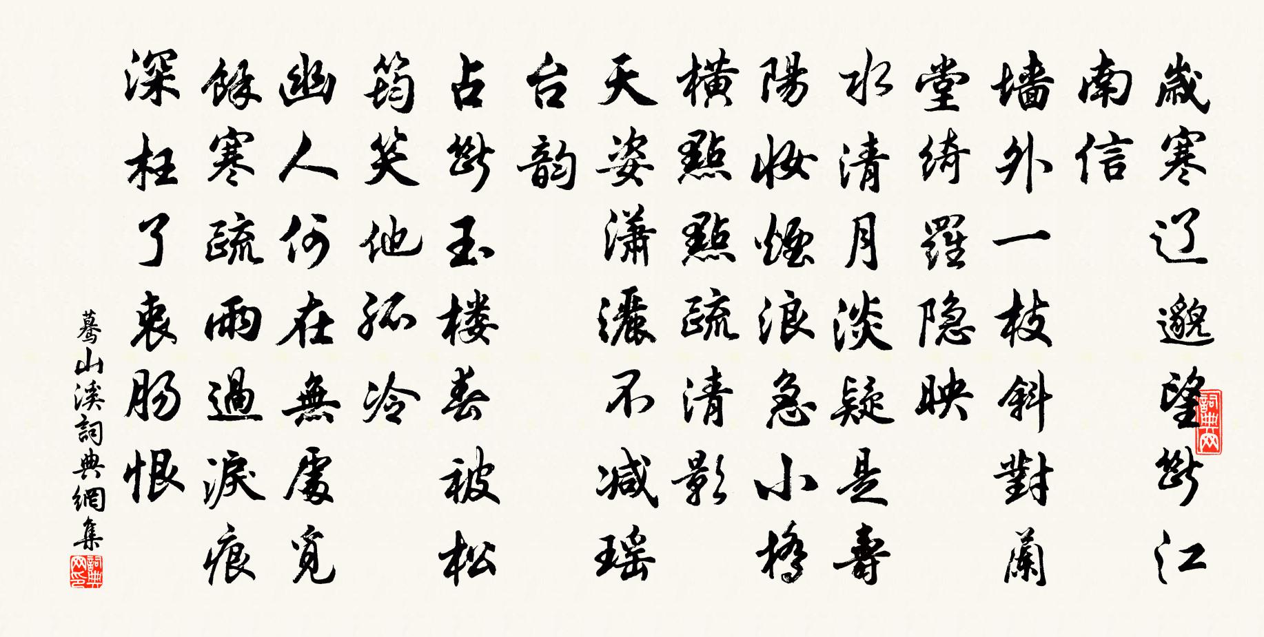 歲寒遼邈,望斷江南信。牆外一枝斜,對蘭堂、綺羅隱映。