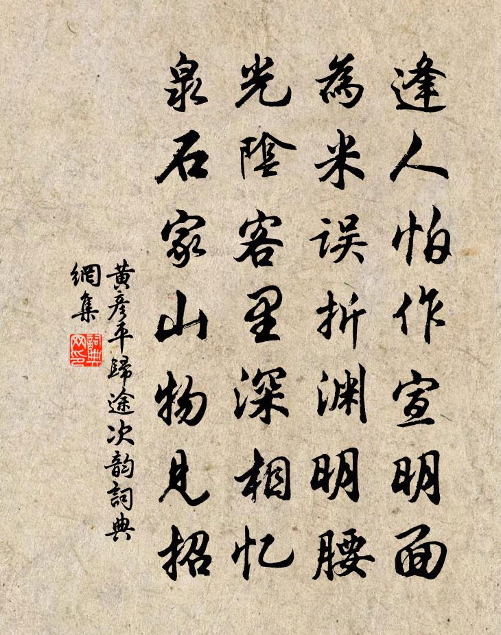 詩詞名句歷史字典書法欣賞書法字典國語詞典說文解字康熙字典古漢語字典標 題 作 者 詩 句 歸途次韻作者:黃彥平 朝代:宋代歸途次韻原文逢人怕作宣明面,為米誤折淵明腰。光陰客里深相憶,泉石家山物見招。詩詞問答問:歸途次韻的作者是誰?答:黃彥平問:歸途次韻寫於哪個朝代?答:宋代黃彥平歸途次韻書法欣賞歸途次韻書法作品詩詞推薦偈頌一百二十三首釋祖欽〔宋代〕久雨不晴,浸爛衲僧鼻孔。如何是衲僧鼻孔,浮雲散盡碧天寬,赫赫金盆海里涌。酬本部韋左司顧況〔唐代〕好鳥依佳樹,飛雨灑高城。況與二三子,列坐分兩楹。文雅一何盛,林塘含餘清。府君未歸朝,遊子不待晴。白雲送裴二虬尉永嘉杜甫〔唐代〕孤嶼亭何處?天涯水氣中。故人官就此,絕境與誰同?隱吏逢梅福,游山憶謝公。扁舟吾已具,把釣待秋風。丙午二月十五日以府檄出宿了岩戴表元〔宋代〕衰年慕棲息,役役殊未休。天明發東郭,日晏泊西州。豈其千金軀,為此一餐謀。宿麥青已郁,稚桑黃亦稠。欣然送化主釋崇岳〔宋代〕敗壞多年笤箒樁,等閒拈起定宗綱。這些標格天然別,不比諸方孟八郎。扇子詩李石〔宋代〕一卷赤松橋上老,三杯玉案瓮中仙。騎驢出去知何日,跨鶴歸來得幾年。暮春遊火星岩同尹瞻聯句柳拱辰〔宋代〕千里熙醇政,靈岩喜訪尋。登臨雲擁座,穿徑筍成林。樂逐天風遠,塵隨宿霧沈。綺羅紅作隊,冠蓋綠交陰。下顧與天池信長老釋正覺〔宋代〕晚歲叢林鬧葦麻,可中著眼辨龍蛇。行當五路我能事,坐斷孤峰渠作家。佛法從來如嚼蠟,朋儔此去似團沙。音書偈頌六十八首釋法薰〔宋代〕祖師門下,討甚巴鼻,滿耳春風浩浩地。草木叢林,燈籠露柱,心空及第。汝等諸人,因甚卻來這裹瞌睡。平原郡王南園詩二十一首凌風姜特立〔宋代〕花木樓台錦不如,關門下瞰更凌虛。他時老子如相過,認取東來青犢車。滿庭芳鄭達可〔宋代〕肥綻梅紅,嫩翻荷綠,微涼時起青萍。人間福艾,都屬老人星。累建高牙大纛,循良治、是處彬彬。棠陰里,豐碑野馬趙崇嶓〔宋代〕野馬紛驅馳,競此光一隙。世事若頷髭,朝摘暮還出。惟應壯與老,冉冉如過客。歲寒山上松,稍稍見其實。漁梁嶺禹廟胡仲參〔宋代〕古今陳跡幾興亡,閩嶺何因祀夏王。莫是當年平水日,曾驅魚鱉渡漁梁。題徐衡仲西窗詩編楊萬里〔宋代〕江東詩老有徐郎,語帶江西句子香。秋月春花入牙頰,松風澗水出肝腸。居仁衣缽新分似,吉甫波瀾並取將。嶺表寄高三十五詹事杜甫〔唐代〕安穩高詹事,兵戈久索居。時來如宦達,歲晚莫情疏。天上多鴻雁,池中足鯉魚。相看過半百,不寄一行書。挽劉中遠侍郎史堯弼〔宋代〕精神曾感會,帝念老臣餘。內閣升嚴直,褒章賜命書。同時那得有,回首卻成虛。露電從渠過,吾游自物初。送清素禪者之金華釋重顯〔宋代〕古策風高瓶浪闊,春雲片段分清絕。金盆後夜孤頂寒,去去誰同落殘月。游鼓山鄭應開〔宋代〕兩峰峻上半天開,一水爭奔急雪來。眺遠直疑滄海近,洞靈曲坳湧泉回。慨思南北江山異,更陟嵯峨宇宙恢。眇眇江南五首劉克莊〔宋代〕身是假皇帝,國由內太師。偽朝舊宮殿,歷歷有遺基。偈頌一百二十三首釋祖欽〔宋代〕萬化之源,萬物之母。德被河沙,量包海宇。聖中之聖,主中之主。慶會一時,壽敬千古。以坤自貴,月朗太虛。名句推薦三年不翅,將以長羽翼;不飛不鳴,將以觀民則。雖無飛,飛必沖天;雖無鳴,鳴必驚人。韓非及後人《韓非子·喻老》 微雨眾卉新,一雷驚蟄始。韋應物《觀田家》 昨別今已春,鬢絲生幾縷。韋應物《長安遇馮著》 不可以一時之譽,斷其為君子;不可以一時之謗,斷其為小人。馮夢龍《警世通言·卷四》 葡萄美酒夜光杯,欲飲琵琶馬上催。王翰《涼州詞二首·其一》 應憐屐齒印蒼苔,小扣柴扉久不開。葉紹翁《遊園不值》 野戰格鬥死,敗馬號鳴向天悲。李白《戰城南》 利之所在,雖千仞之山無所不上,深源之下,無所不入焉。管仲《管子·禁藏》 舉觴酹先酒,為我驅憂煩。柳宗元《飲酒》 五更鼓角聲悲壯,三峽星河影動搖。杜甫《閣夜》