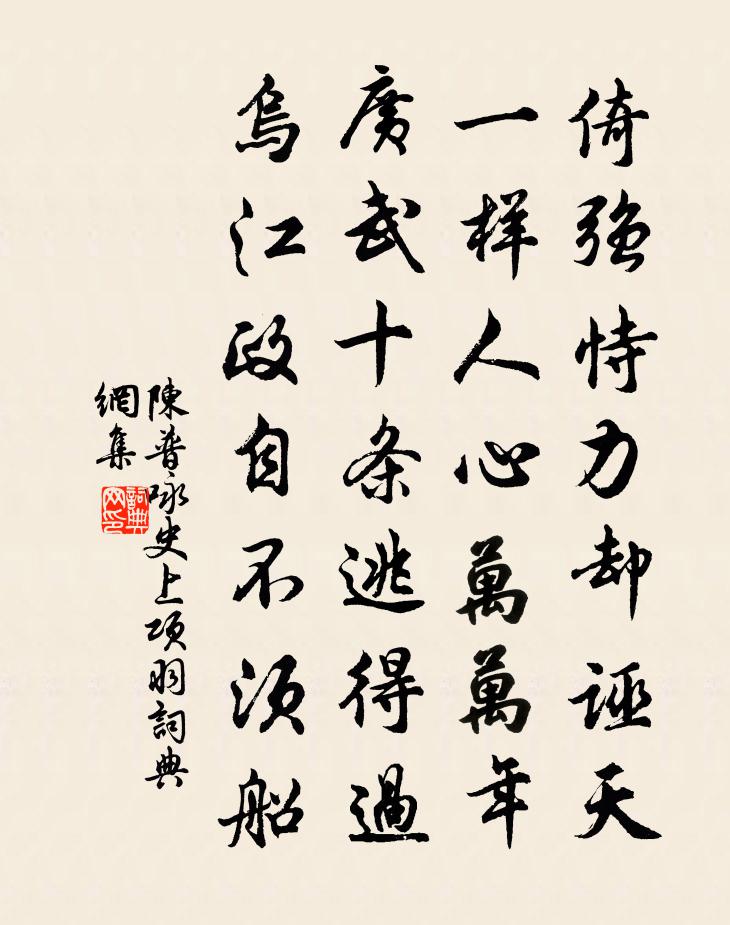 詩詞名句歷史字典書法欣賞書法字典國語詞典說文解字康熙字典古漢語字典標 題 作 者 詩 句 詠史上項羽作者:陳普 朝代:宋代詠史上項羽原文倚強恃力卻誣天,一樣人心萬萬年。廣武十條逃得過,烏江政自不須船。詩詞問答問:詠史上項羽的作者是誰?答:陳普問:詠史上項羽寫於哪個朝代?答:宋代陳普詠史上項羽書法欣賞詠史上項羽書法作品詩詞推薦和林和靖先生梅韻胡銓〔宋代〕紛紛紅紫勿相猜,自古騷人酷嗜梅。皂蓋折花憐老杜,黃梅時雨憶方回。一生耐凍天憐惜,滿世趨炎我獨來。桃李重陽日賜宴曲江亭,賦六韻詩用清字李适〔唐代〕早衣對庭燎,躬化勤意誠。時此萬機暇,適與佳節並。曲池潔寒流,芳菊舒金英。乾坤爽氣滿,台殿秋光清。朝野題玄武禪師屋壁(屋在中江大雄山)杜甫〔唐代〕何年顧虎頭,滿壁畫瀛州。赤日石林氣,青天江海流。錫飛常近鶴,杯度不驚鷗。似得廬山路,真隨惠遠遊。朱昭父挽些王柏〔宋代〕春風初開兮別君南浦,誄君輁軸兮冬又暮。曾歲律之未改兮生死異路,吁嗟乎實齋兮有前修之風度。瑟瑟僩僩兮凝祝英台近(賦攬秀園)周密〔宋代〕步玲瓏,尋窈窕,瑤草四時碧。小小蓬萊,花氣透簾隙。幾回翠水荷初,蒼崖梅小,綺寮掩、玉壺春色。柳屏窄。句趙師秀〔宋代〕石畔長來枝易老,竹間瘦得萼全清。題東華觀王建〔唐代〕路盡煙水外,院門題上清。鶴雛靈解語,瓊葉軟無聲。白髮道心熟,黃衣仙骨輕。寂寥虛境裡,何處覓長生。春光好張元乾〔宋代〕疏雨洗,細風吹。淡黃時。不分小亭芳草綠,映檐低。樓下十二層梯。日長影里鶯啼。倚遍闌乾看盡柳,憶腰肢。仁風李著作園醉後寄李十元稹〔唐代〕朧明春月照花枝,花下音聲是管兒。卻笑西京李員外,五更騎馬趁朝時。題雲間閣趙希濬〔宋代〕昔年嚴大夫,偶來怨遷謫。我本麋鹿姿,得此已自適。乘閒陟上方,□尋唐人石。豈期當三仗,一天雲四冪。快哉宿柴城陳師道〔宋代〕臥埋塵葉走風煙,齒豁頭童不記年。起倒不供聊應俗,高低莫可只隨緣。鼕鼕鼓遠三行夜,隱隱平湖四接天。枕底偈頌八十七首釋慧開〔宋代〕稽首老瞿曇,擔頭人鬧藍。米香三拜了,天上與人間。偈頌七十一首釋了惠〔宋代〕生於穢土,不受點污。目顧四方,周行七步。看來步步計便宜,落水也要占乾處。秋日閒居二首潘璵〔宋代〕詩困權時臥竹窗,夢閒隨雁到衡陽。覺來落日窺簾影,茶鼎松風潑鼻香。已醜正月二十四日避地鹽楹入省坑存思庵和舊舒岳祥〔宋代〕雪蕻羊白,菘芽栗肉黃。為誰端有此,正爾未能忘。覺後心無慍,修來面有光。道人參妙趣,一炷石爐香。春晚三客同出郊歸途甚醉潘獻可〔宋代〕尋友逢三益,追歡且一時。買魚呼野艇,沽酒認村旗。暫覺行歌樂,何妨醉舞僛。牧兒休駭愕,橫笛且須吹。寄夏文州左藏佾文同〔宋代〕翩翩貴公子,佳譽本能文。大第辭京輦,高旌擁塞雲。勸農唐刺史,養士漢將軍。莫刻和戎誓,朝廷立功勳。送長沙陳太守二首李白〔唐代〕長沙陳太守,逸氣凌青松。英主賜五馬,本是天池龍。湘水回九曲,衡山望五峰。榮君按節去,不及遠相從。七郡菩薩蠻(侄壽伯)王紹〔宋代〕天正朔旦開新曆。吾家伯父長生日。蘭玉傍庭階。稱觴特地來。後年逢七十。今歲瞻南極。南極壽星宮。分明矍鑠失調名王琪〔宋代〕金斗熨秋江。名句推薦一時寵利有盡,千秋青史難欺。張廷玉《明史·列傳·卷一百三十三》 齊唱憲王春樂府,金梁橋外月如霜。李夢陽《汴京元夕》 日落君山雲氣,春到沅湘草木,遠思渺難收。張孝祥《水調歌頭·過岳陽樓作》 不系雕鞍門前柳,玉容寂寞見花羞,冷風兒吹雨黃昏後。喬吉《春閨怨·不系雕鞍門前柳》 石溪久住思端午,館驛樓前看發機。盧肇《競渡詩 / 及第後江寧觀競渡寄袁州剌史成應元》 君王遊樂萬機輕,一曲霓裳四海兵。李約《過華清宮》 客自長安來,還歸長安去。李白《金鄉送韋八之西京》 秋霜切玉劍,落日明珠袍李白《白馬篇》 蝴蝶不傳千里夢,子規叫斷三更月。辛棄疾《滿江紅·點火櫻桃》 復恐匆匆說不盡,行人臨發又開封。張籍《秋思》