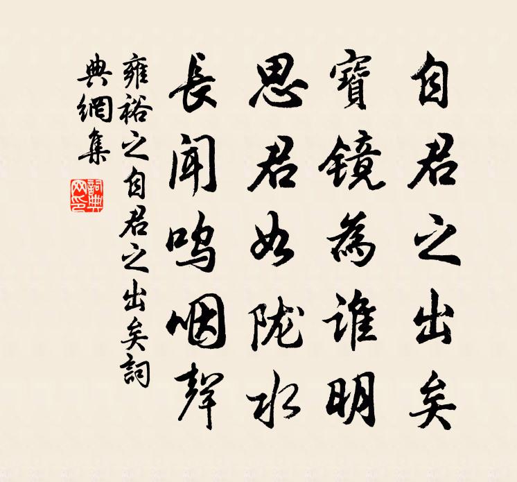 《自君之出矣》是樂府舊題,題名取自東漢末年徐幹《室思》詩句,《室思》第三章:“自君之出矣,明鏡暗不治。思君如流水,無有窮已時。”自六朝至唐代,擬作者不少,如南朝宋時的劉裕、劉義恭、顏師伯,陳朝陳後主,隋代陳叔達等,均有擬作,唐代作者尤多,見於宋代郭茂倩《樂府詩集》。這些擬作,不僅題名取自徐幹的詩,技法也仿照徐幹的詩。雍裕之這首詩(《吟窗雜錄》載辛弘智《自君之出矣》與此詩相同,並收入《全唐詩》),模仿的痕跡尤為明顯。這首詩表現了思婦對外出未歸的丈夫的深切懷念,其手法高明之處在於立意委婉,設喻巧妙,所以含蓄有味。
