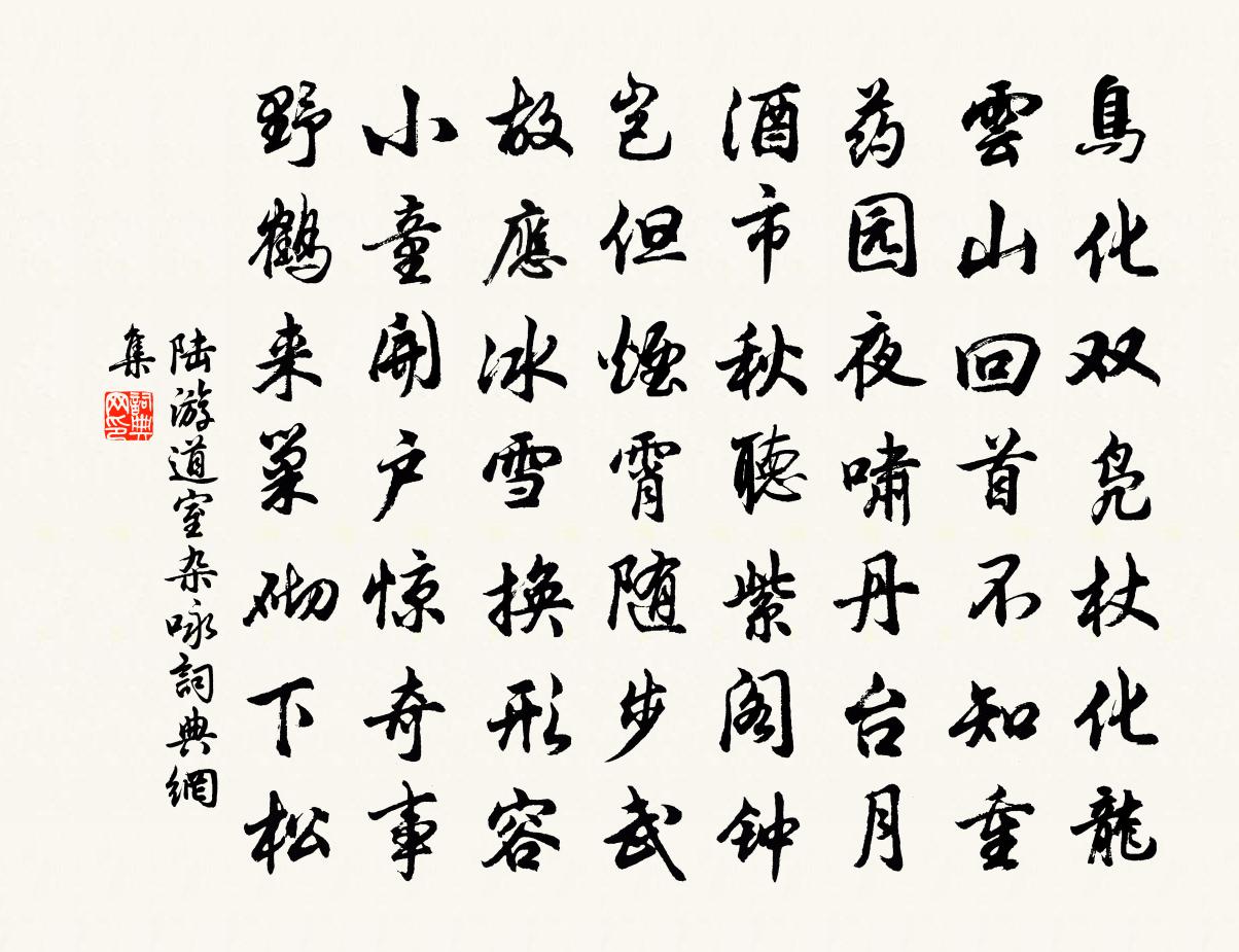 詩詞名句歷史字典書法欣賞書法字典國語詞典說文解字康熙字典古漢語字典標 題 作 者 詩 句 道室雜詠作者:陸游 朝代:宋代道室雜詠原文鳥化雙鳧杖化龍,雲山回首不知重。藥園夜嘯丹台月,酒市秋聽紫閣鍾。豈但煙霄隨步武,故應冰雪換形容。小童開戶驚奇事,野鶴來巢砌下松。詩詞問答問:道室雜詠的作者是誰?答:陸游問:道室雜詠寫於哪個朝代?答:宋代問:陸游的名句有哪些?答:陸游名句大全陸游道室雜詠書法欣賞道室雜詠書法作品詩詞推薦縱筆陸游〔宋代〕未說無功爵位叨,昔人所畏在功高。印如斗大寧常保,劍拄頤長秪自勞。酒社極知身可隱,獵場猶得氣差豪。世間夜宴安樂公主宅盧藏用〔唐代〕侯家主第一時新,上席華年不惜春。珠釭綴日那知夜,玉斝流霞畏底晨。比日風雨甚異山下人云此六月龍會時也中頂有晁說之〔宋代〕西峰掩映東峰明,倏忽起滅令人驚。九野雨足龍上征,六月正乃會琀珩。雷電斷絕風來輕,鼓倡鼙和鈴簫笙。虹霓春晚陸游〔宋代〕客夢初回夜漏殘,東村想見杏花繁。未能便逐啼鴉起,自掩屏風護曉寒。湖上陳允平〔宋代〕流水斷橋邊,笙歌擁畫船。日酣花半醉,春困柳三眠。策杖登雲洞,觀魚上玉泉。鳳城歸去晚,山鎖萬重煙。周五聲調曲 羽調曲 五庾信〔南北朝〕太上之有立德。其次之謂立言。樹善滋於務本。除惡窮於塞源。沖深其智則厚。昭明其道乃尊。仁義之財不匱。忠石通直輓詞樓鑰〔宋代〕籍甚新昌族,直成萬石家。源流端有自,悃愊更無華。奉職冰同潔,持身璧不瑕。慶門傳未艾,蘭玉茁新芽。湘江夜泛熊孺登〔唐代〕江流如箭月如弓,行盡三湘數夜中。無那子規知向蜀,一聲聲似怨春風。題汪水雲詩卷十首胡斗南〔宋代〕篋里新詩意不傳,飄蓬白髮地行仙。江南江北都看了,更往西湖一百年。閏正月十五日夜監直對月懷諸同舍司馬光〔宋代〕霧淨金波溢,天開碧幕空。夜寒雖料峭,春意自沖融。熠熠枝上露,攸攸竹杪風。暫還林野興,不似畜樊龍。送程給事越州范育〔宋代〕雍容青瑣漢儒臣,出牧東南七郡民。秘府內分龍節貴,故鄉朝看錦衣新。湖山動色迎詩老,牛酒均歡慰路人。豈愧賦新月繆氏子〔唐代〕初月如弓未上弦,分明掛在碧霄邊。時人莫道蛾眉小,三五團圓照滿天。挽如老歸真李昴英〔宋代〕不見才三日,喧傳已坐亡。平生功生到,垂絕偈言香。緣分無高剎,禪名卻四方。開包殘藁在,切勿放毫光。下樓李益〔唐代〕話舊全應老,逢春喜又悲。看花行拭淚,倍覺下樓遲。寒食張耒〔宋代〕風雲雖不定,日雨亦易乾。殘春猶凜凜,助我朝食寒。想見芳野田,士女游班班。去者日以疏,更為來者歡。青紅題彭紹墨唐士恥〔宋代〕彭紹之墨玄又玄,問誰得法托之仙。凌煙膠漆有三昧,魯直之什曹洞禪。我欲大振獅子吼,直恐驚翻龍象筵。紛紛謝翟元卿詩卷見投陳造〔宋代〕從君只比羊胛熟,得詩已可牛腰束。誰言此老四壁立,襞積錦繡羅群玉。晨興諷誦暮編綴,未覺飢雷隱枵腹。我生釣台石孝友〔宋代〕桐江波上一羊裘,釣得聲名隘九州。天子曷嘗遺故舊,先生不肯事王侯。夏月山中聞鶯姜特立〔宋代〕深山五六月,猶自有鶯簧。吸滿幽人聽,何如入建章。送陸侍御歸淮南使府五韻劉禹錫〔唐代〕江左重詩篇,陸生名久傳。鳳城來已熟,羊酪不嫌膻。歸路芙蓉府,離堂玳瑁筵。泰山呈臘雪,隋柳布新年。曾忝名句推薦壽酒還嘗藥,晨餐不薦魚。錢起《送外甥懷素上人歸鄉侍奉》 天寒水鳥自相依,十百為群戲落暉。秦觀《還自廣陵》 鐘山抱金陵,霸氣昔騰發。李白《登梅岡望金陵贈族侄高座寺僧中孚》 事親孝,與士信,臨財廉,取予義,分別有讓,恭儉下人,常思奮不顧身以徇國家之急。班固《漢書·傳·司馬遷傳》 飛流直下三千尺,疑是銀河落九天。李白《望廬山瀑布》 柳柔搖不定,草短綠應難。張惠言《風流子·出關見桃花》 故人離別盡,淇上轉驂騑。王維《送魏郡李太守赴任》 誰知道,斷煙禁夜,滿城似愁風雨劉辰翁《永遇樂·璧月初晴》 有才必韜藏,如渾金璞玉,暗然而日章也王永彬《圍爐夜話·第十四則》 獨往獨來,獨出獨入,孰能礙之?列子及其弟子《列子·力命》