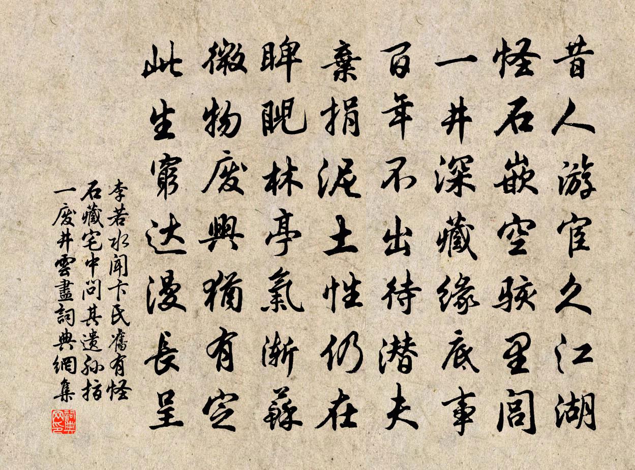 詩詞名句歷史字典書法欣賞書法字典國語詞典說文解字康熙字典古漢語字典標 題 作 者 詩 句 聞卞氏舊有怪石藏宅中問其遺孫指一廢井雲盡作者:李若水 朝代:宋代原文昔人遊宦久江湖,怪石嵌空駭里閭。一井深藏緣底事,百年不出待潛夫。棄捐泥土性仍在,睥睨林亭氣漸蘇。微物廢興猶有定,此生窮達漫長呈。詩詞問答問:《聞卞氏舊有怪石藏宅中問其遺孫指一廢井雲盡》的作者是誰?答:李若水問:該詩寫於哪個朝代?答:宋代書法欣賞聞卞氏舊有怪石藏宅中問其遺孫指一廢井雲盡書法作品詩文賞析【原題】:聞卞氏舊有怪石藏宅中問其遺孫指一廢井雲盡在是矣井在室中床下不可得見乃賦此詩詩詞推薦和陶勸農六首蘇軾〔宋代〕豈無良田,膴膴平陸。獸蹤交締,鳥喙諧穆。驚蹤朝射,猛豨夜逐。芋羹薯糜,以飽耆宿。郡齋暇日憶廬山草堂兼寄二林僧社三十韻多敘…出處之意白居易〔唐代〕諫諍知無補,遷移分所當。不堪匡聖主,只合事空王。龍象投新社,鵷鸞失故行。沉吟辭北闕,誘引向西方。便住夜坐示客張鎡〔宋代〕身世長歌里,於今得好朋。露階秋到竹,風屋夜吹燈。菱芡供饞口。圖書伴曲肱。頭顱知自揣,顧影笑鬅鬙。江城子·中秋早雨晚晴陳著〔宋代〕中秋佳月最端圓。老痴頑。見多番。杯酒相延,今夕不應慳。殘雨如何妨樂事,聲淅淅,點斑斑。天應有意故遮闌臨江仙晏幾道〔宋代〕夢後樓台高鎖,酒醒簾幕低垂。去年春恨卻來時。落花人獨立,微雨燕雙飛。記得小苹初見,兩重心字羅衣。琵琶飲茶喻良能〔宋代〕清風生兩腋,雪乳啜雲團。便擬乘風去,翻嫌縛小官。謁金門盧祖皋〔宋代〕風不定。移去移來簾影。一雨林塘新綠淨。杏梁歸燕並。翠袖玉屏金鏡。日薄綺疏人靜。心事一春疑酒病。鳥啼花貞牟書事陳與義〔宋代〕留侯辟穀年,漢鼎無餘功。子真策不售,脫跡市門中。神仙非異人,由來本英雄。撫世獨餘事,用舍何必同。眷此登蜀阜錢時〔宋代〕丹桂孤芳眾木間,枯枝蠹葉苦間關。古來群枉難為並,培植靈根得等閒。旅中感懷張詠〔宋代〕人世貪名豈是閒,幾回思算幾悽然。故鄉路遠不得信,寒月夜來還復圓。霜趁悲鴻歸楚澤,風移殘燒下秦川。莫言又泛水像贊釋妙倫〔宋代〕覺而動,照而寂。雲淨月明,波停水碧。圓通觸處露全身,依舊腳跟浮逼逼。遇薛明府謁聰上人 [一作孟浩然詩。]王昌齡〔唐代〕欣逢柏梁故,共謁聰公禪。石室無人到,繩床見虎眠。陰崖常抱雪,枯澗為生泉。出處雖雲異,同歡在法筵。閏中秋趙大成〔宋代〕桂影中秋特地圓,況當餘閨魄澄鮮。因懷勝賞初經月,免使詩人歡隔年。萬象斂光增浩蕩,四溟收夜助嬋娟。鮮雲淨明齋方岳〔宋代〕山徑留雲雨未乾,松聲長共澗聲寒。青鞋莫踏蒼苔破,借與秋崖半日看。念奴嬌(席上即事)趙長卿〔宋代〕精神俊雅,更那堪、天與風流標格。羅綺叢中偏艷冶,偷處教人憐惜。目剪秋波,指纖春筍,新樣冠兒直。高堂雲感鏡韋應物〔唐代〕鑄鏡廣陵市,菱花匣中發。夙昔嘗許人,鏡成人已沒。如冰結圓器,類璧無絲髮。形影終不臨,清光殊不歇。一感病後覺衰楊萬里〔宋代〕病著初無惱,安來始覺衰。人誰長健底,老有頓來時。山意淒寒日,秋光染瘦詩。小松能許劣,學我弄吟髭。玉樓春馮時行〔宋代〕杏花微露春猶淺。春淺愁濃愁送遠。山拖餘翠斷行蹤,細雨疏煙迷望眼。暮雲濃處輕吹散。往事時時心上見。不禁秋晚登樓望南江入始興郡路張九齡〔唐代〕潦收性沙衍出,性霜降天宇性晶。伏檻性一長眺,津途多遠情。思來江山外,望盡煙雲生。滔滔不自辨,役役且何句暨氏女〔宋代〕多情樵牧頻簪髻,無主蜂鶯任宿房。名句推薦碧海年年,試問取、冰輪為誰圓缺?納蘭性德《琵琶仙·中秋》 道生一,一生二,二生三,三生萬物。老子《老子·德經·第四十二章》 朝落暮開空自許,竟無人解知心苦晏幾道《蝶戀花·笑艷秋蓮生綠浦》 嘆息聊自思,此生豈我情。王績《石竹詠》 上有流思人,懷舊望歸客。謝朓《送江水曹還遠館》 年年躍馬長安市。客舍似家家似寄。劉克莊《玉樓春·戲林推》 故人宿茅宇,夕鳥栖楊園。李白《之廣陵宿常二南郭幽居》 料因循誤了,殘氈擁雪,故人心眼。張炎《解連環·孤雁》 黃沙百戰穿金甲,不破樓蘭終不還。王昌齡《從軍行七首·其四》 試澆橋下水,今夕到湘中。陳與義《臨江仙·高詠楚詞酬午日》