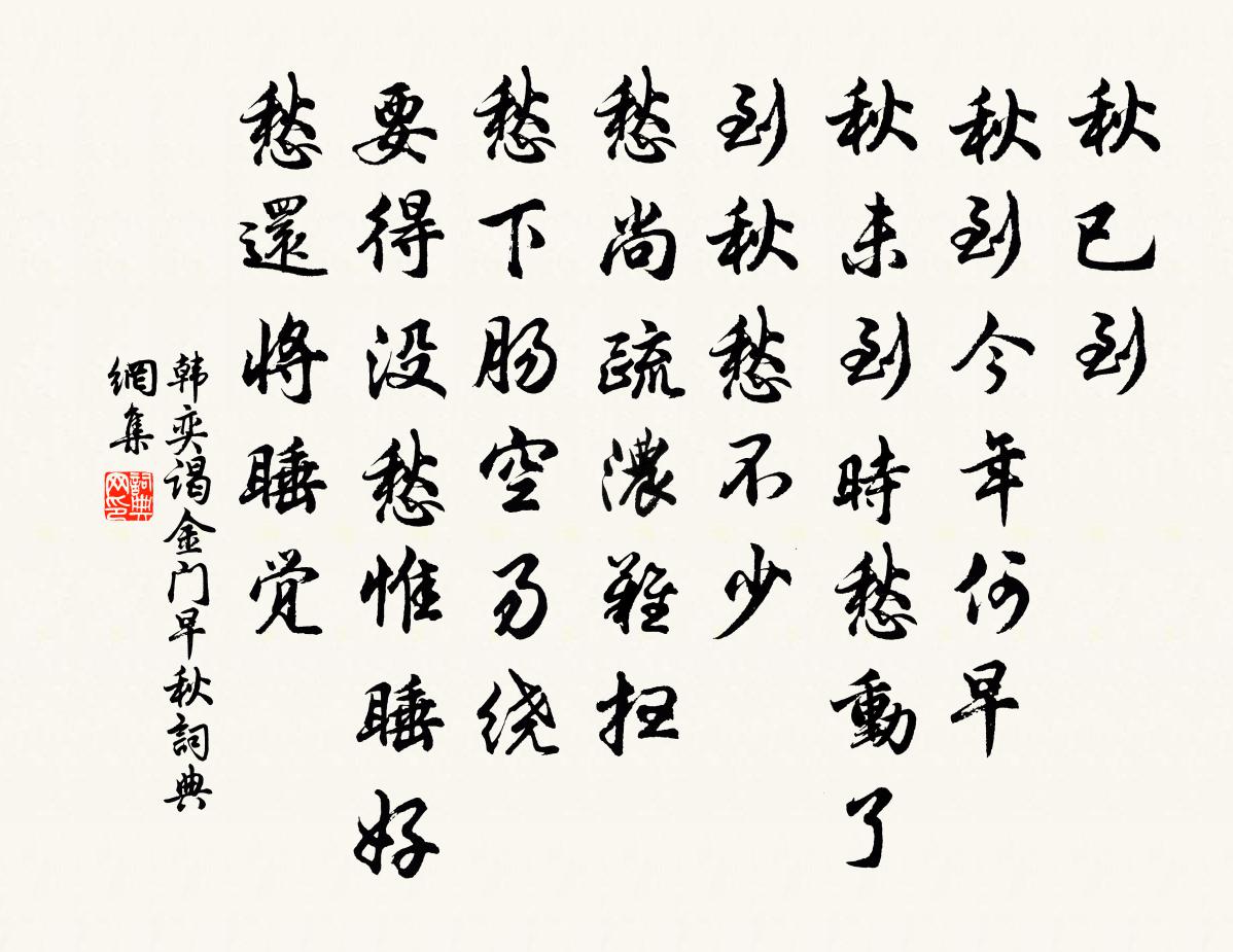 詩詞名句歷史字典書法欣賞書法字典國語詞典說文解字康熙字典古漢語字典標 題 作 者 詩 句 謁金門 早秋作者:韓奕 朝代:元代謁金門 早秋原文秋已到。秋到今年何早。秋未到時愁動了。到秋愁不少。愁尚疏濃難掃。愁下腸空易繞。要得沒愁惟睡好。愁還將睡覺。詩詞問答問:謁金門 早秋的作者是誰?答:韓奕問:謁金門 早秋寫於哪個朝代?答:元代問:謁金門 早秋是什麼體裁?答:詞韓奕謁金門 早秋書法欣賞謁金門 早秋書法作品詩詞推薦次前韻賦隱居二首方回〔宋代〕崑岡玉火脫焚如,萬事灰心此定居。今古真成一夢耳,行藏略算十年余。曾微實譽歌來暮,豈可虛言賦遂初。邂逅長安仲春二首張耒〔宋代〕長安花繁仲春月,北風倒山雨成雪。窮巷下里◇襦盡,老翁稚兒骨欲折。吾人諳事不復驚,以手扣額願天晴。夕陽和章七出守湖州二首蘇軾〔宋代〕絳闕雲台總有名,應須極貴又長生。鼎中龍虎黃金賤,松下龜蛇綠骨輕。霅水未渾纓可濯,弁峰初見眼應明。兩卮宿監中偶作陸游〔宋代〕流落歸來兩鬢絲,此生真媿北山移。數殘宮漏寒無寐,開盡梅花病不知。同舍破甘醒宿酒,故人折簡索新詩。生涯項王廟董天吉〔宋代〕嬴氏亂天紀,群雄各飛揚。子羽勇無敵,拔劍起戎行。熊罷八千士,飈舉度長江。威名震列國,斬嬰爇鹹陽。神力漁家傲(送張教)佚名〔宋代〕病枕逢驚曉鼓。那堪送客江頭路。莫唱驪駒催客去。風又雨。花飛一片愁千縷。折柳悽然無勝語。加餐更把篝衣護贈牛仲容祖無擇〔宋代〕吾君旰食念邊陲,天下英雄待聘時。仁義未行真處士,功名不立豈田兒。臥友誰識南陽隱,失馬何勞北叟悲。莫向送陳太初道錄秦觀〔宋代〕先生簪紱後,世系本綿瓜。駐馬生枯骨,回車濟病蛇。帶雲眠酒市,和月醉漁家。落日千山路,西風一枕霞。幾年馬上逢雪宋祁〔宋代〕馬上逢飛雪,都城觸望新。天如不擬暝,樹欲頓成春。霰急初鳴瓦,塗輕自壓塵。灑逵先映璐,飄闕欲藏銀。宛轉依韻和希深遊樂園懷主人登封令梅堯臣〔宋代〕竹映紅蕖水榭開,門閒乳雀下青苔。伊人何戀五斗粟,不作淵明歸去來。晚來姜特立〔宋代〕晚來山氣冷,松下獨閒行。野鳥聽人語,山靈警杖聲。春暮佚名〔宋代〕燕子樓台人寂寂,榴花庭院日熙熙。枝頭添翠鶯先覺,葉底銷紅蝶未知。同永叔子聰游嵩山賦十二題其七天門梅堯臣〔宋代〕古壁何蒼蒼,穿雲玉梯出。欻然起青冥,卻立觀少室。前岩復後峰,陰晴狀非一。憲使范右司具饌屬屬官為主人又屬衡陽張宰助曾豐〔宋代〕湘水前縈帶,蒸江後引裾。中容齊塔阜,上建讀帶廬。氣象河汾上,規模景佑余。帝王無異學,孔孟有遺帶。絳帳望安南海口陶弼〔宋代〕喜逢晴日破陰霾,望極西南瘴海涯。夷狄古今常反覆,朝廷終始務綏懷。何時良將收銅柱,不日孱王棄{上艹下膏水龍吟(酴醿·春景)趙長卿〔宋代〕韶華迤邐三春暮。飛盡繁紅無數。多情為與,牡丹長約,年年為主。曉露凝香,柔條千里,輕盈清素。最堪憐,玉鷓鴣天·嫩綠重重看得成范成大〔宋代〕嫩綠重重看得成。曲闌幽檻小紅英。酴醿架上蜂兒鬧,楊柳行間燕子輕。春婉娩,客飄零。殘花淺酒片時清。一杯送友人南遊劉長卿〔唐代〕不愁尋水遠,自愛逐連山。雖在春風裡,猶從芳草間。去程何用計,勝事且相關。旅逸同群鳥,悠悠往復還。鶴林吳尚書輓詩二首高斯得〔宋代〕珠緯躔奎後,坤文世載英。奇才冠元佑,大手擅端平。時事雖難並,詞華略與京。自從雙鳥寂,禁柳謾嚶鳴。偈頌四十一首釋普寧〔宋代〕沒弦琴,指趣深。尖新曲調,須遇知音。高山流水無窮意,落落斷崖千萬尋。名句推薦是親不是親,非親卻是親。佚名《增廣賢文·上集》 滿紙荒唐言,一把辛酸淚!曹雪芹《紅樓夢·第一回》 高風吹玉柱,萬籟忽齊飄司空曙《風箏》 力田已告成,計日宜收藏。黃燮清《秋日田家雜詠》 看破的,遁入空門;痴迷的,枉送了性命。曹雪芹《紅樓夢·第五回》 南浦春來綠一川,石橋朱塔兩依然。范成大《橫塘·南浦春來綠一川》 最無端處,總把良宵,只恁孤眠卻。柳永《尾犯·夜雨滴空階》 惟將終夜常開眼,報答平生未展眉。元稹《遣悲懷三首·其三》 開到荼蘼花事了。曹雪芹《紅樓夢·第六十三回》 諸君才絕世,獨步許誰強妙信《九日酬諸子》