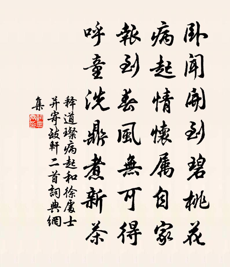 詩詞名句歷史字典書法欣賞書法字典國語詞典說文解字康熙字典古漢語字典標 題 作 者 詩 句 病起和徐處士並寄致軒二首作者:釋道璨 朝代:宋代病起和徐處士並寄致軒二首原文臥聞開到碧桃花,病起情懷屬自家。報到春風無可得,呼童洗鼎煮新茶。詩詞問答問:病起和徐處士並寄致軒二首的作者是誰?答:釋道璨問:病起和徐處士並寄致軒二首寫於哪個朝代?答:宋代釋道璨病起和徐處士並寄致軒二首書法欣賞病起和徐處士並寄致軒二首書法作品詩詞推薦對酒陸游〔宋代〕酒非攻愁具,本賴以適意。如接名勝游,所挹在風味。庸子墮世紛,但欲蘄一醉。麴生絕俗人,笑汝非真契。對鏡吟長孫佐輔〔唐代〕憶昔逢君新納娉,青銅鑄出千年鏡。意憐光彩固無瑕,義比恩情永相映。每將鑒面兼鑒心,鑒來不輟情逾深。君非艾如張曹勛〔宋代〕鴻鵠遠罾繳,燕雀戀藩籬。爭食蓬蒿下,觸綱斃禍機。黃雀老且黠,黃口小且痴。黃雀戒黃口,輙莫貪腥肥。客自茂來言元禮日觀棋劇飲宋祁〔宋代〕寒山倒影入樓扉,鈴唱愔愔少諍辭。左手持螯人嗜飲。一斑窺豹客爭棋。萍游倦斝傷酲夕,星落殘枰斗劫遲。日日寄贈小樊劉禹錫〔唐代〕花面丫頭十三四,春來綽約向人時。終須買取名春草,處處將行步步隨。萬年春 玉瑣金關互換封閉王吉昌〔元代〕玉瑣金關,陰陽擊拆牢封閉。相凝制。變通無系。滿腹清風細。九氣天中,雲步無纖翳。真根蒂。道情潛契。湛湛熙寧望祭岳鎮海瀆十七首佚名〔宋代〕高廣融結,實維中央。宣氣報功,利彼一方。坎壇以祀,六樂鏘鏘。靈其有喜,酌以大璋。夜坐因觀楊伯虎和春字韻詩偶成五絕再寄張鎡〔宋代〕往事追思重慘傷,相從常醉德勛堂。每登屺岵數鴻雁,老淚風前必數行。春風四首白玉蟾〔宋代〕燕燕于飛引蝶狂,嬌鶯歌懶笑蜂忙。庭前萱草台前竹,也學春風舞綠楊。余將南歸燕趙諸公子攜妓把酒錢別醉中作把酒汪元量〔宋代〕君把酒,聽我歌。君不見陌上桑,鶉奔奔兮鵲疆疆。高堂今夕燈燭光,燕姝趙女吹笙簧。君把酒,聽我歌。美人美寄沛縣梁子高石介〔宋代〕南海怒蛟三尺角,埋藏水底嘆吟呻。明時直道難乾祿,白首躬耕力養親。醉讀兵韜鬥龍豹,閒抽寶劍舞星辰。茅齋鷓鴣天佚名〔宋代〕絳蠟銀台晃繡幃。一簾香霧擁金猊。人間歡會于飛宴,天上佳期乞巧時。傾合卺,醉淋漓。同心結了倍相宜。從今浣溪沙·半踏長裾宛約行孫光憲〔唐代〕半踏長裾宛約行,晚簾疏處見分明,此時堪恨昧平生。早是銷魂殘燭影,更愁聞著品弦聲,杳無訊息若為情。讀書至夜半燈盡欲睡慨然有感陸游〔宋代〕白髮蕭蕭老空谷,人嘆厄窮心自足。東郊曉射墮錦雉,北崦春耕叱黃犢。區區世事何足論,未死斷知常閉門。關河宋江三十六贊龔開〔宋代〕風有大小,不辨雌雄。山谷之中,遇爾亦凶。鳳凰閣佚名〔宋代〕遍園林綠暗,渾如翠幄。下無一片是花萼。可恨狂風橫雨,忒煞情薄。盡底把、韶華送卻。楊花無奈,是處穿簾透車遙遙篇范成大〔宋代〕車遙遙,馬憧憧。君游東山東復東,安得奮飛逐西風。願我如星君如月,夜夜流光相皎潔。月暫晦,星常明。留明和孫守三月二十七日開宴毛滂〔宋代〕繡段遮檐玉刻樽,揚州春色最先醺。落花風起舞菌捲,秀嶺煙生媚黛分。酥面錦靴輕轉雪,粉吭牙板細留雲。要他苦寒二首張耒〔宋代〕山城新炭賤於土,老翁守壚朝復暮。時傾牆下一杯酒,不怕檐前三尺雨。共言麥好歲當熟,里巷往來聞好語。老大丙子仲冬紫閣寺聊句蘇舜元〔宋代〕白石太古水,蒼厓六月冰。昏明咫尺變,身世逗留增。橋與飛霞亂,人間獨鳥升。風泉冷相搏,樓閣暮逾澄。反覆名句推薦海畔風吹凍泥裂,枯桐葉落枝梢折。陳羽《從軍行》 黑髮不知勤學早,轉眼便是白頭翁。佚名《增廣賢文·上集》 松樹千年終是朽,槿花一日自為榮。白居易《放言五首·其五》 人閒桂花落,夜靜春山空。王維《鳥鳴澗》 眺聽良多感,徙倚獨沾襟。李密《淮陽感秋》 百畝庭中半是苔,桃花淨盡菜花開。劉禹錫《再游玄都觀》 欲訴奇愁無可訴,算興亡、已慣司空見。梁啓超《金縷曲·丁未五月歸國旋復東渡卻寄滬上諸君子》 憶共人人睡魂蝶亂,夢鸞孤。趙長卿《更漏子·燭消紅》 駐馬橋西,還系舊時芳樹。高觀國《玲瓏四犯·水外輕陰》 今年游寓獨游秦,愁思看春不當春。杜審言《春日京中有懷》