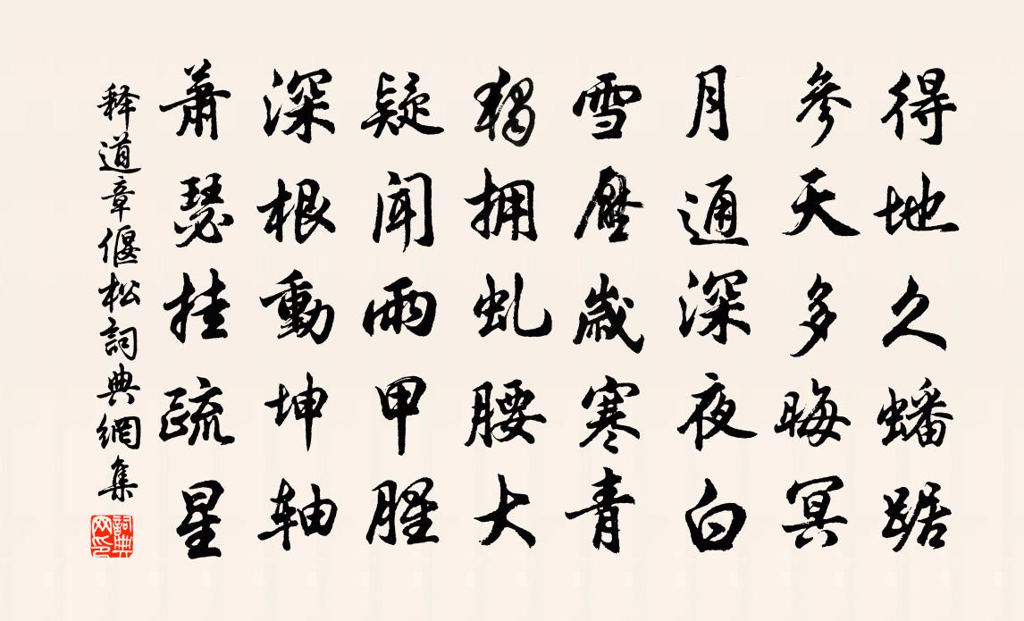 詩詞名句歷史字典書法欣賞書法字典國語詞典說文解字康熙字典古漢語字典標 題 作 者 詩 句 偃松作者:釋道章 朝代:宋代偃松原文得地久蟠踞,參天多晦冥。月通深夜白,雪壓歲寒青。獨擁虬腰大,疑聞雨甲腥。深根動坤軸,蕭瑟掛疏星。詩詞問答問:偃松的作者是誰?答:釋道章問:偃松寫於哪個朝代?答:宋代釋道章偃松書法欣賞偃松書法作品詩詞推薦春日田園雜興十首陳舜道〔宋代〕春來非是愛吟詩,詩是田園樂與時。清入吟懷花月照,紅生笑面柳風吹。村聲盪耳鳥監角,社酒柔情玉練槌。閒悶挽劉大監思恭度正〔宋代〕一門金玉友,仲也更高明。天粹仁幾熟,心融義亦精。有懷殊未究,所論略施行。握手悲無日,臨風涕泗橫。句王化基〔宋代〕美璞未成終是寶,精鋼寧折不為鉤。早作裘萬頃〔宋代〕雨過長江浪拍城,迢迢羲馭水中行。舟人指點雲開處,喜見青山一抹橫。宣召看紅木犀賜宴索詩並謝恩曹勛〔宋代〕九霞深借曉光披,粟粟輕紅蔭碧枝。不逐秋香勻菊艷,要烘花色並彤墀。涼雲收雨頒慈惠,寶幄中天拜宴私。折得秋日江亭趙湘〔唐代〕遠岸鳴蟬未擬休,蟬邊風葉動颼飀。平沙露白聊宜鶴,孤島分青獨映秋。野色半侵涼氣濕,水光低引夕陽流。題詩冬日金陵制幕書事王同祖〔宋代〕督制堂常兩重臣,駐師移府夾江濱。資糧扉屨多多辦,更有舟車乞與鄰。送何白節推宰晉原二首范仲淹〔宋代〕此行深惜別,所喜是寧親。祖帳千門曉,鄉關錦國春。鳥歌疑勸酒,山態似迎人。我絕南陔望,因兄淚滿巾。建隆郊祀八首竇儼〔宋代〕步武舒遲,陞壇肅祗。其容允若,於禮攸宜。題白蘋洲杜牧〔唐代〕山鳥飛紅帶,亭薇拆紫花。溪光初透徹,秋色正清華。靜處知生樂,喧中見死夸。無多珪組累,終不負煙霞。於眉州輓詩魏了翁〔宋代〕士為謀身蛇有足,人於囂論鼠無牙。獄書一落於公手,不識從來豪大家。梅花陳紀〔宋代〕冰霜骨格玉精神,索笑巡檐不厭頻。清瘦絕如人有韻,品題除是筆無塵。一枝影裹溪山晚,萬斛香中天地春。幾度懷趙蘄州文鼎趙蕃〔宋代〕吾州憶當南渡初,居有曾呂守則徐。本門林下亦此渠,往往詩流非酒徒。邇來流風頗寂寞,南池二公了不惡。李今浣溪沙黃機〔宋代〕墨綠衫兒窄窄裁。翠荷斜領雲堆。幾時蹤跡下陽台。歌罷櫻桃和露小,舞餘楊柳趁風回。喚人休訴十分杯。梢雲曹松〔唐代〕殊質資靈貺,陵空發瑞雲。梢梢含樹影,鬱郁動霞文。不比因風起,全非觸石分。葉光閒泛灩,枝彩靜氛氳。隱見送別魏校書借參預李先生韻程公許〔宋代〕搔首暮雲碧,懷人酒淺斟。斟鍾心不動,九鼎力能任。夜雨青綾直,人風紫禁深。愛群須引煩,一念帝來臨。伯量同二弟欲見訪湖莊以詩告至褒拂過情輒次曹彥約〔宋代〕年來奪錦馬群空,而況君家有八龍。傳與鄉人經濟策,問焉何惜少舂容。句趙崇嶓〔宋代〕鷺依江渚冷,雁入楚雲深。臨江仙(丙寅生日自作)郭應祥〔宋代〕老子開年年五十,依前恁地痴頑。昨非今是有無間。惟慚新赤紱,不稱舊蒼顏。休羨長年並極富,休貪寶帶腰環。再次韻計教授李石〔宋代〕糟丘盡醉國人狂,誰似東家禮義鄉。萬卷短檠磨歲月,一生寒硯敵水霜。飯牛坐待扶桑白,戰馬初歸塞草黃。奏牘名句推薦翻空白鳥時時見,照水紅蕖細細香。蘇軾《鷓鴣天·林斷山明竹隱牆》 教人無處寄相思,落花芳草過前期,沒人知。孫光憲《虞美人·好風微揭簾旌起》 悠悠天宇曠,切切故鄉情。張九齡《西江夜行》 莫笑賤貧夸富貴,共成枯骨兩何如?白居易《放言五首·其四》 故人在其下,塵土相豗蹴。蘇軾《送頓起》 但憑闌無語,煙花三月春愁。鄭覺齊《揚州慢·瓊花》 花谷依然,秀靨偷春小桃李。吳文英《荔枝香近·送人游南徐》 秋雨一何碧,山色倚晴空。方岳《水調歌頭·平山堂用東坡韻》 為其所難者,必得其所欲焉;未聞為其所欲,而免其所惡者也。墨子《墨子·01章 親士》 十年磨一劍,霜刃未曾試。賈島《劍客 / 述劍》